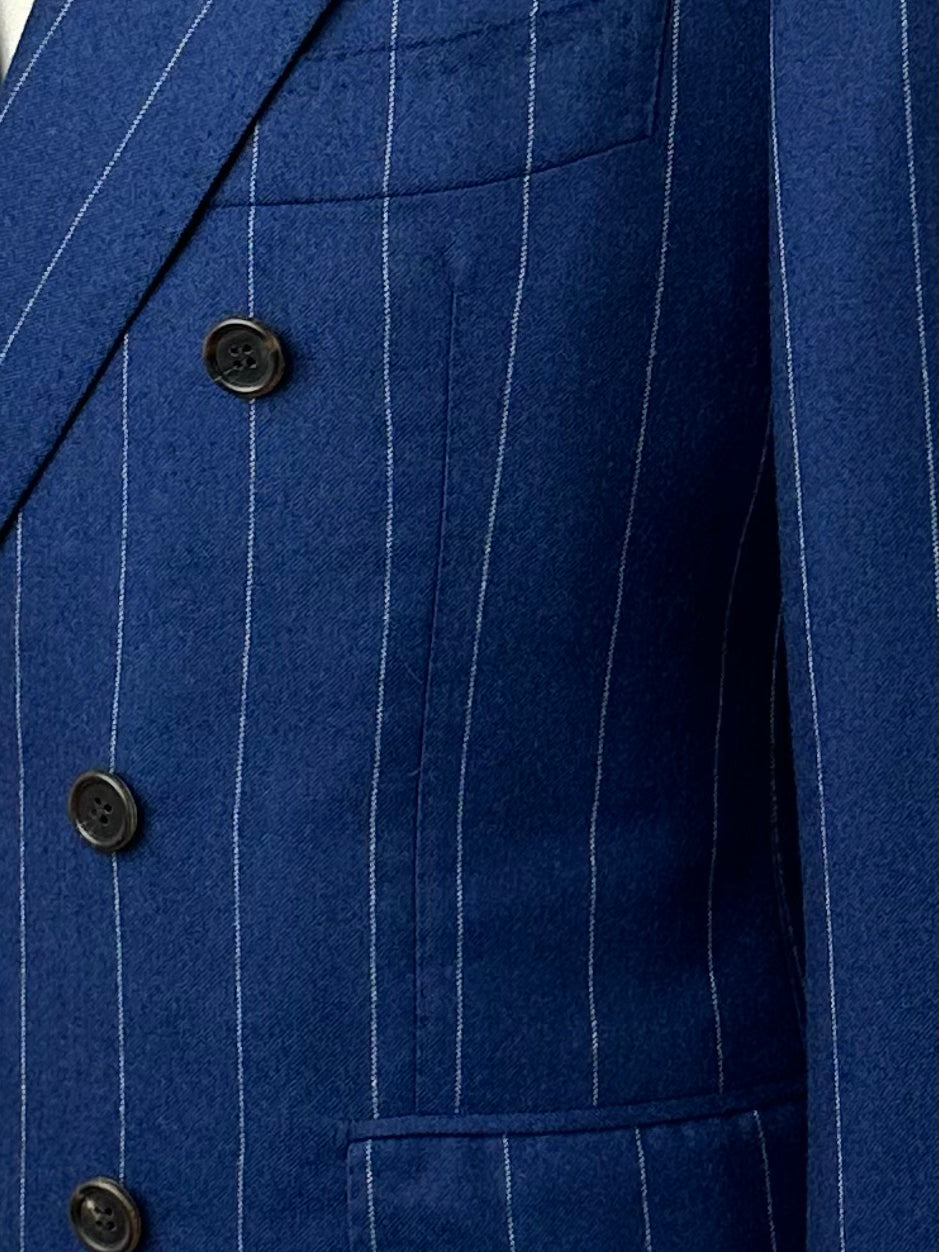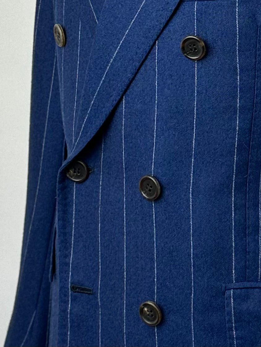 Koningsblauw double-breasted pak van zachte flanellen wol met een krijtstreeppatroon en brede puntrevers. De formele look met de eclectische inslag belichaamt het dandyisme op zijn best - de kleermaker staat bekend om de moderne interpretatie van de Napolitaanse sectie. Het mannelijke silhouet is vakkundig uitgewerkt. De schouders worden perfect geaccentueerd, de taille flatterend geaccentueerd en de broek op perfecte lengte gebracht. Ontdek hieronder de uitgewerkte kleermakersdetails.