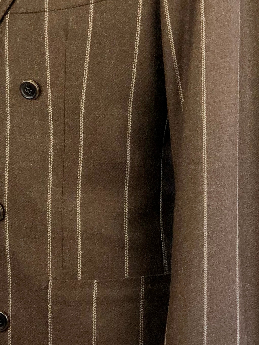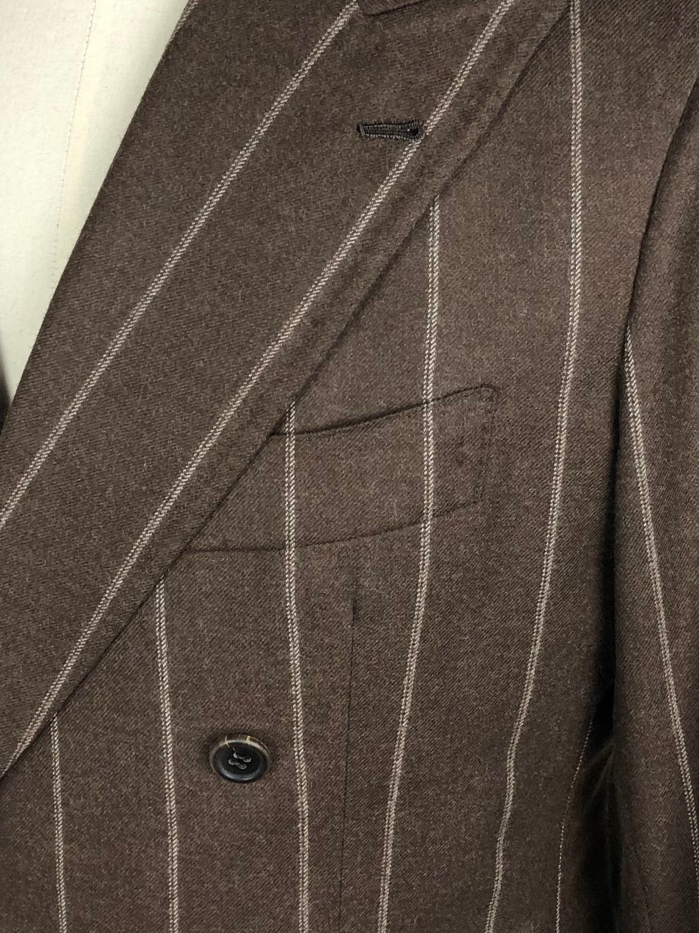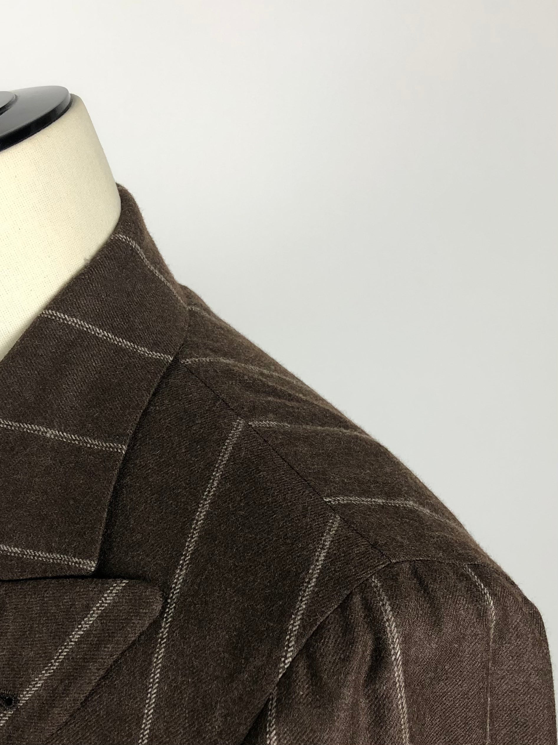Chocoladebruin double-breasted pak van zachte flanellen wol van Loro Piana met een krijtstreeppatroon en brede puntrevers. De formele look met de eclectische inslag belichaamt het dandyisme op zijn best - de kleermaker staat bekend om de moderne interpretatie van de Napolitaanse sectie. Het mannelijke silhouet is vakkundig uitgewerkt. De schouders worden perfect geaccentueerd, de taille flatterend geaccentueerd en de broek op perfecte lengte gebracht. Ontdek hieronder de uitgewerkte kleermakersdetails.