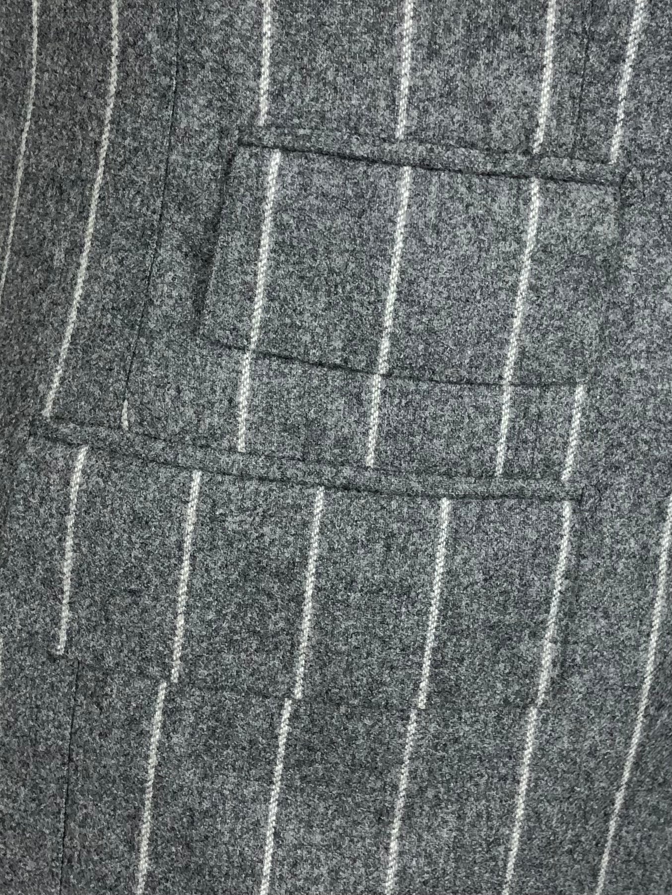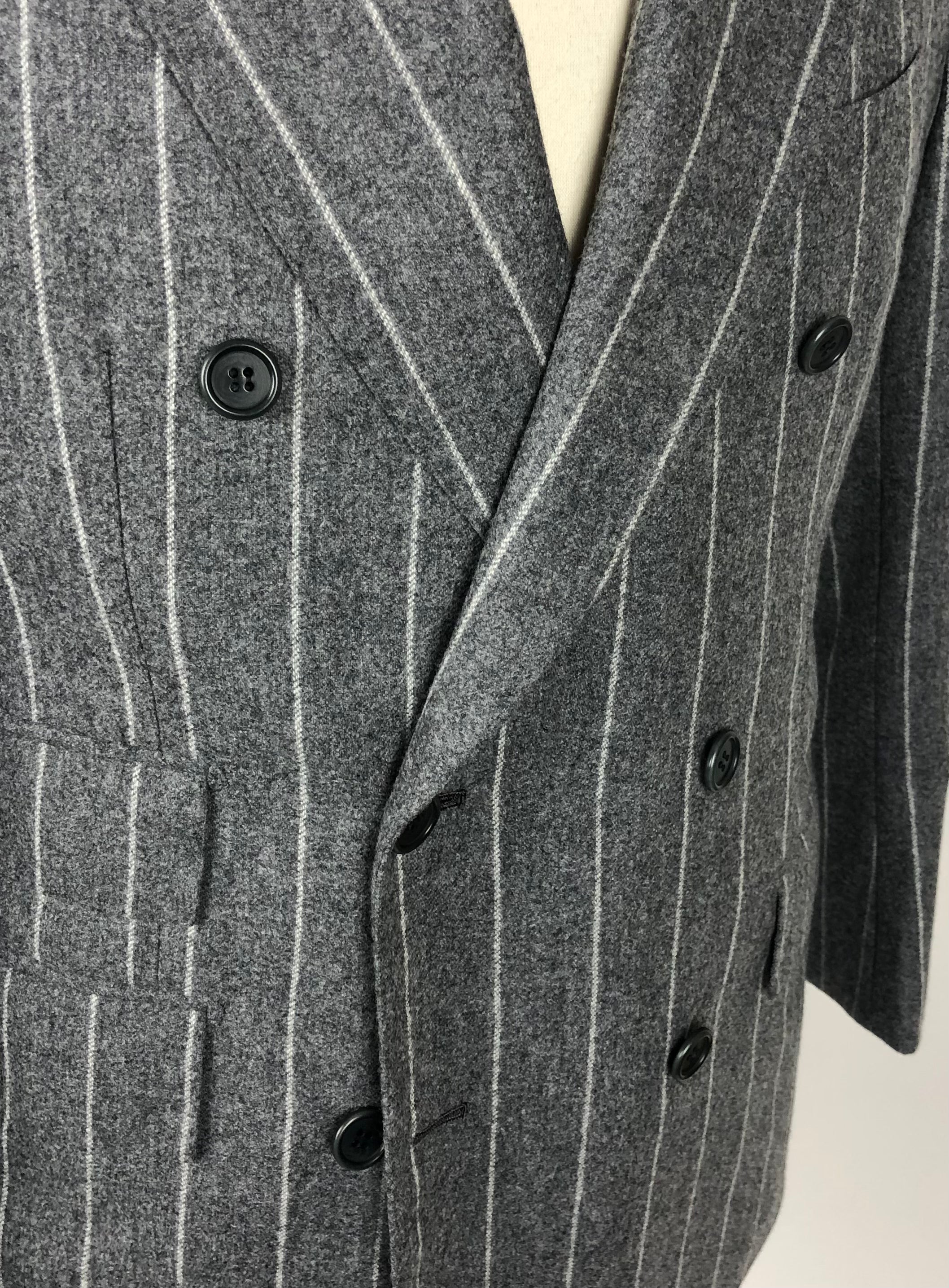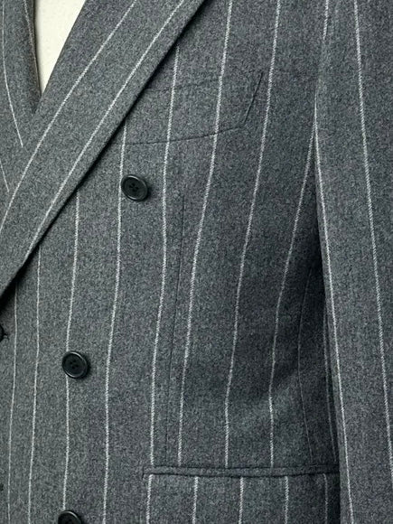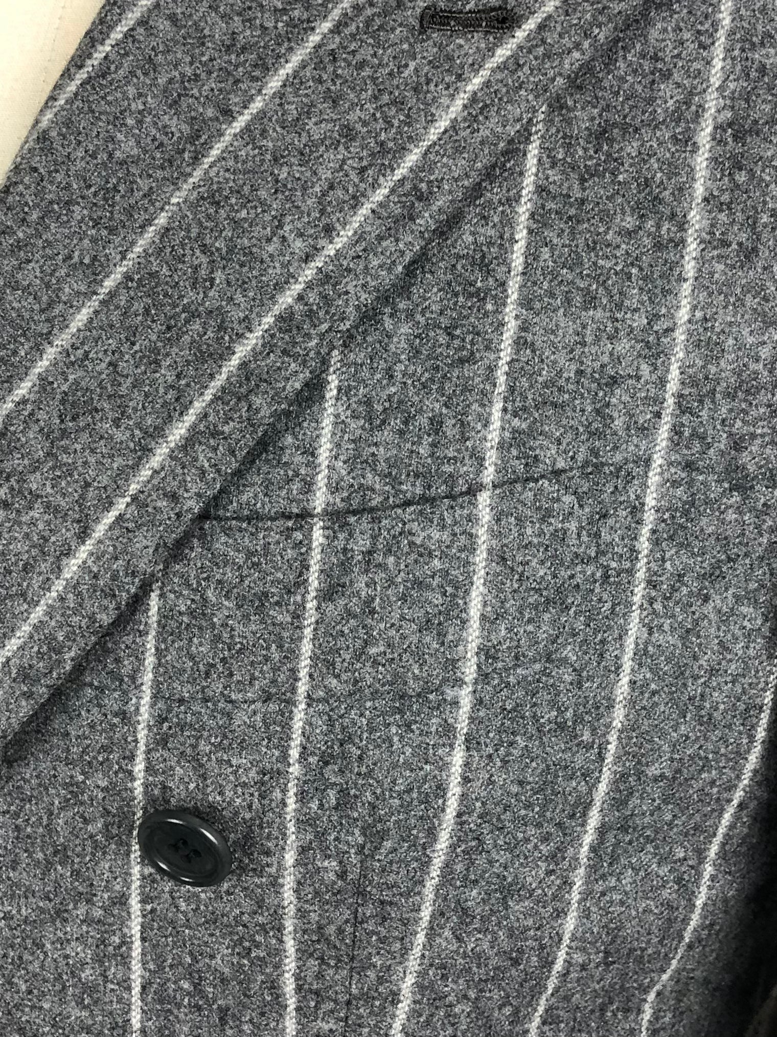 Middengrijs double-breasted pak van zachte flanellen wol met een krijtstreeppatroon en brede puntrevers. De formele look met de eclectische inslag belichaamt het dandyisme op zijn best - de kleermaker staat bekend om de moderne interpretatie van de Napolitaanse sectie. Het mannelijke silhouet is vakkundig uitgewerkt. De schouders worden perfect geaccentueerd, de taille flatterend geaccentueerd en de broek op perfecte lengte gebracht. Ontdek hieronder de uitgewerkte kleermakersdetails.