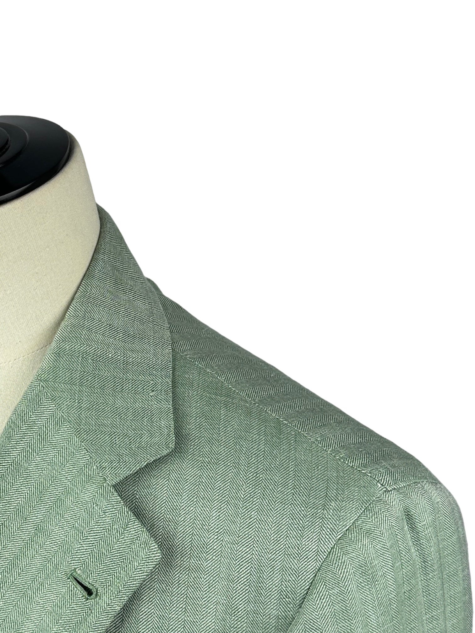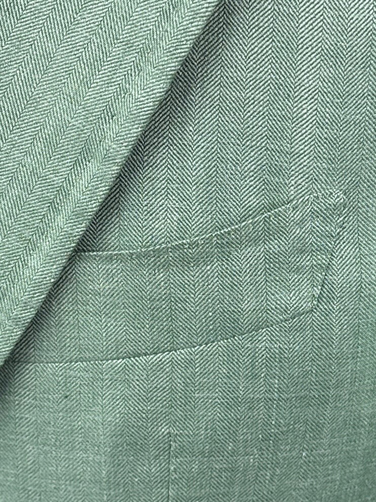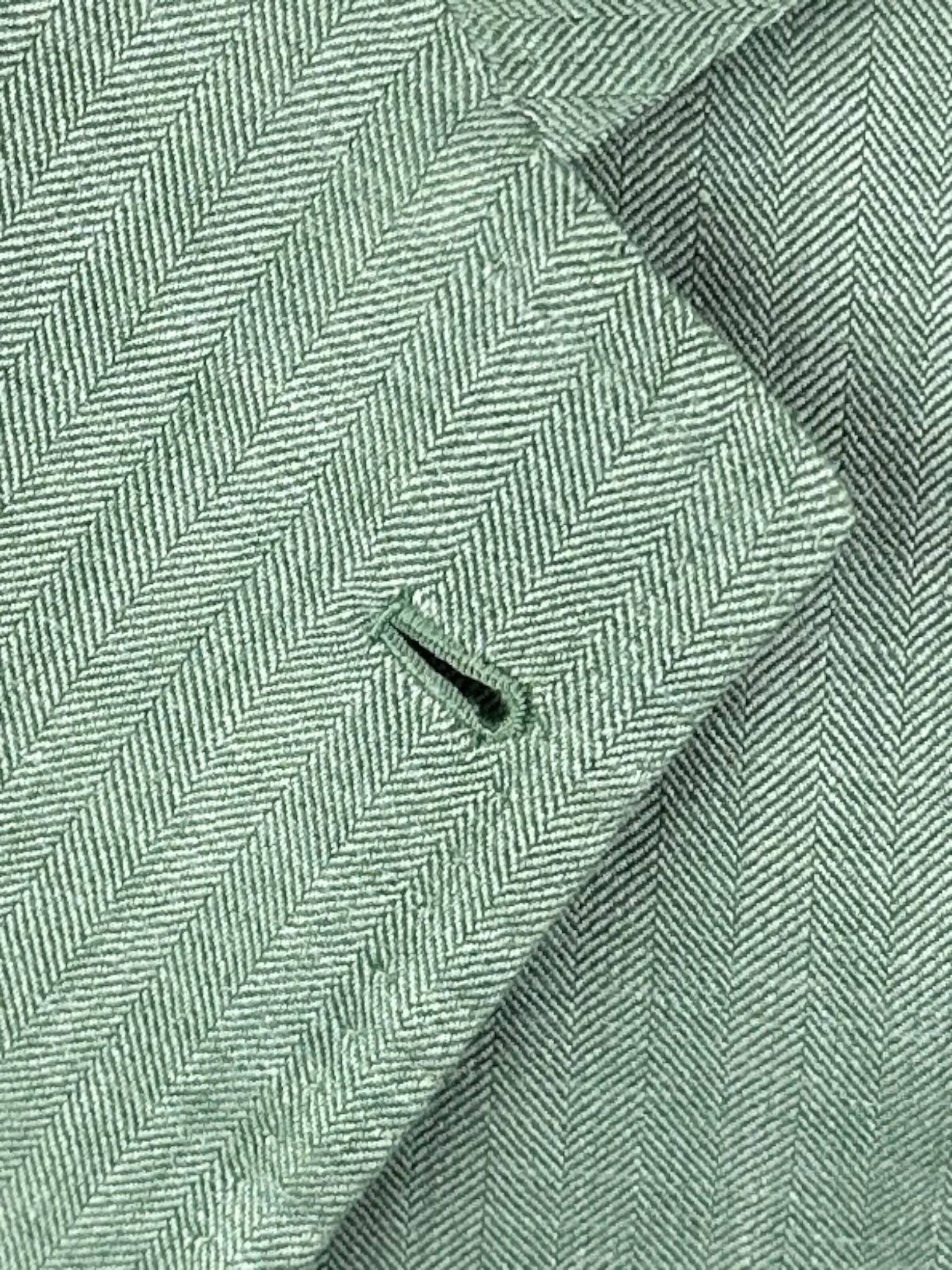 Mintgroen single-breasted jasje in een zachte wol-, linnen- en zijdemix (Loro Piana Summertime Quality) met een visgraatmotief en brede inkepingen in de revers. De stof wordt geproduceerd door de Italiaanse fabriek Loro Piana uit hun Mare-bos. De formele look met de eclectische inslag belichaamt dandyisme op zijn best - de kleermaker staat bekend om de moderne interpretatie van de Napolitaanse sectie. Het mannelijke silhouet is vakkundig uitgewerkt. De schouders worden perfect geaccentueerd, de taille flatterend benadrukt en de broek op perfecte lengte gebracht. Ontdek hieronder de uitgebreide kleermakersdetails.