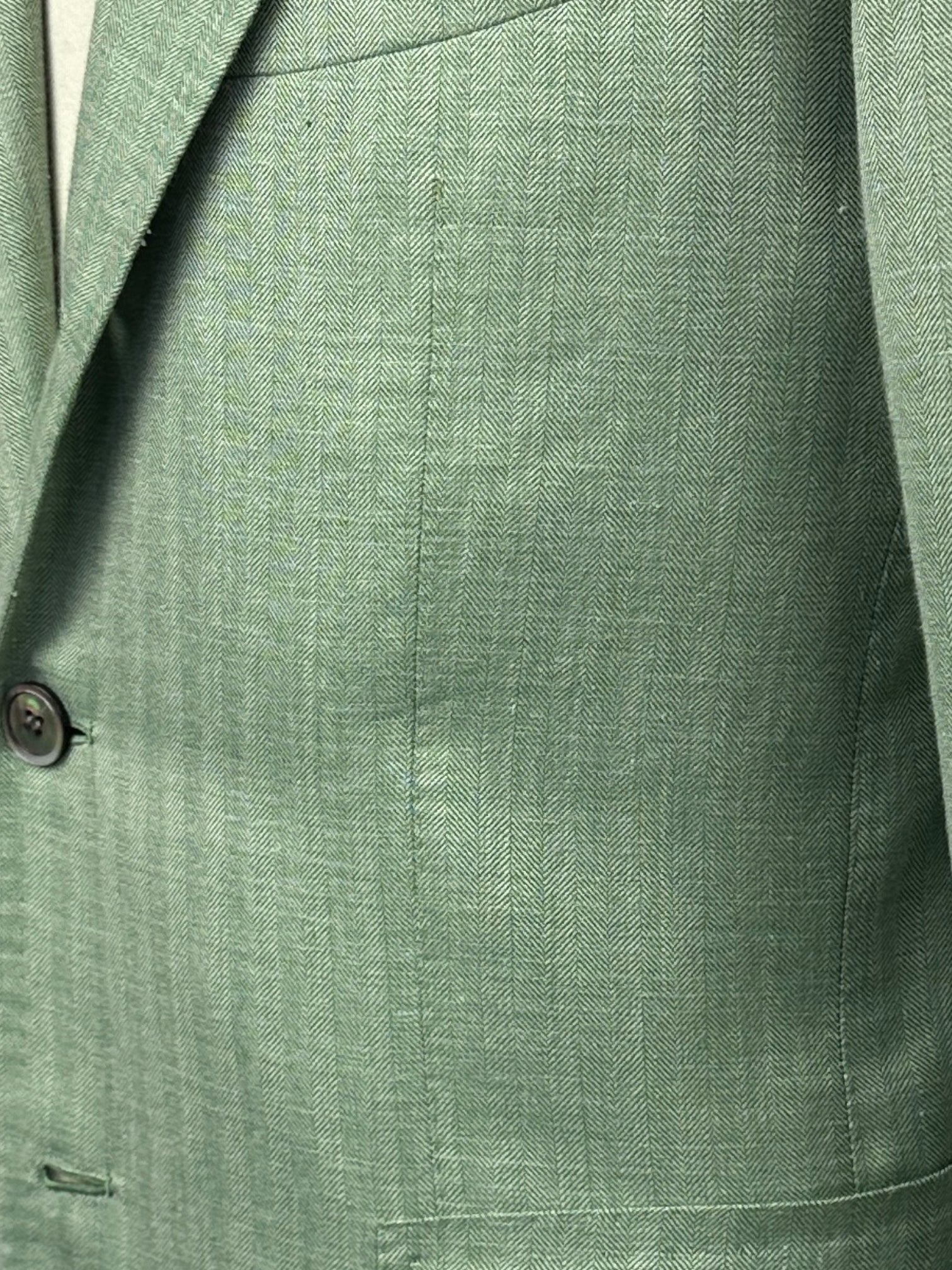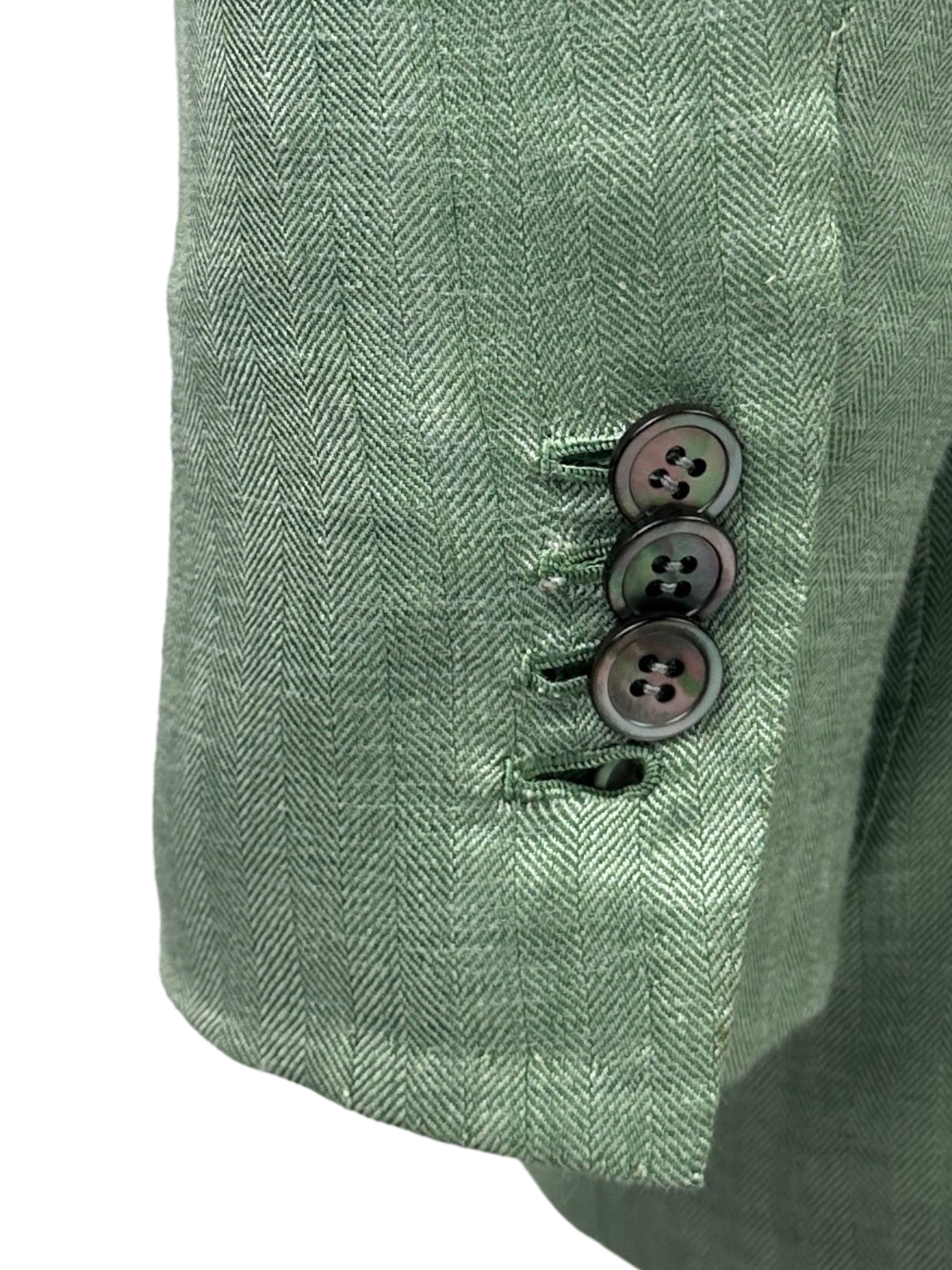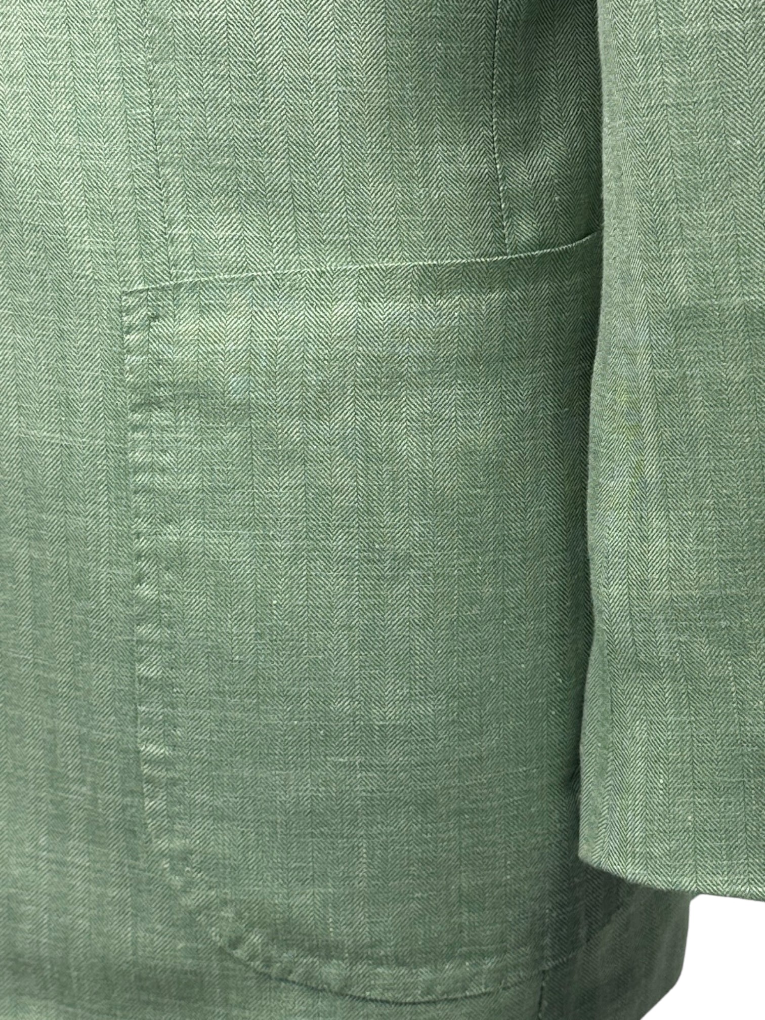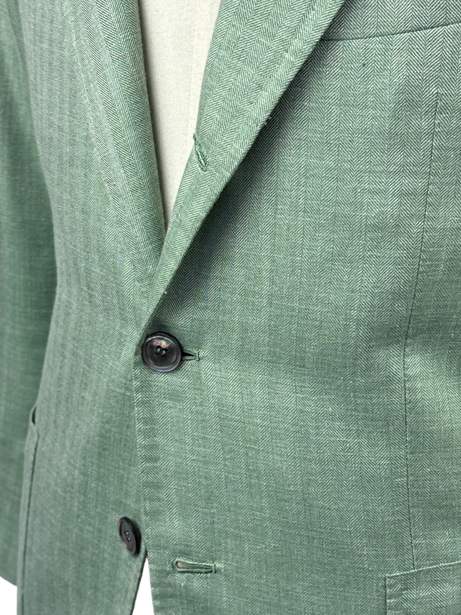 Mintgroen single-breasted jasje in een zachte wol-, linnen- en zijdemix (Loro Piana Summertime Quality) met een visgraatmotief en brede inkepingen in de revers. De stof wordt geproduceerd door de Italiaanse fabriek Loro Piana uit hun Mare-bos. De formele look met de eclectische inslag belichaamt dandyisme op zijn best - de kleermaker staat bekend om de moderne interpretatie van de Napolitaanse sectie. Het mannelijke silhouet is vakkundig uitgewerkt. De schouders worden perfect geaccentueerd, de taille flatterend benadrukt en de broek op perfecte lengte gebracht. Ontdek hieronder de uitgebreide kleermakersdetails.