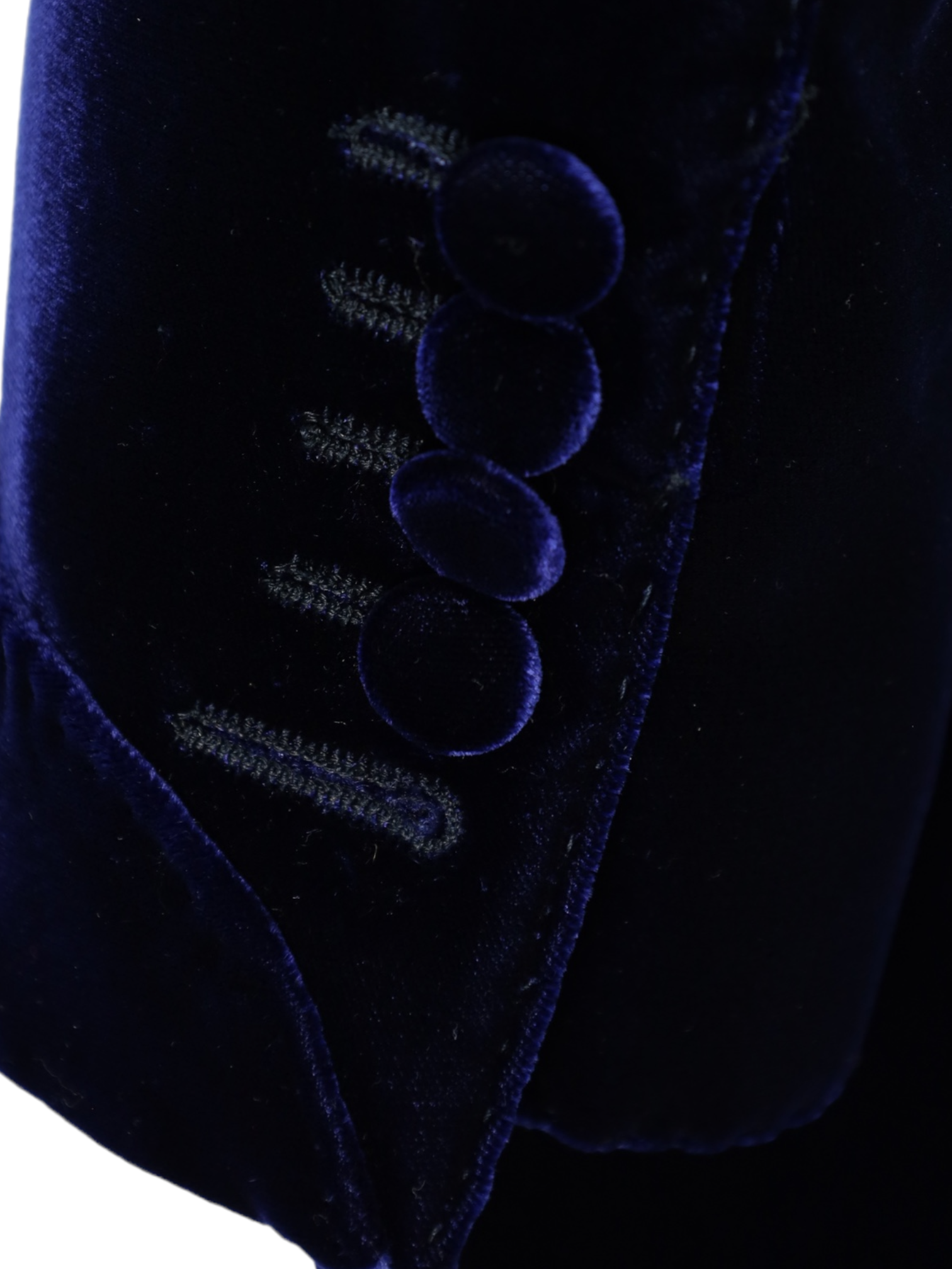 Met het maatwerk van Tom Ford bezit u het charisma van James Bond. Deze tijdloze look, gemaakt van zacht fluweel van een viscosemix, heeft scherp gewatteerde - gestrikte - schouders, brede piek-revers, lichtjes opgehangen rond de taille en 5 functionerende knoopsgaten aan het uiteinde van de mouw. Ontdek hieronder de uitgebreide kleermakersdetails.