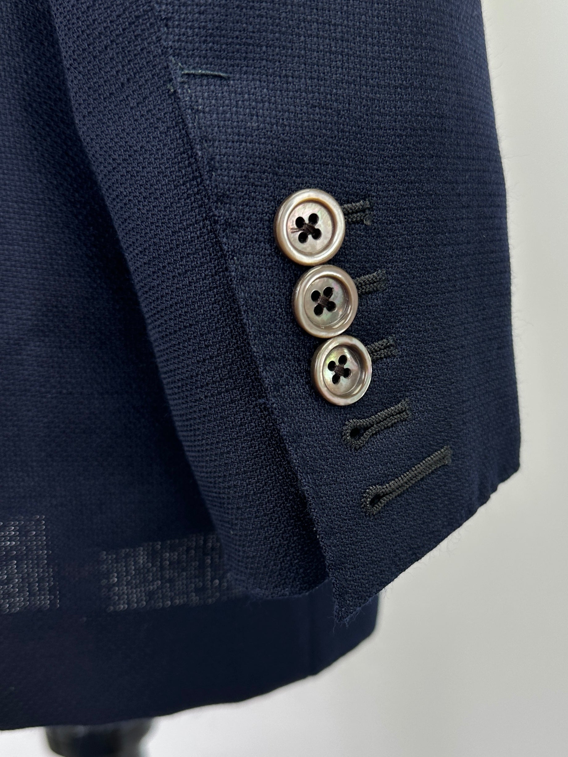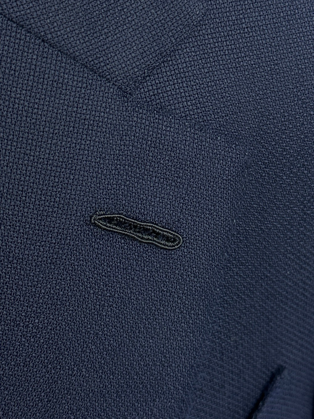 5 functionele knoopsgaten met hoornen knopen aan het einde van de mouw, met een grotere vijfde knoopopening - een typisch Tom Ford detail. Zelfs deze stap, ogenschijnlijk de eenvoudigste, wordt behandeld met een overvloed aan details. Het bevestigen van de knopen is een taak die geduld vereist en perfect moet worden voltooid.
