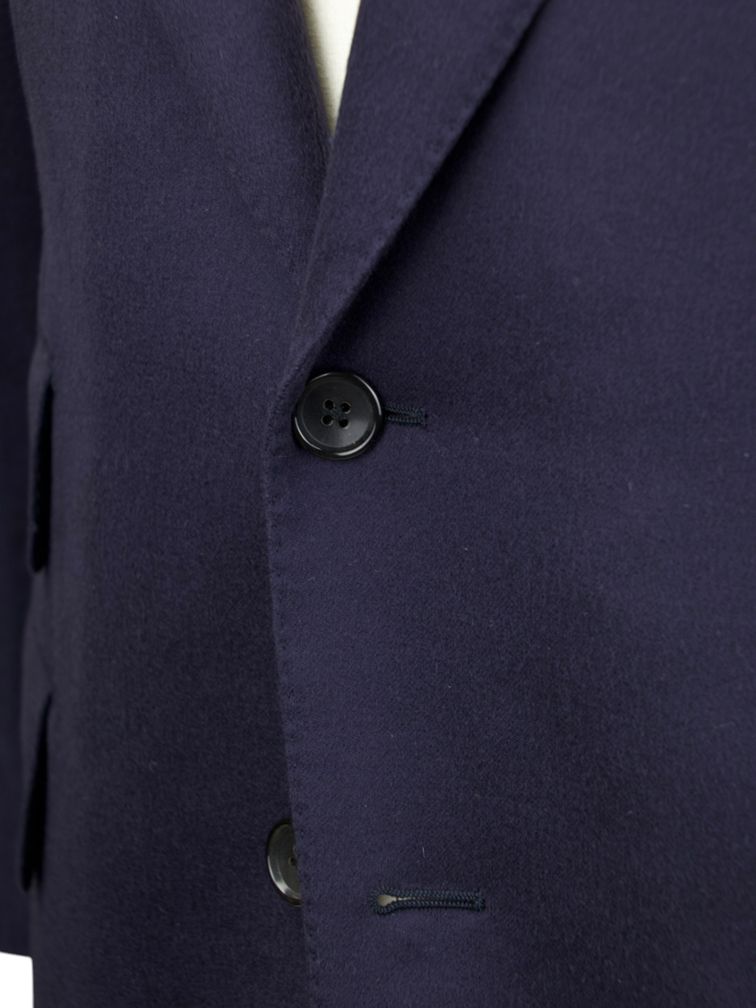 5 functionele knoopsgaten met hoornen knopen aan het einde van de mouw, met een grotere vijfde knoopopening - een typisch Tom Ford detail. Zelfs deze stap, ogenschijnlijk de eenvoudigste, wordt behandeld met een overvloed aan details. Het bevestigen van de knopen is een taak die geduld vereist en perfect moet worden voltooid.
