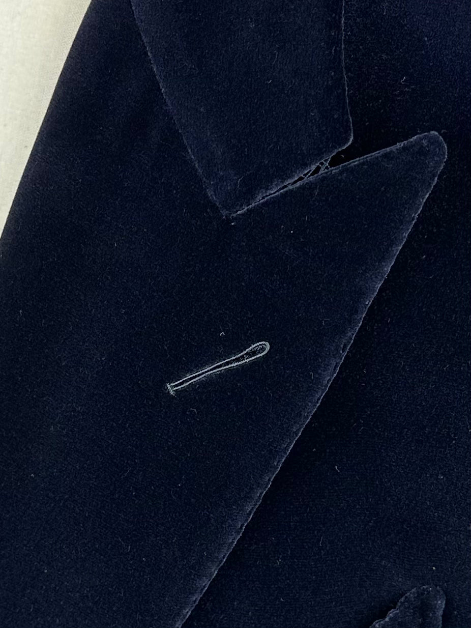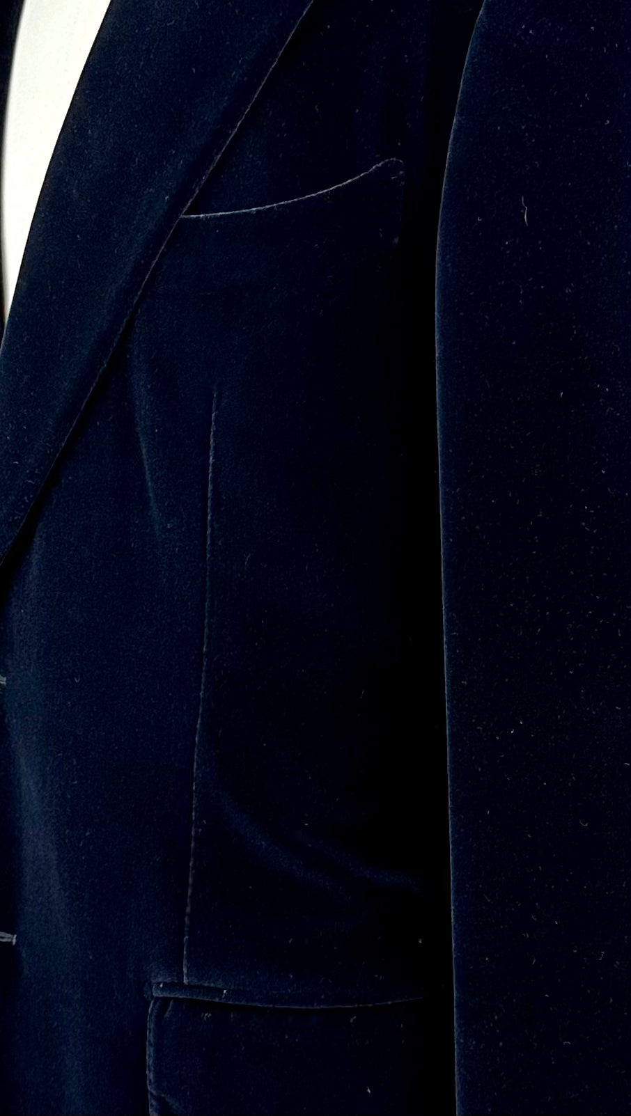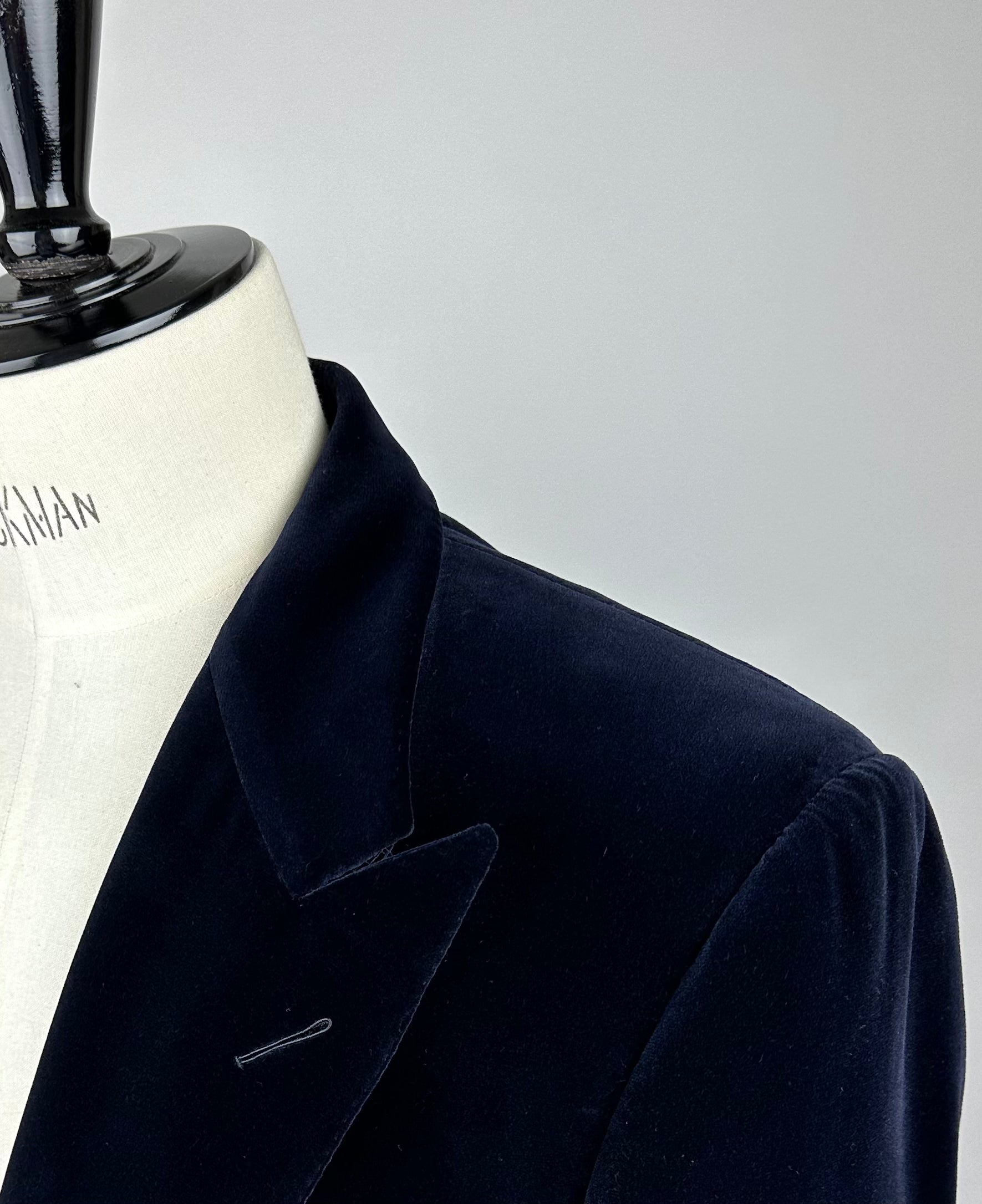 Met het maatwerk van Tom Ford bezit u het charisma van James Bond. Deze tijdloze look, gemaakt van zacht fluweel van een zijde- en katoenmix, heeft scherp gewatteerde - gestrikte - schouders, brede puntrevers, lichtjes opgehangen rond de taille en 5 functionerende knoopsgaten aan het uiteinde van de mouw. Ontdek hieronder de uitgebreide kleermakersdetails.