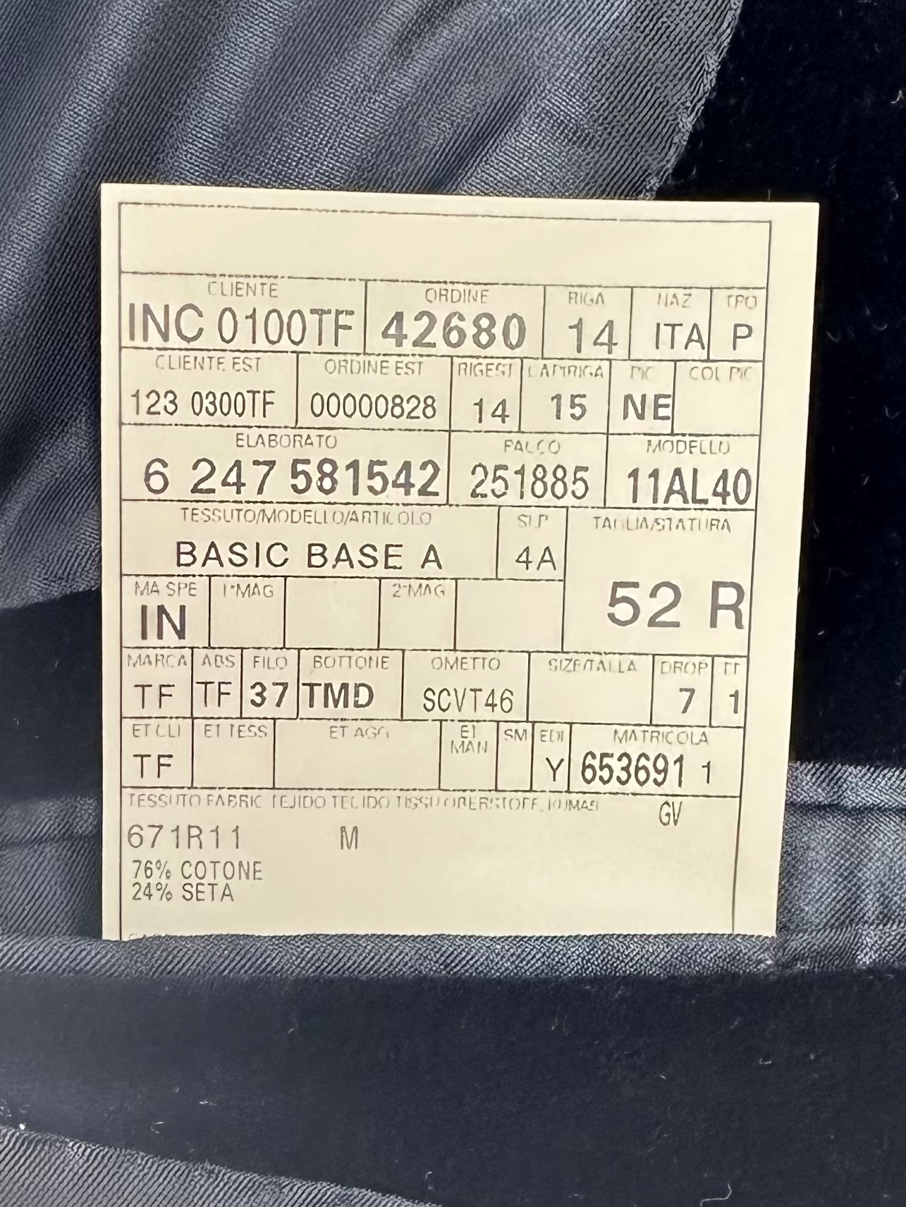5 functionele knoopsgaten met hoornen knopen aan het einde van de mouw, met een grotere vijfde knoopopening - een typisch Tom Ford detail. Zelfs deze stap, ogenschijnlijk de eenvoudigste, wordt behandeld met een overvloed aan details. Het bevestigen van de knopen is een taak die geduld vereist en perfect moet worden voltooid.