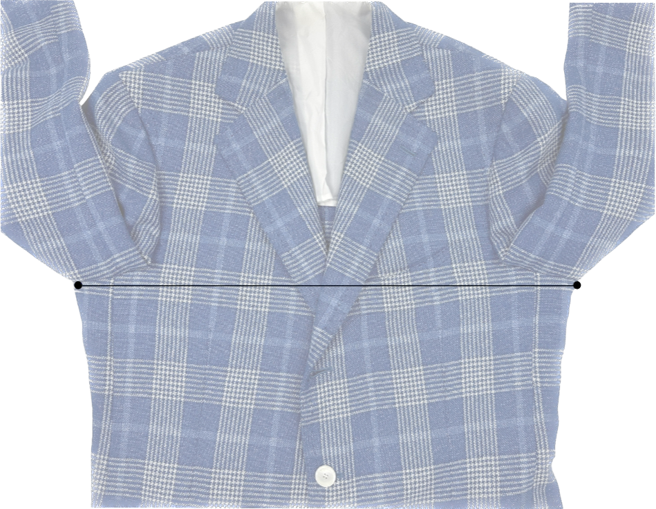 Position the sleeves pointing up so that you can find the absolute corner where the side of the jacket meets the armpits. Measure from this point straight across the suit jacket to the opposite edge where the armpit and torso meet.