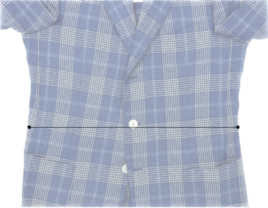 Measure straight across from one edge of the jacket waist to the other edge. On a two button jacket, position the measuring tape straight under the top button. On a 3 button jacket, the measuring tape should pass under the middle button.