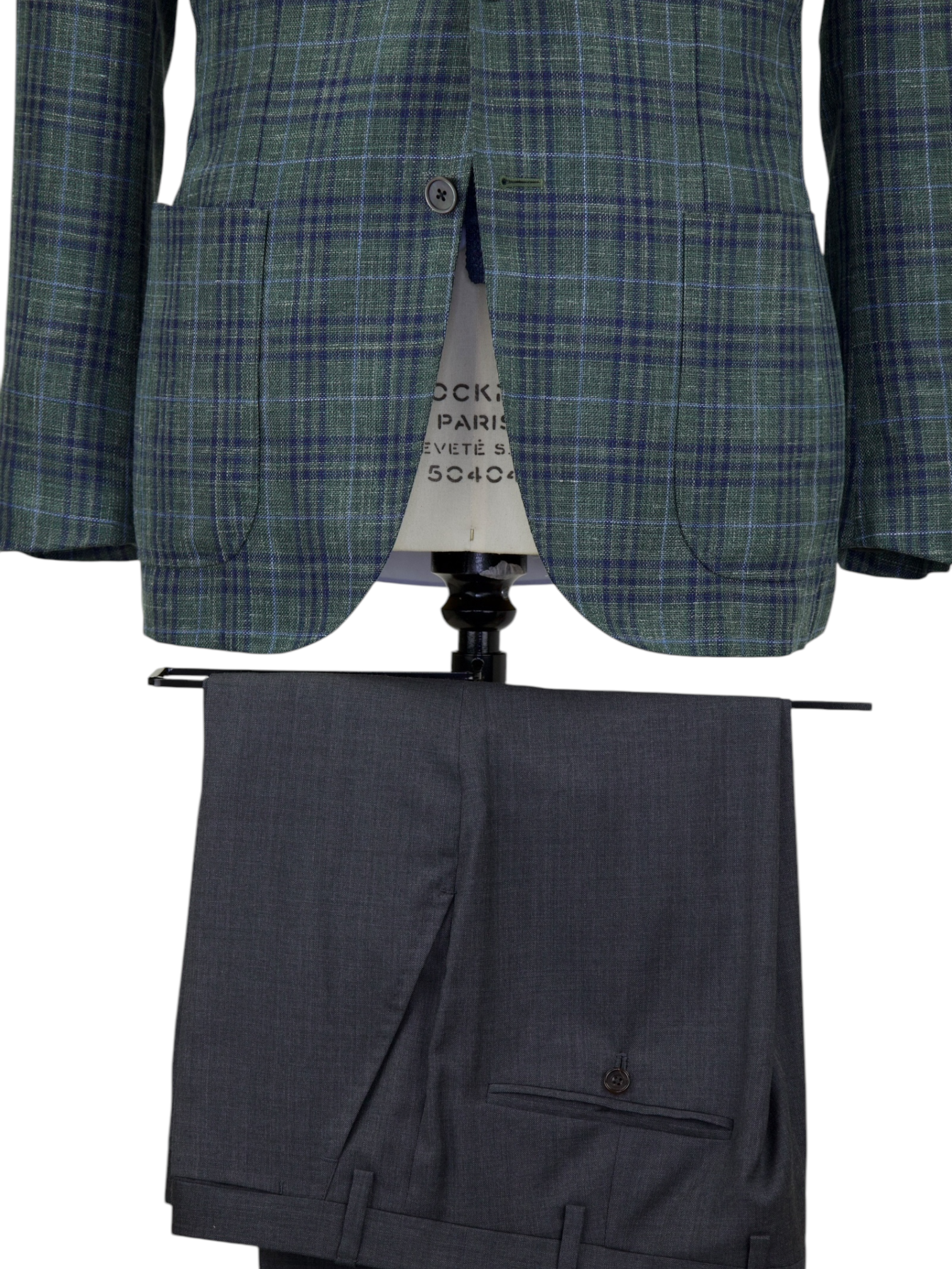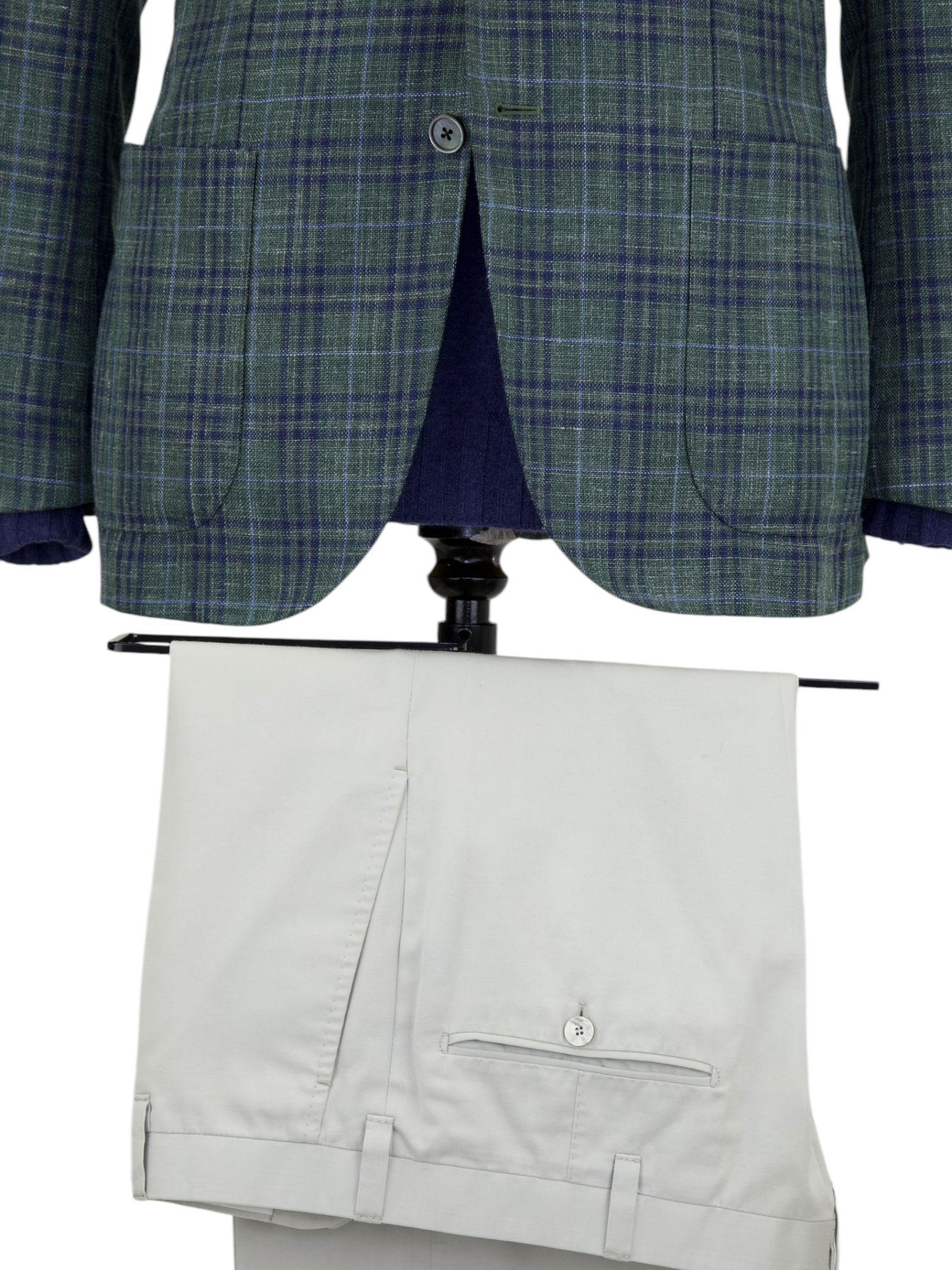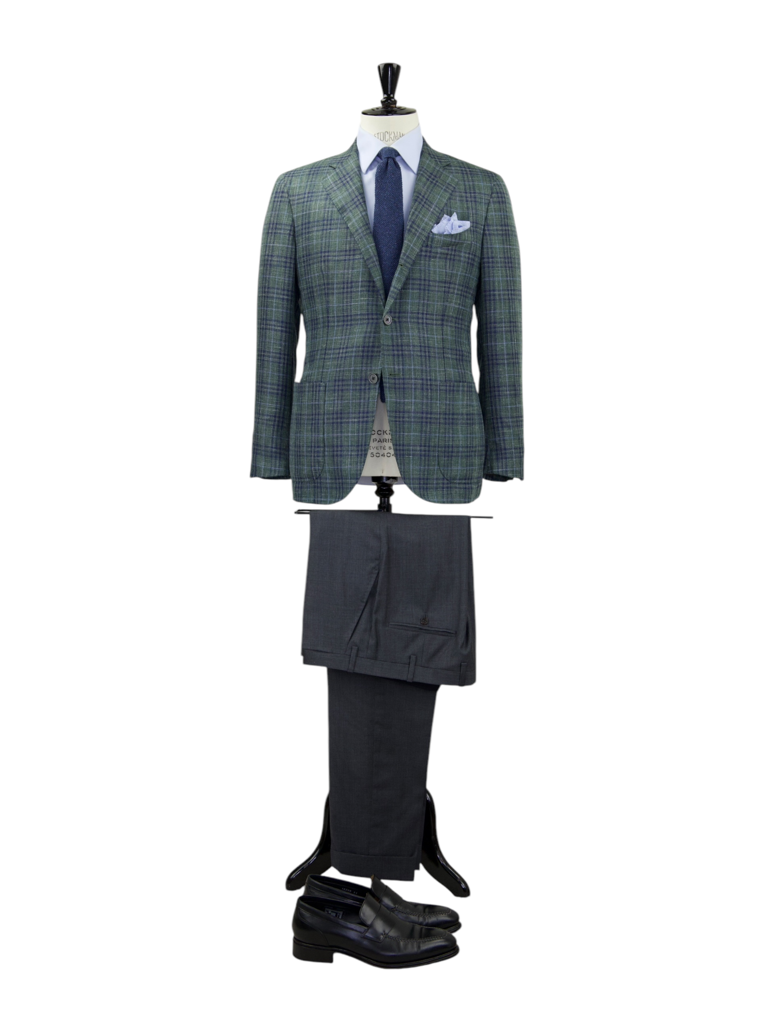 For trousers, I chose medium-grey twill trousers in a four-season fabric. Grey is a natural complement to green, grounding the outfit without overpowering it. I often say green is easier to combine than most assume—it matches nearly every color (just avoid red unless you want to look like a Christmas tree!).
