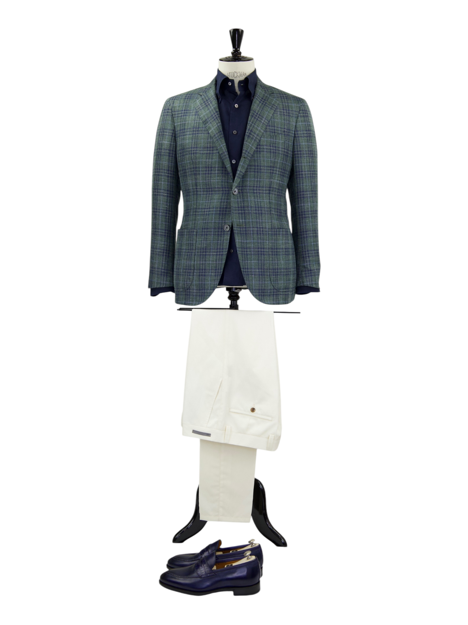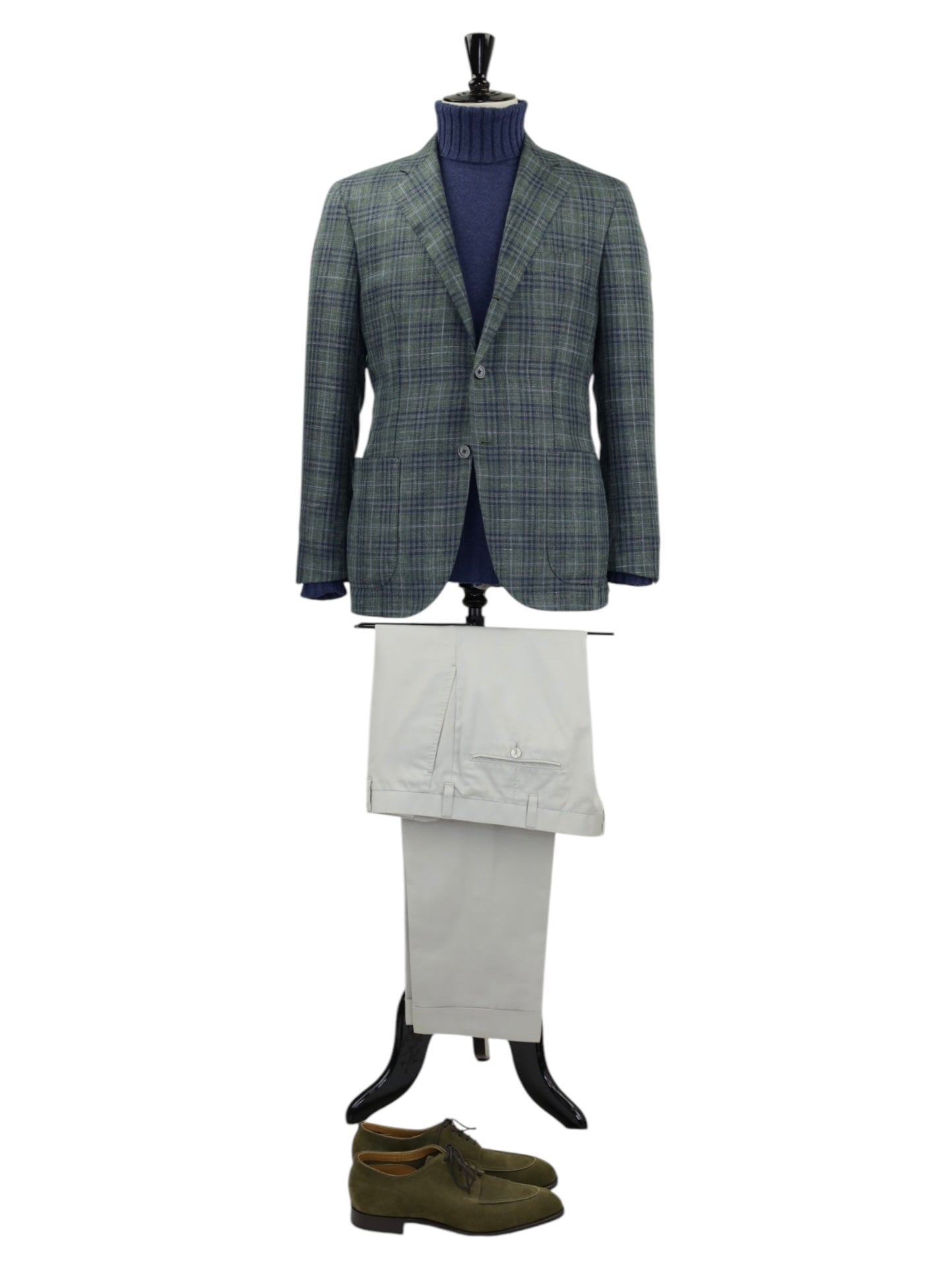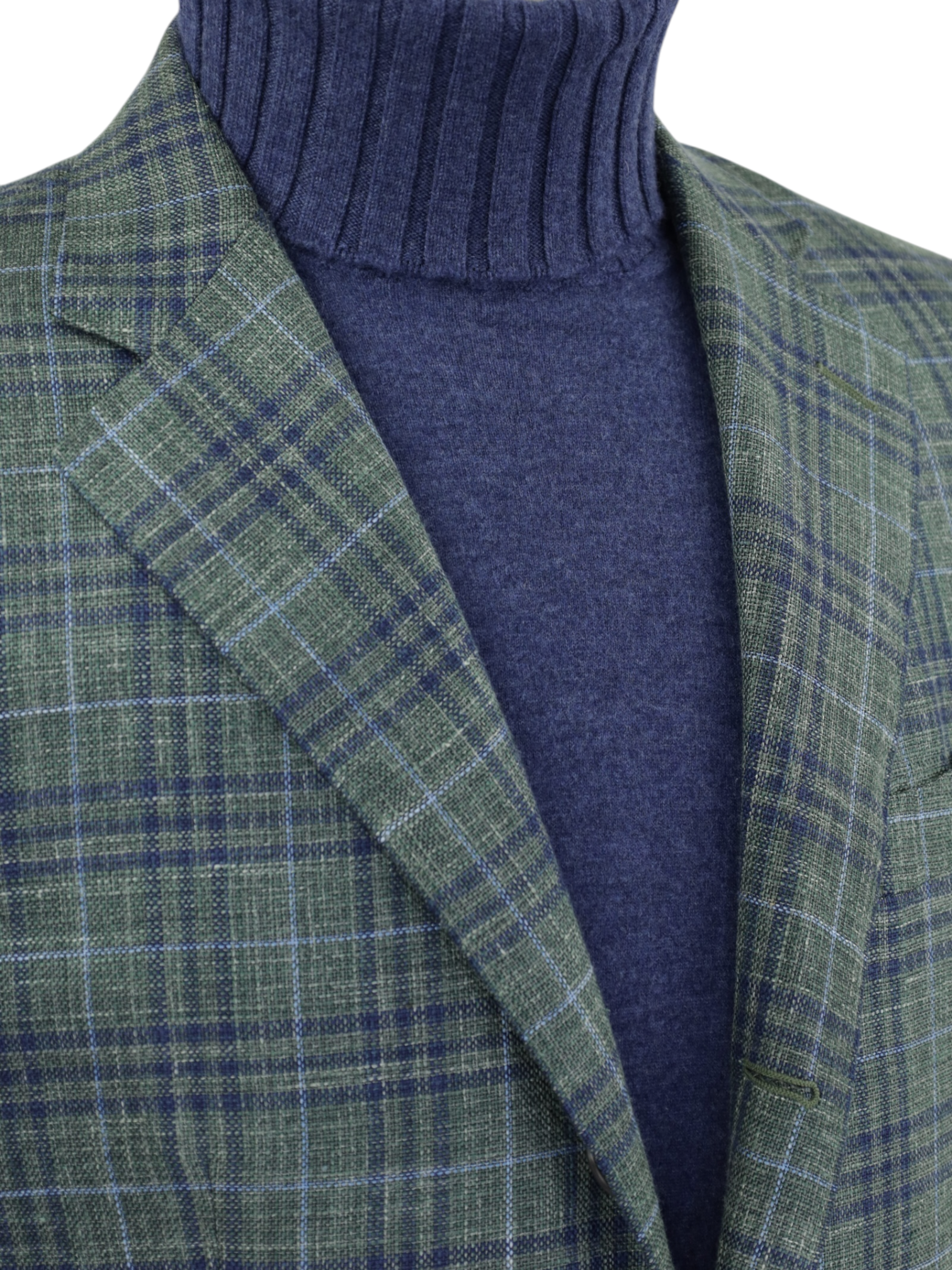 Why it works: For a slightly more relaxed look, I paired the blazer with a denim blue pure cashmere turtleneck by Cesare Attolini. While some may argue against this blazer in colder months, I’d wear it like this without hesitation. The rich blue of the turtleneck echoes the overcheck and balances the green tones.