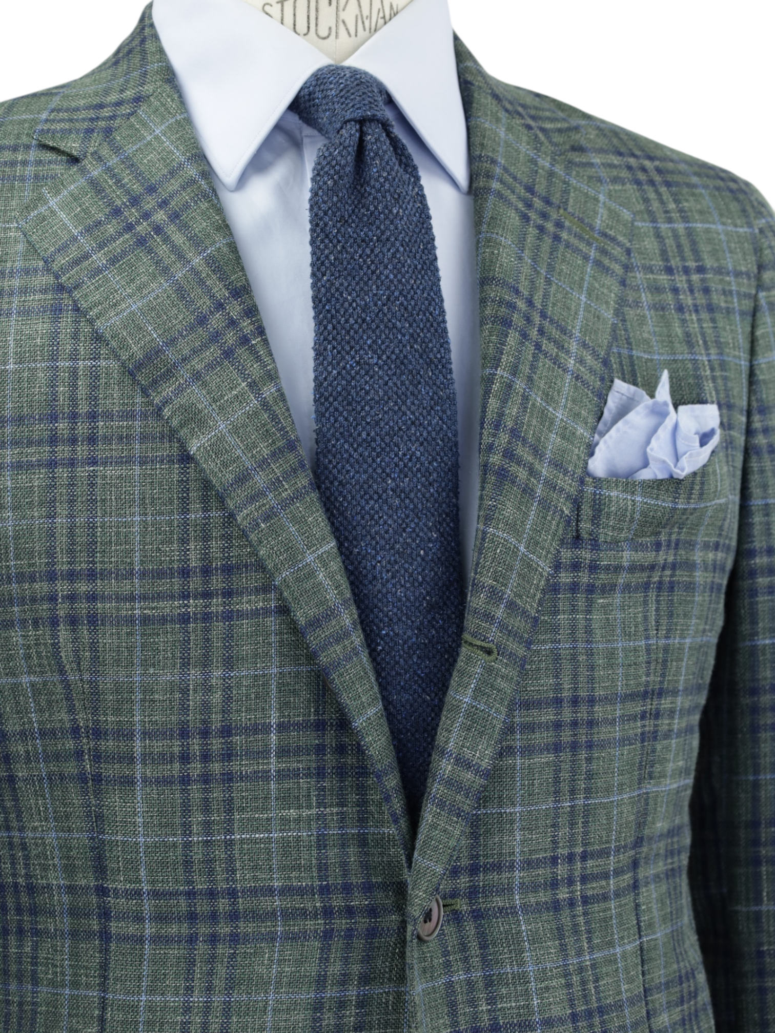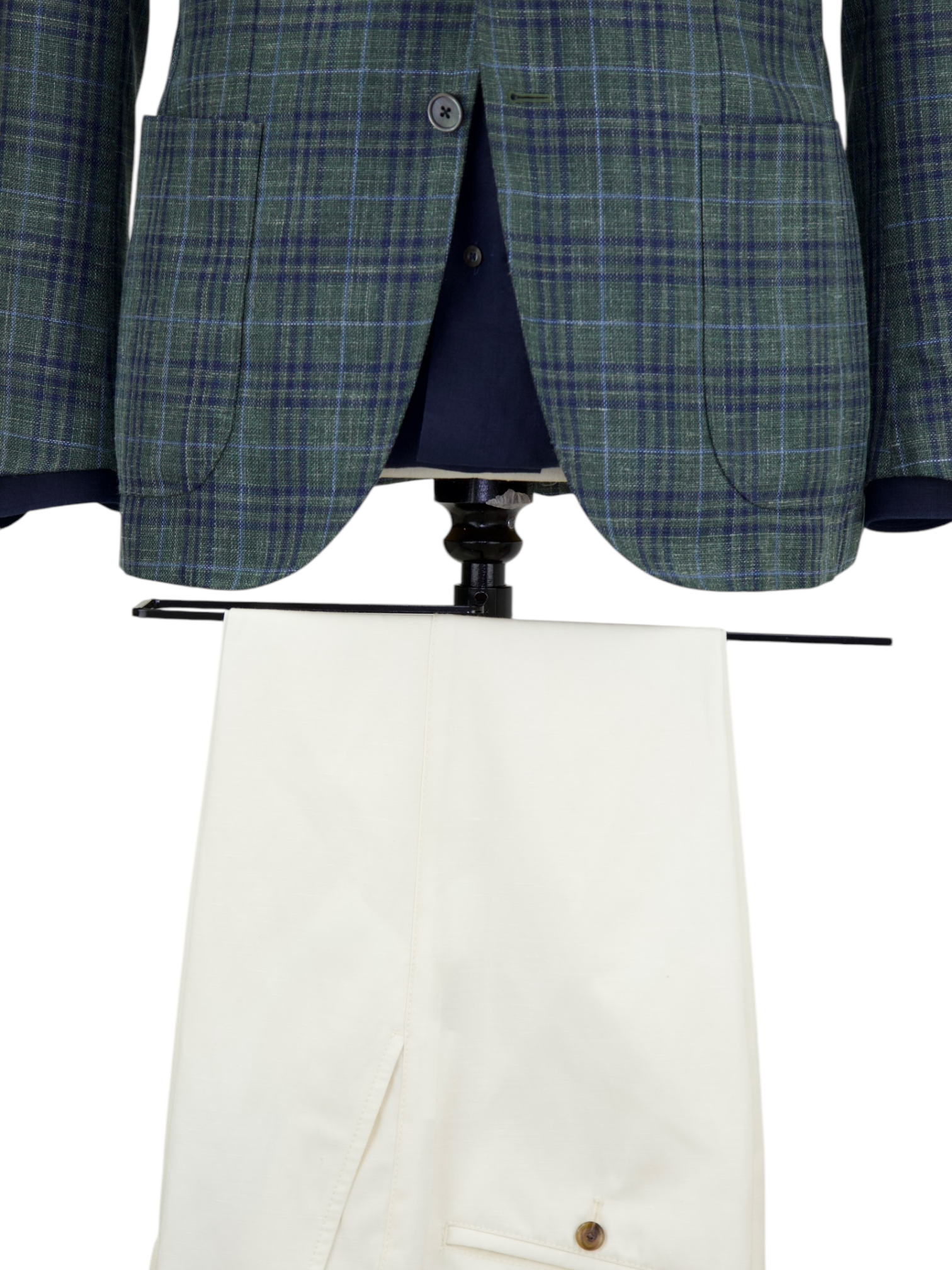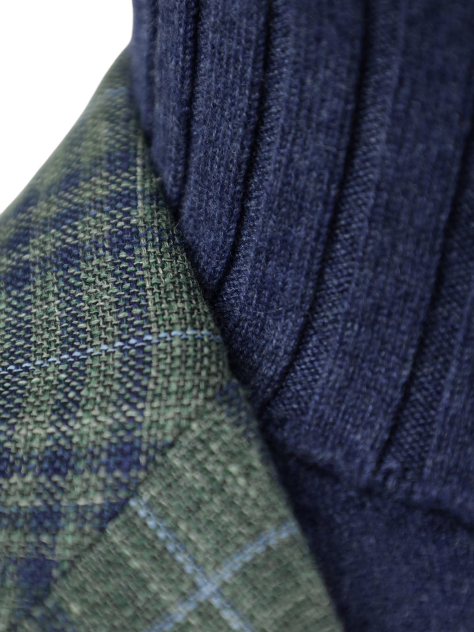 Why it works: For a slightly more relaxed look, I paired the blazer with a denim blue pure cashmere turtleneck by Cesare Attolini. While some may argue against this blazer in colder months, I’d wear it like this without hesitation. The rich blue of the turtleneck echoes the overcheck and balances the green tones.