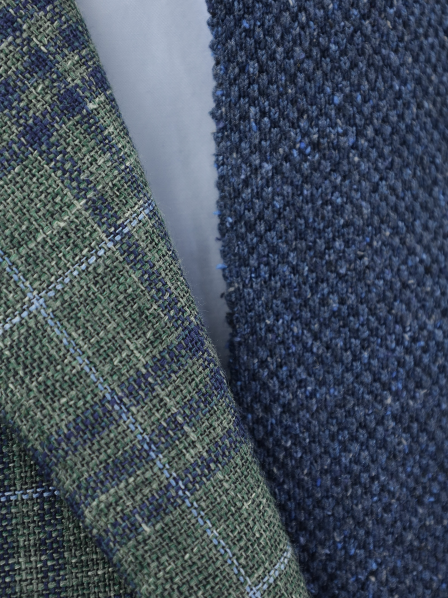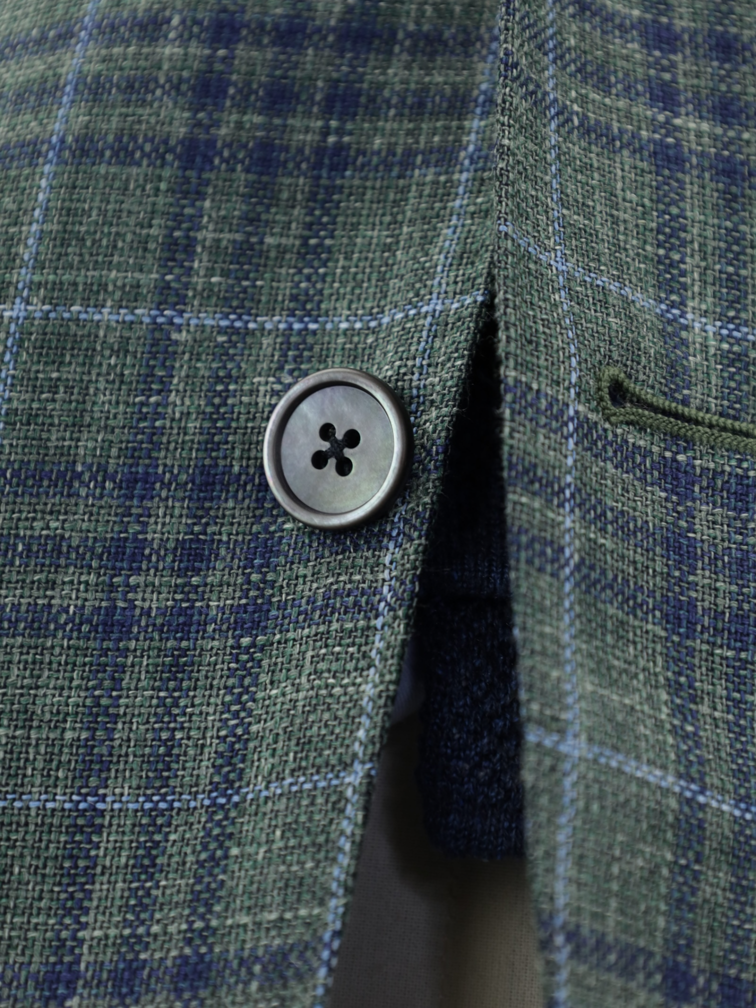 The fabric has a subtle texture, adding depth and sophistication. The color is a soft green with a navy and denim blue overcheck, giving it a refined yet approachable look. While it’s lightweight, I believe this blazer can transition into early summer—though opinions may differ.