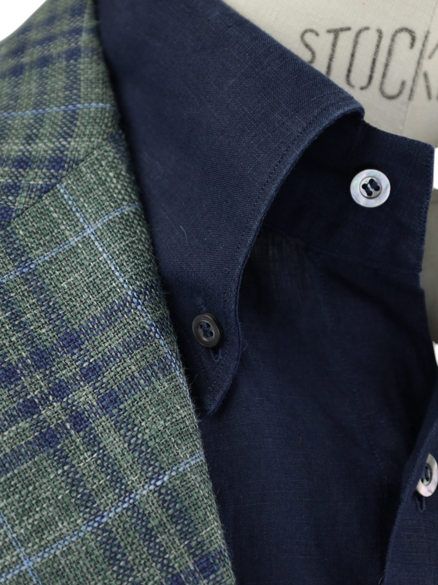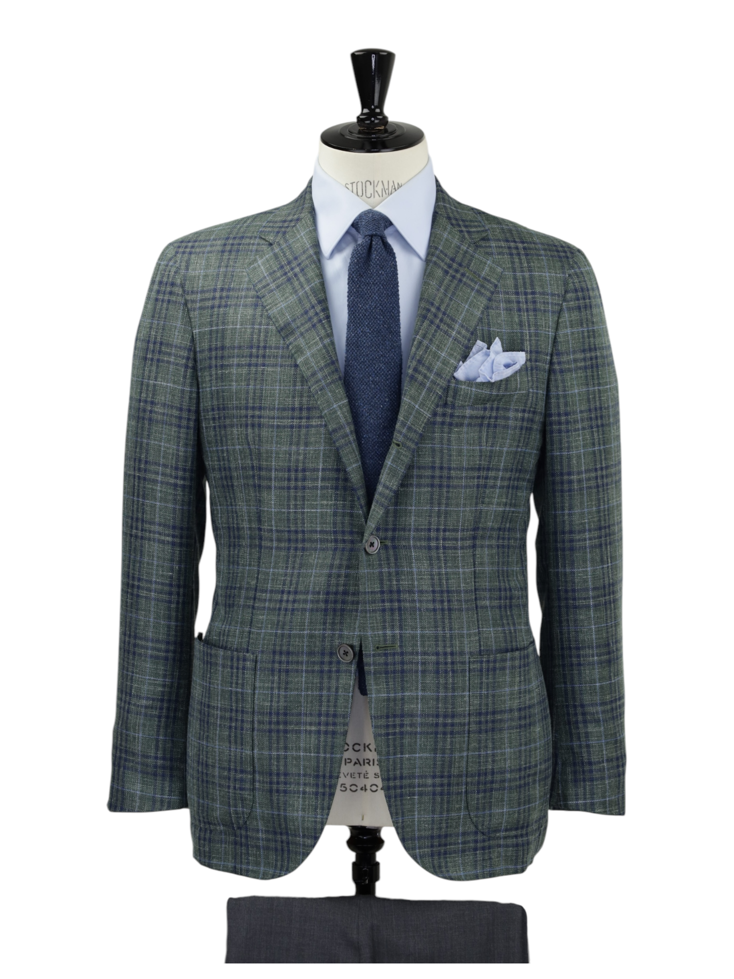 Why it works: Dressing up this blazer, I paired it with a light blue cotton shirt that highlights the overcheck’s blue tones. Adding a textured linen tie from Kiton creates harmony through both texture and color.