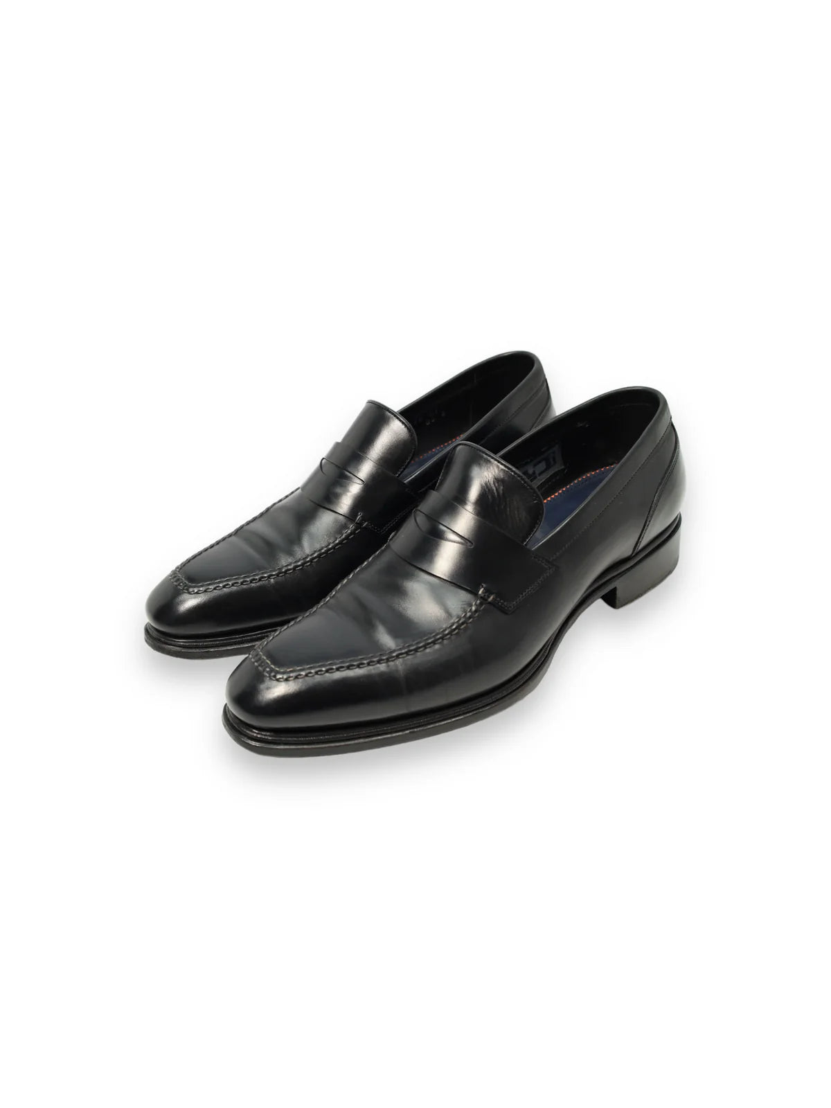 Finally, the black penny loafers in box calf leather complete the look. The sleek leather texture aligns with the fine wool trousers, while the loafer style keeps the outfit just shy of overly formal—a perfect balance for business casual.