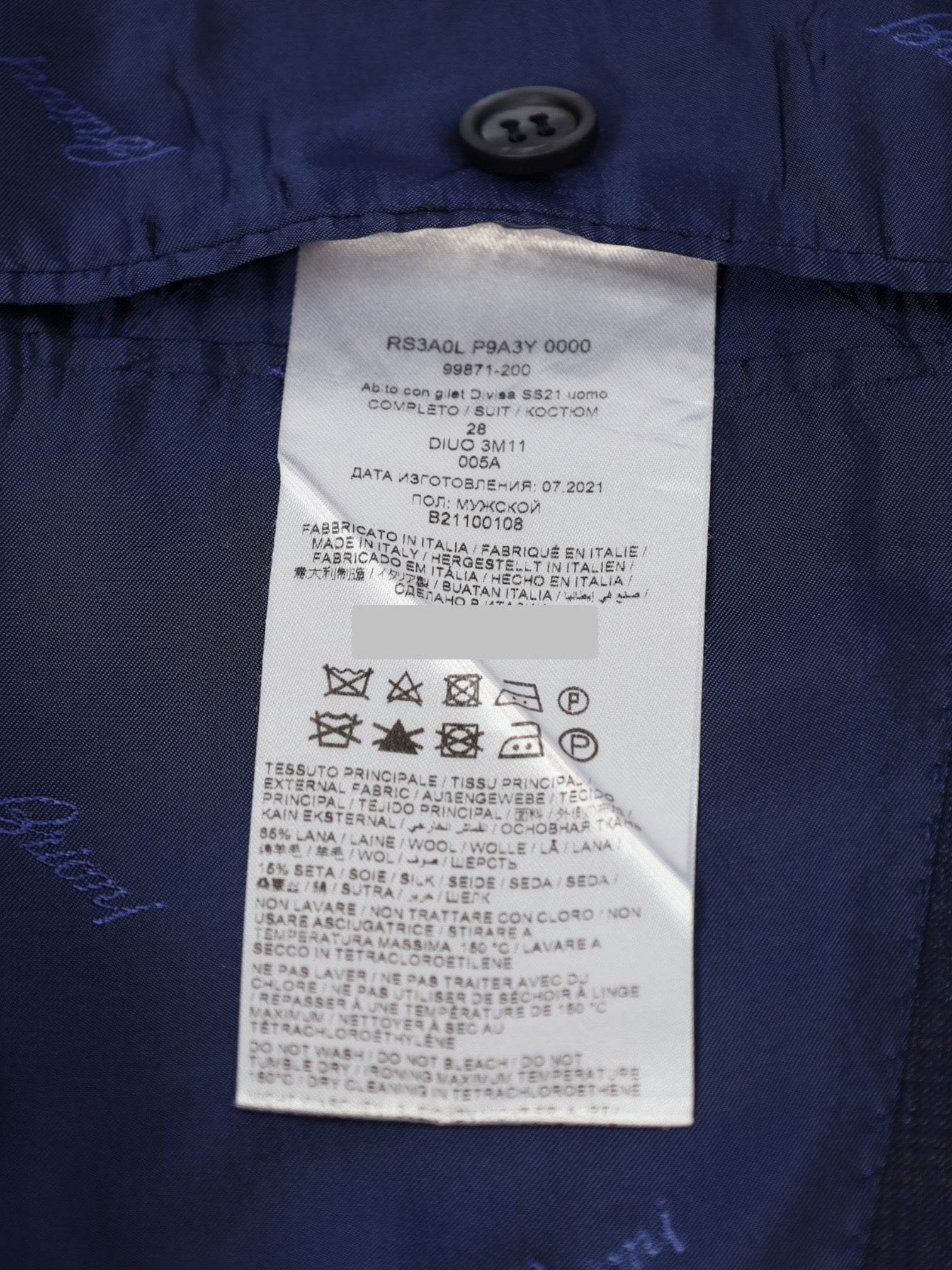 Following Brioni's meticulous manufacturing process, each suit involves over 220 precise steps and more than 22 hours of expert craftsmanship. This rigorous attention to detail ensures every aspect of the suit, from the precision of the stitching to the elegant drape of the fabric, is perfected.