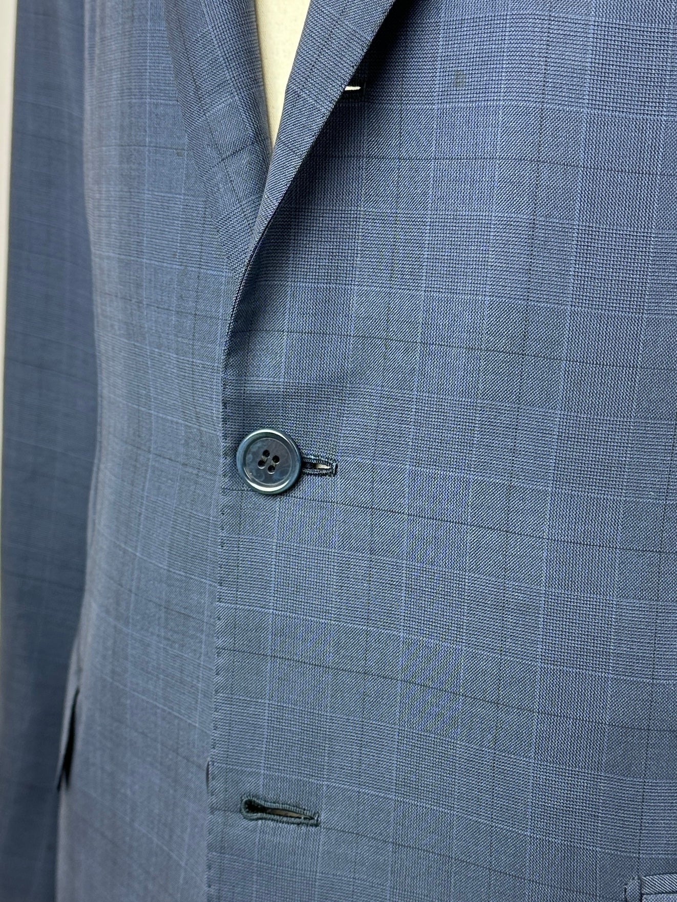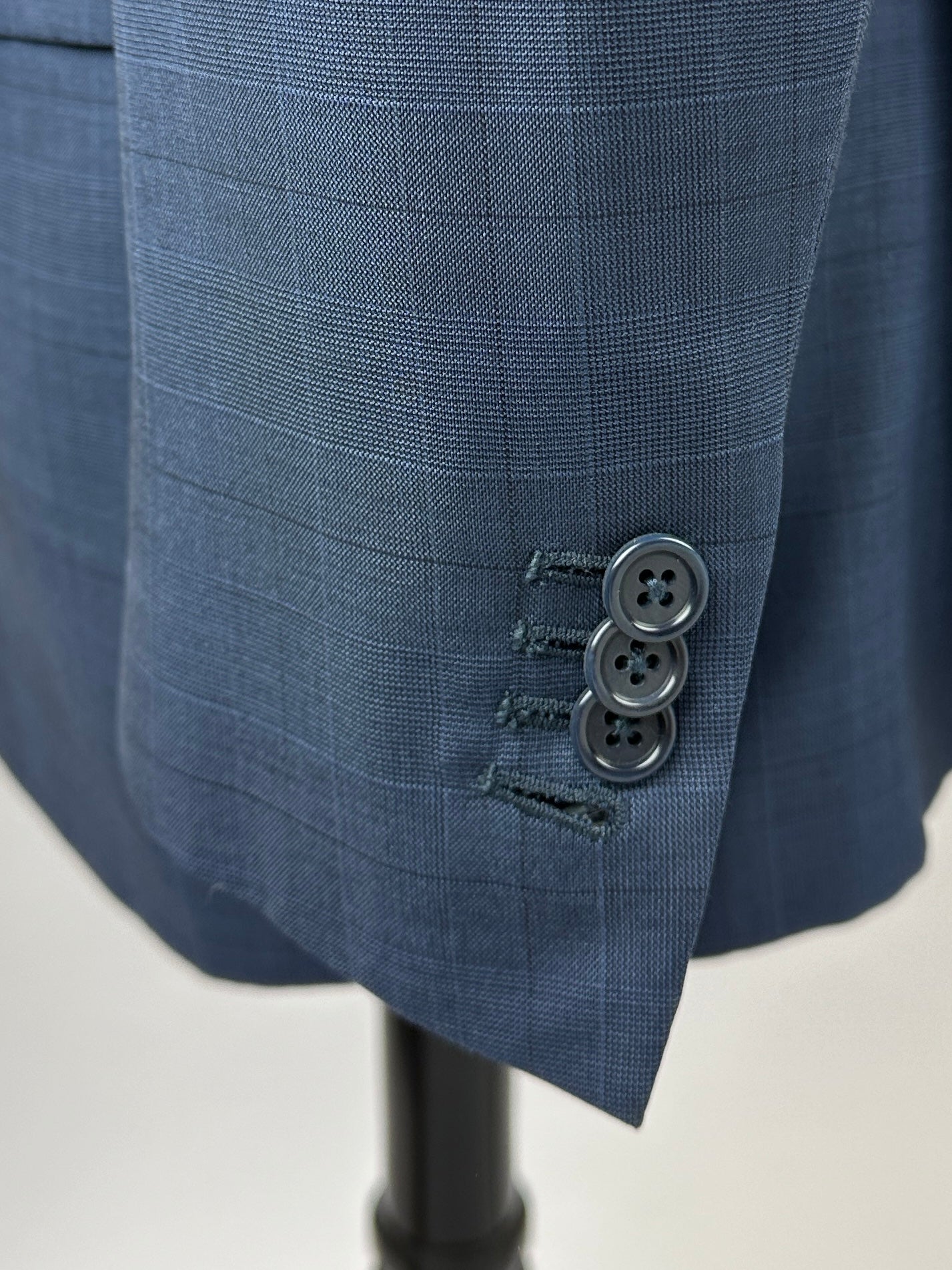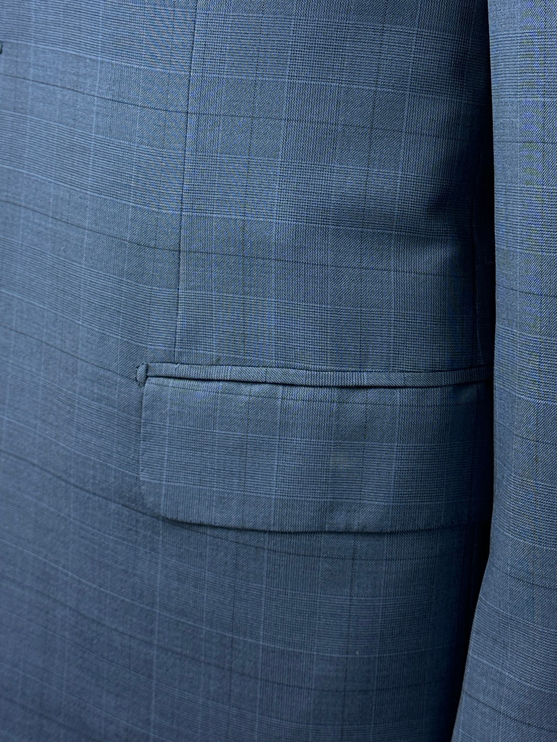 Blue handmade Brioni suit. notch lapels, fully lined, expertly constructed from luxury Super 180's wool with double side vents at the back and 2.5-button closure. The notch lapels and welted chest pocket are undeniably classic. Discover the elaborated sartorial details below.