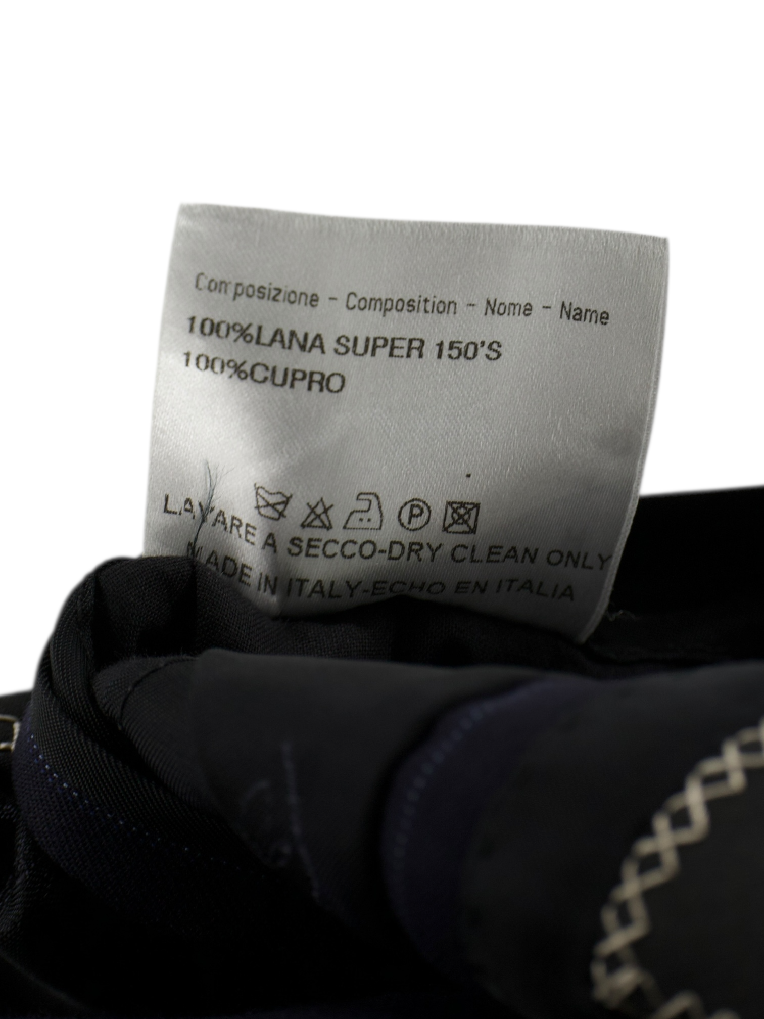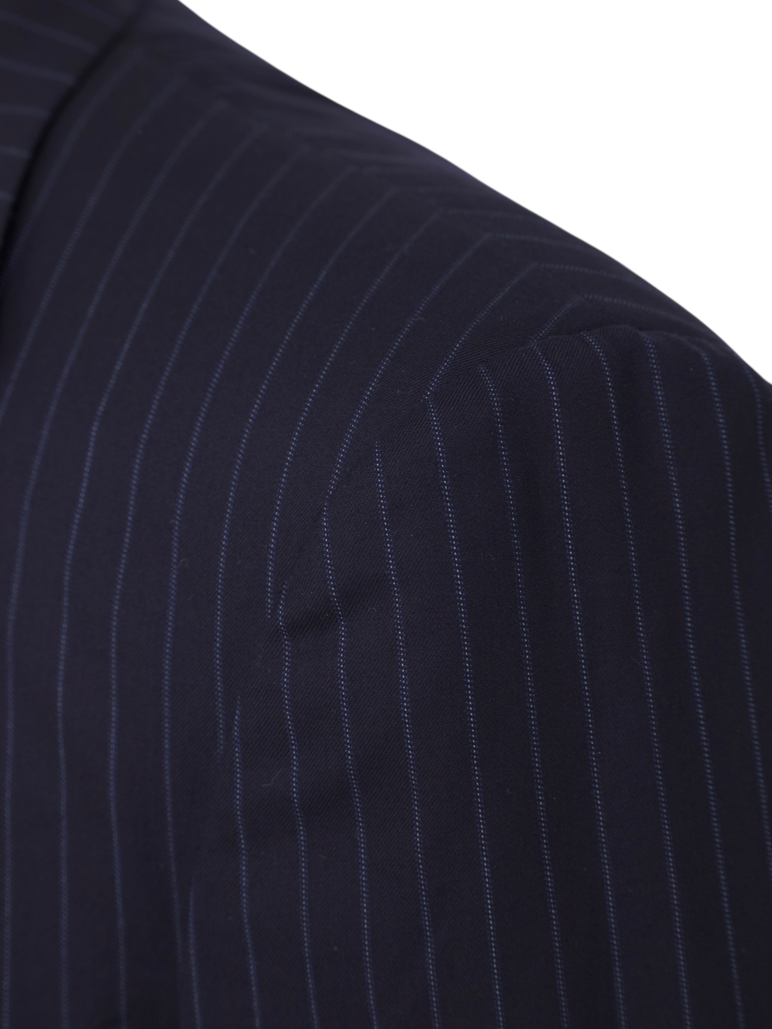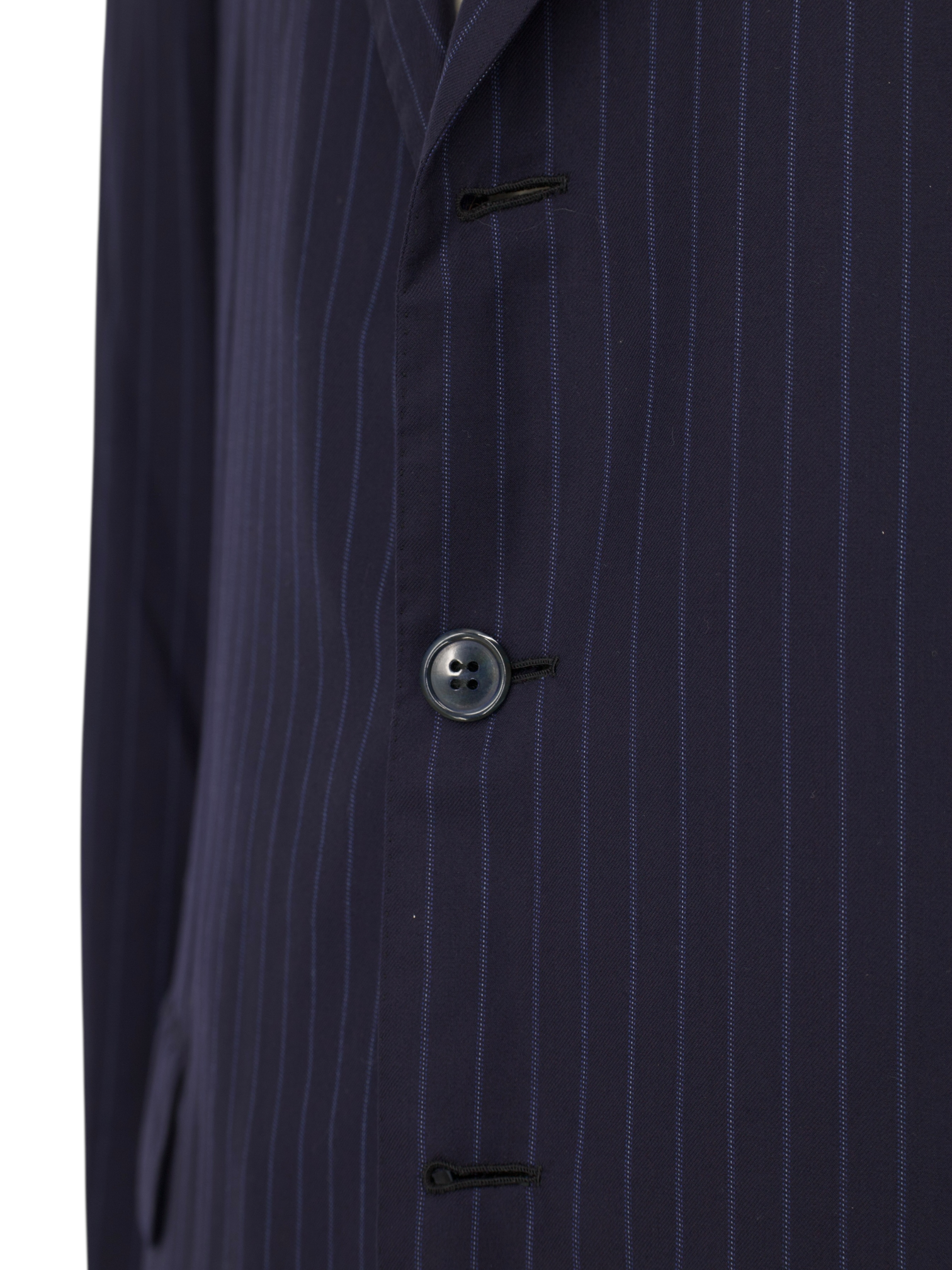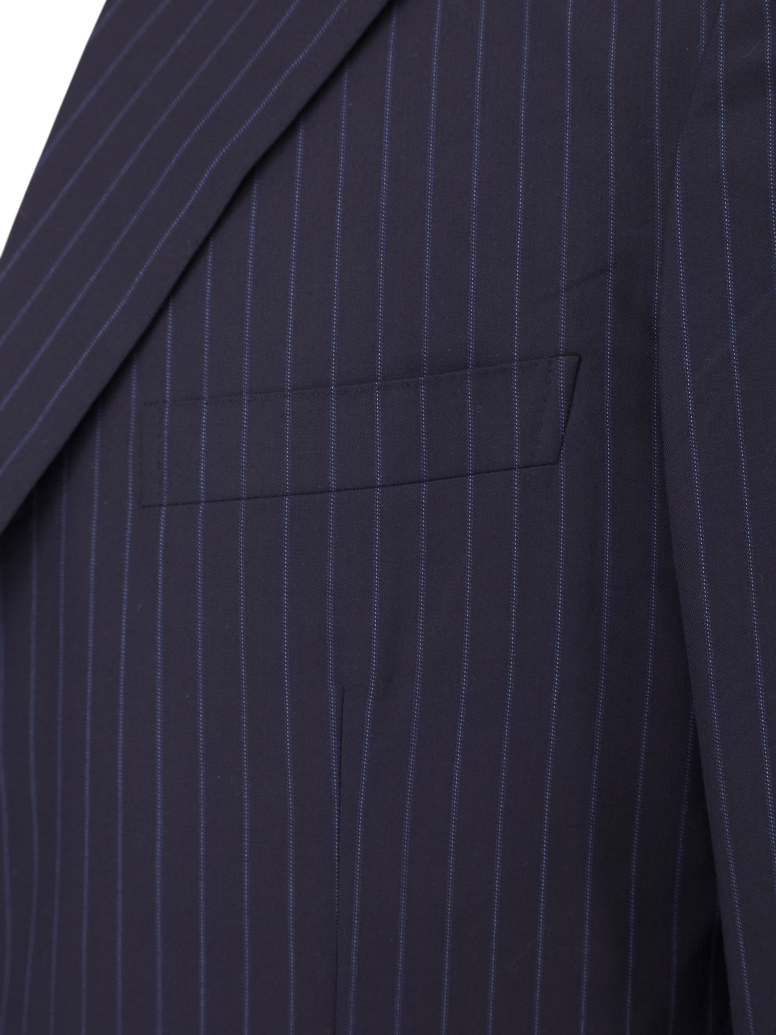 Discover the timeless poise of this Brioni Senato suit, tailored in dark blue Super 150’s wool with a refined pinstripe that speaks to classic elegance with a modern sensibility. The jacket is cut in Brioni’s Senato silhouette, featuring notch lapels, horn buttons, flap pockets, and a fully lined interior for a clean, structured drape. Roman-style shoulders lend a touch of architectural sharpness, while the subtle pinstripe adds definition and verticality without overwhelming the suit’s composed character.