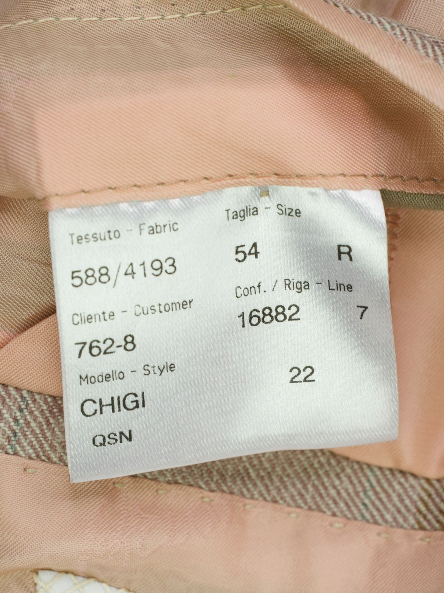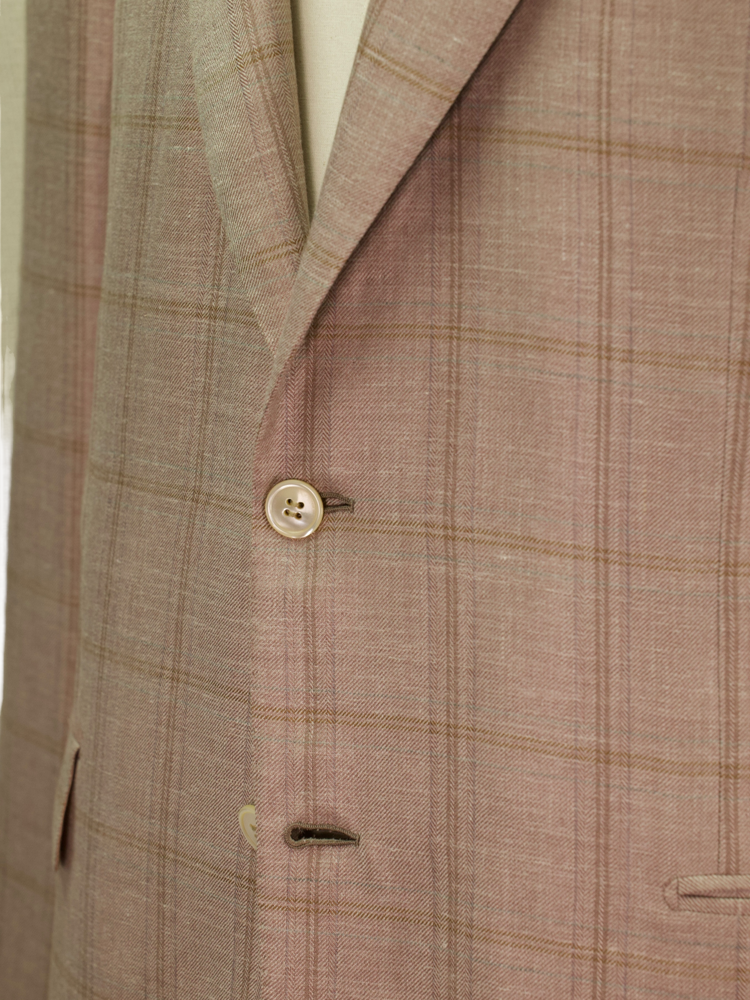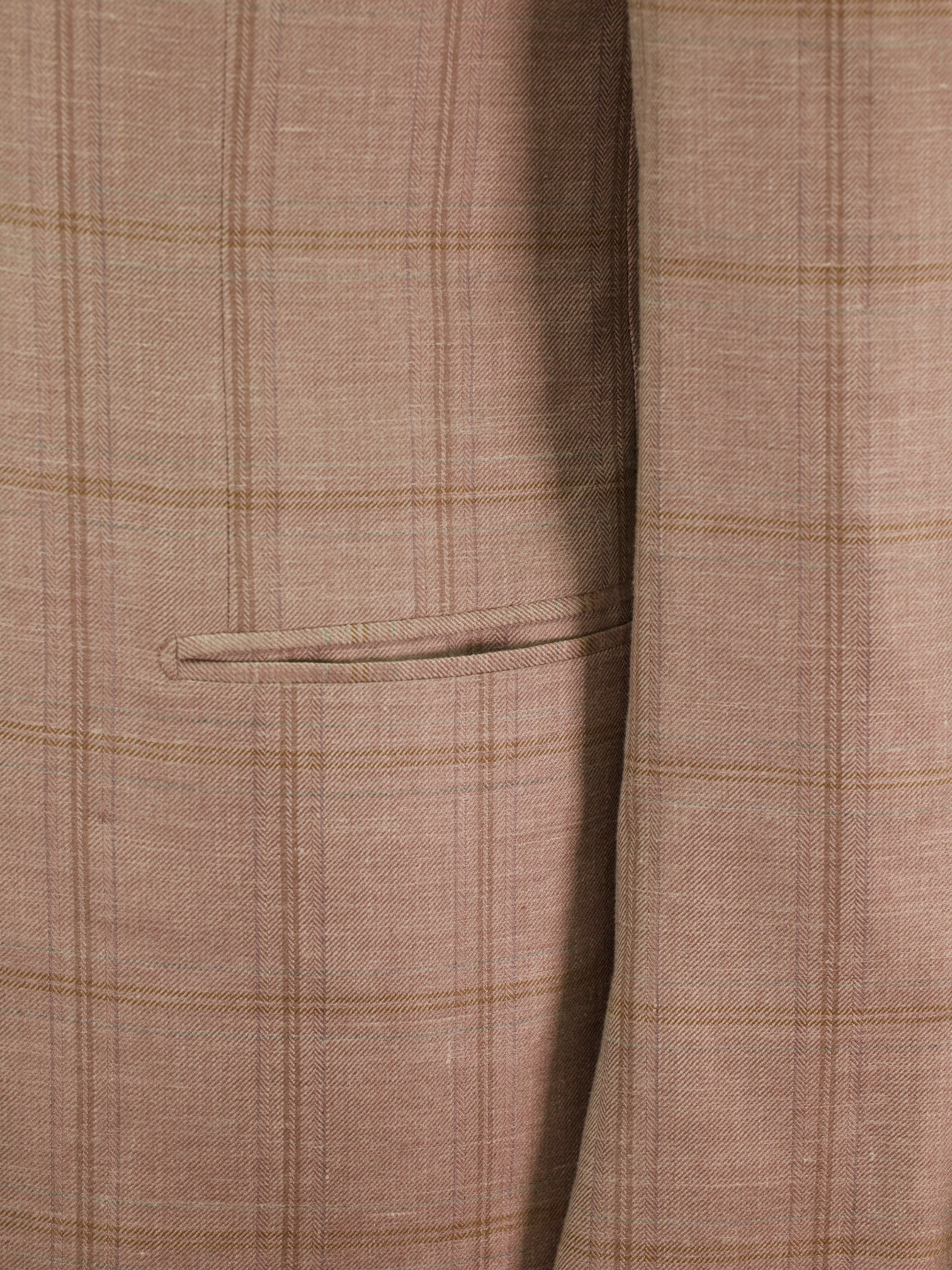 Discover the Brioni Dusty Rose Cashmere, Silk & Linen Windowpane “Chigi” Jacket, tailored in an artfully faded tone that blends elegance with gentle character. The dusty rose base is crossed with a soft windowpane check, creating subtle depth without overwhelming. Notch lapels, a two-button closure, and delicately iridescent mother-of-pearl buttons complete the visual poise. Fully lined for a refined structure, this jacket is shaped in Brioni’s “Chigi” fit—offering a touch more definition than their classic relaxed cuts while retaining unmistakable Roman ease.