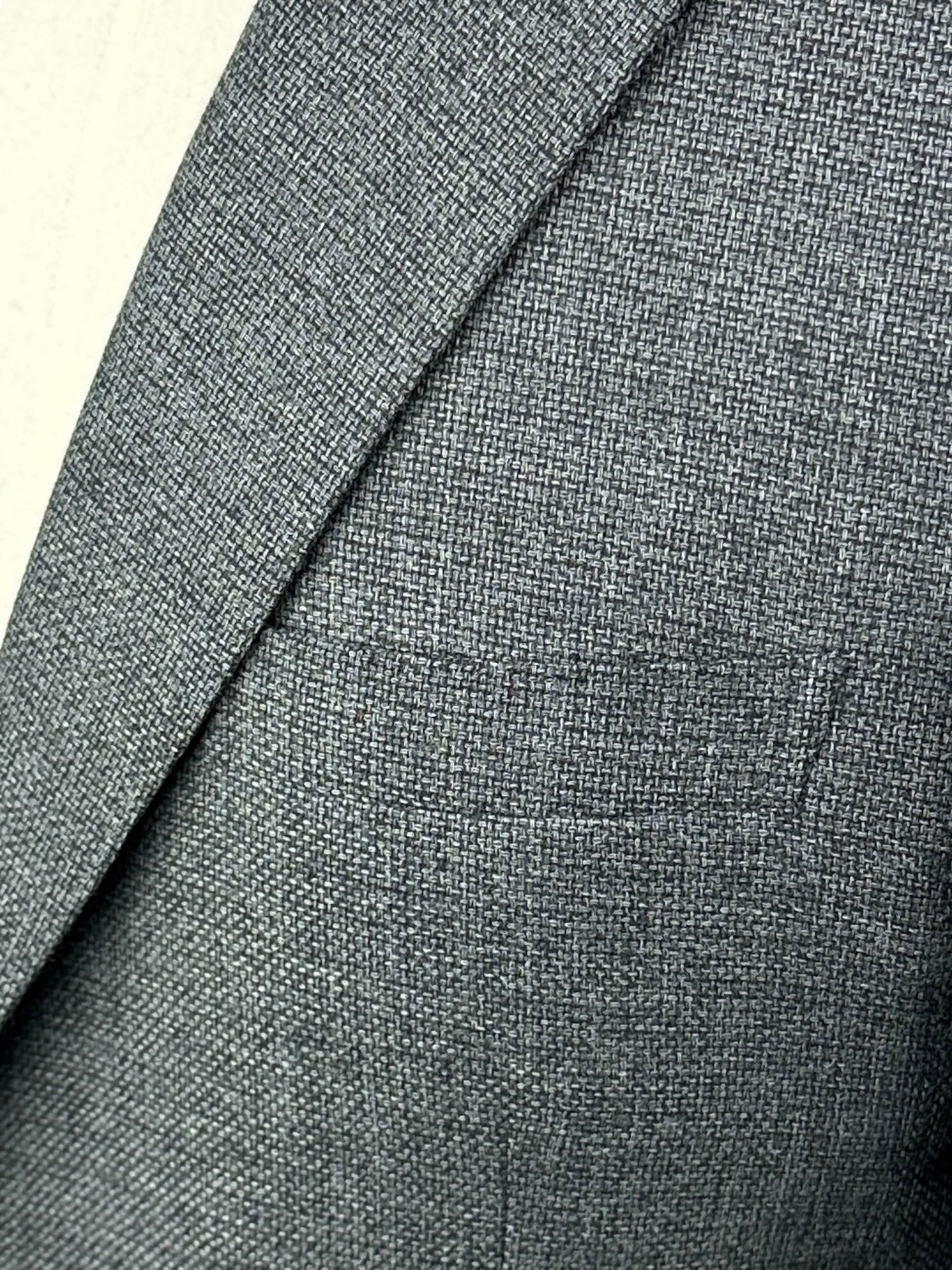 Grey handmade Brioni 'Ravello' Jacket in a hopsack weave. Notch lapels, unlined, expertly constructed from a luxury wool and silk blend with double side vents at the back and a 2-button closure. The notch lapels and welted chest pocket are undeniably classic. Discover the elaborated sartorial details below.