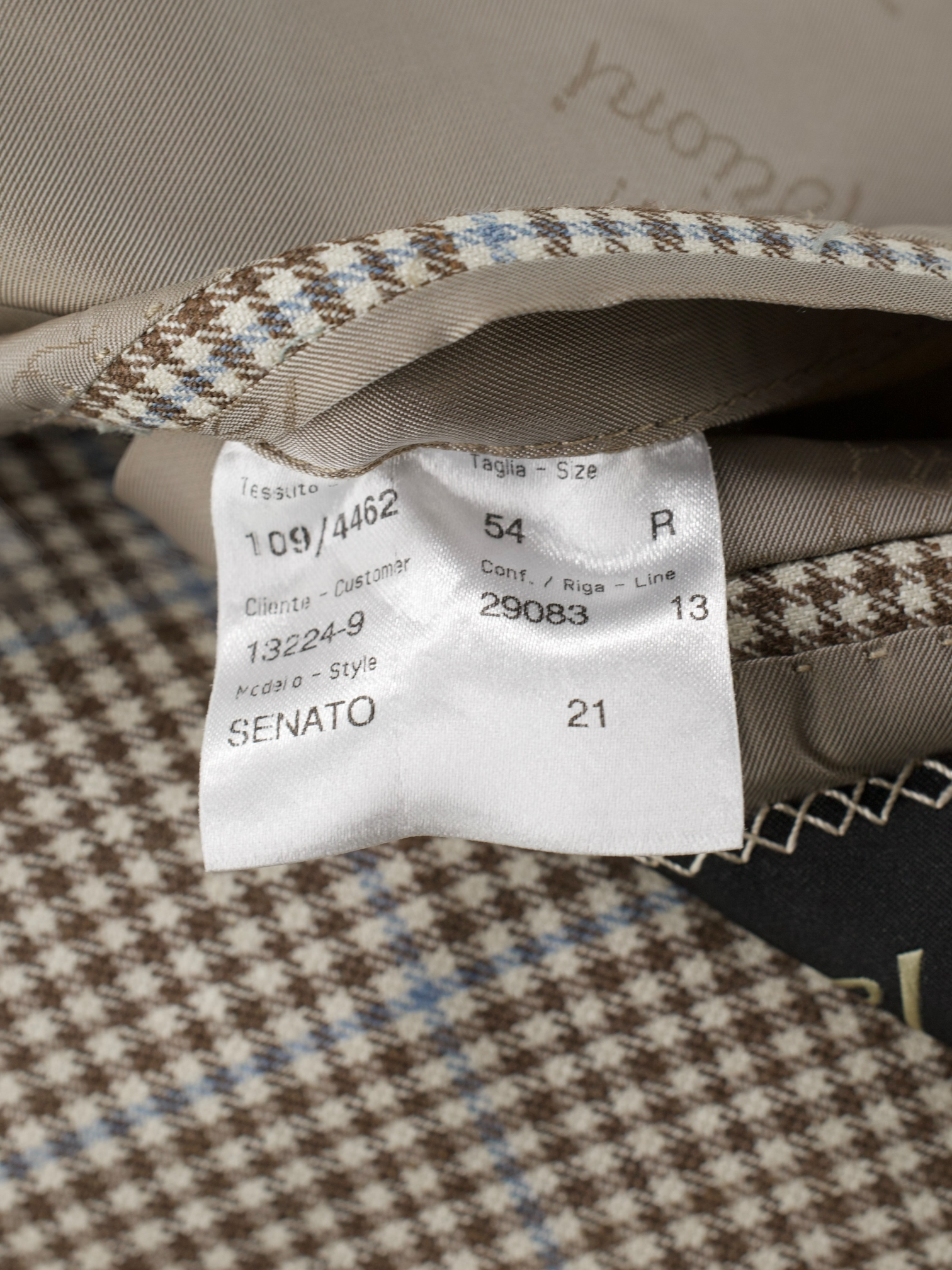 Discover the subtle sophistication of this Brioni Senato jacket, tailored in a refined blend of light brown wool, silk and linen with a soft light blue overcheck. The fabric offers a dry, lightweight hand with just the right amount of texture, making it ideal for transitional dressing. Notch lapels, horn buttons, flap pockets and a fully lined interior speak to Brioni’s signature attention to detail, while the Roman-style shoulders lend the jacket a composed, authoritative shape.