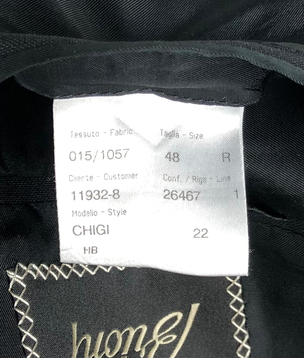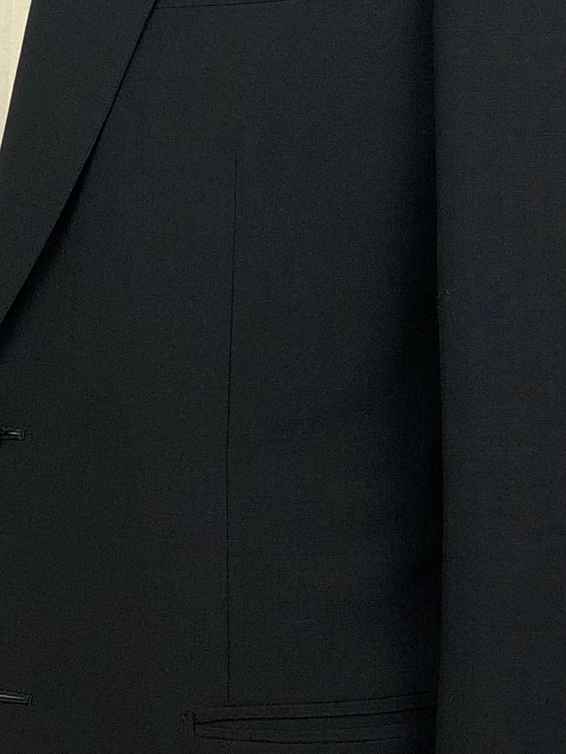 James Bond’ suit - black handmade Brioni suit. Notch lapels, fully lined, expertly constructed from a luxury wool & mohair blend with double side vents at the back and two-button closure to keep the profile neat. The notch lapels and welted chest pocket are undeniably classic. Discover the elaborated sartorial details below.