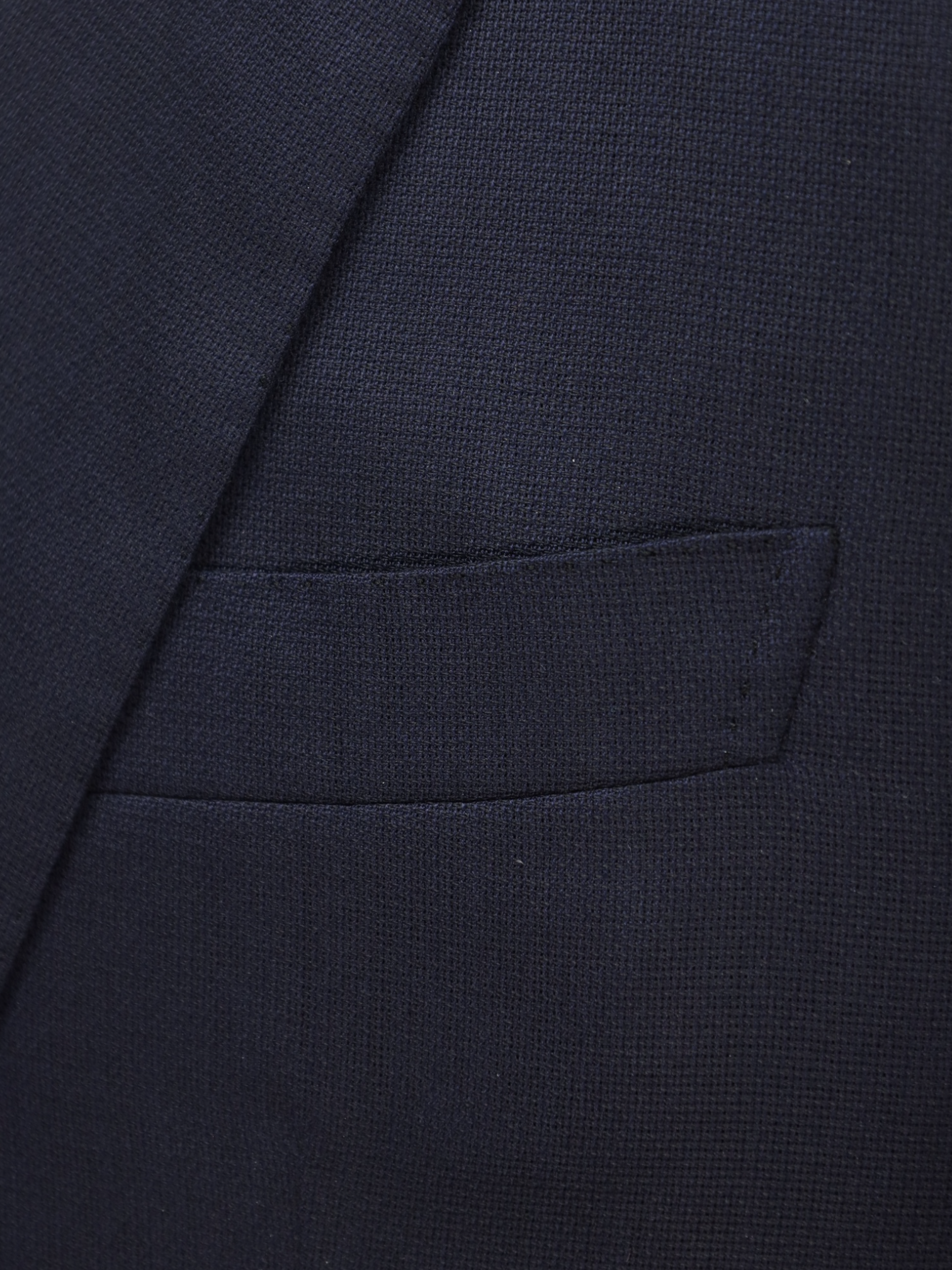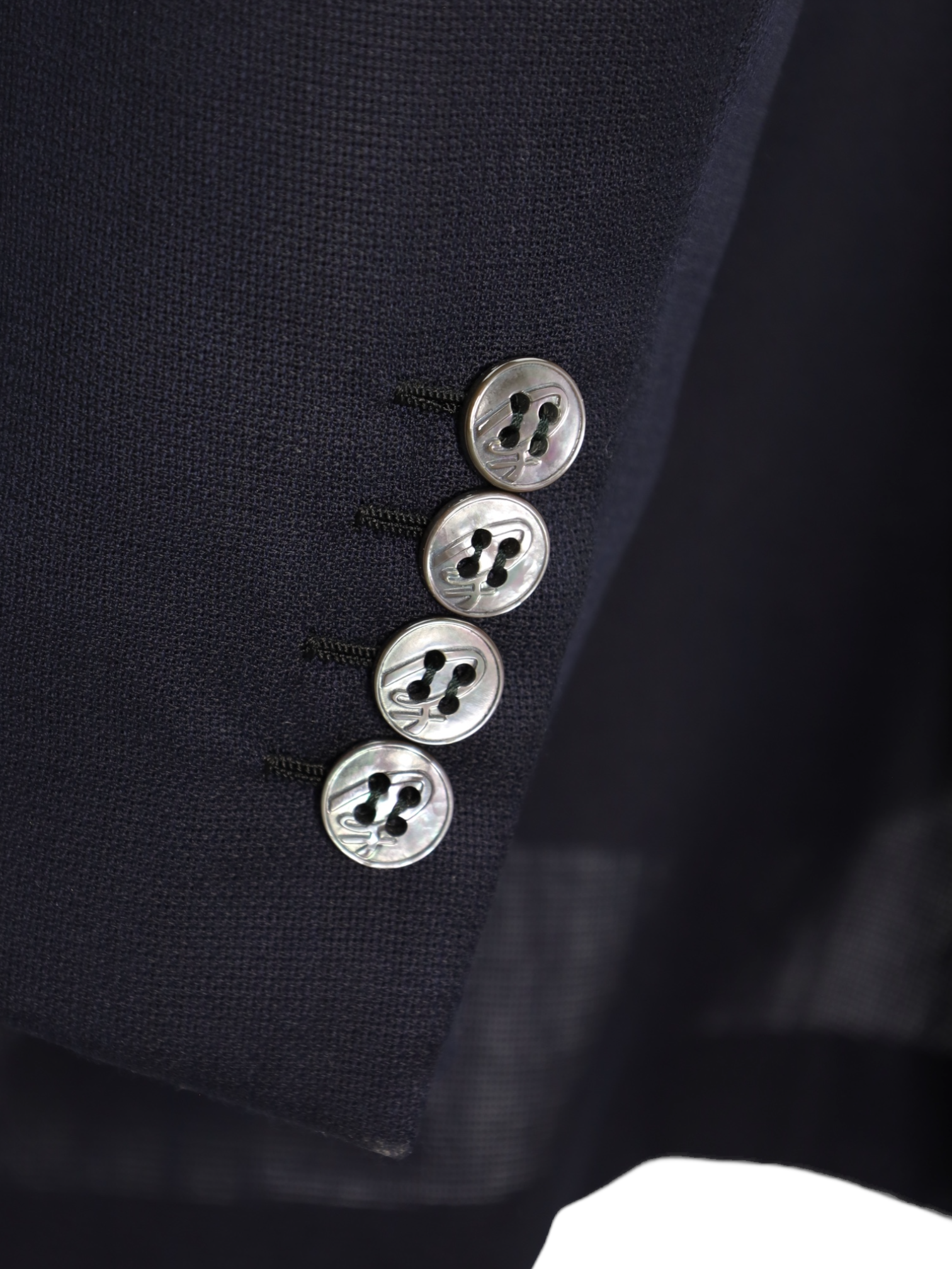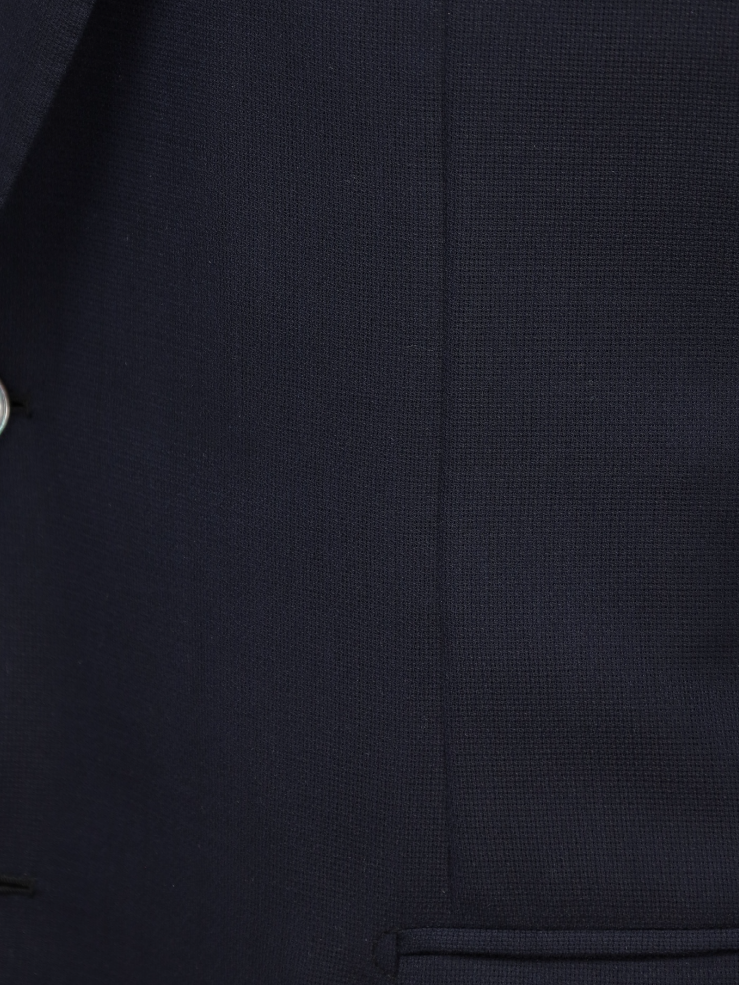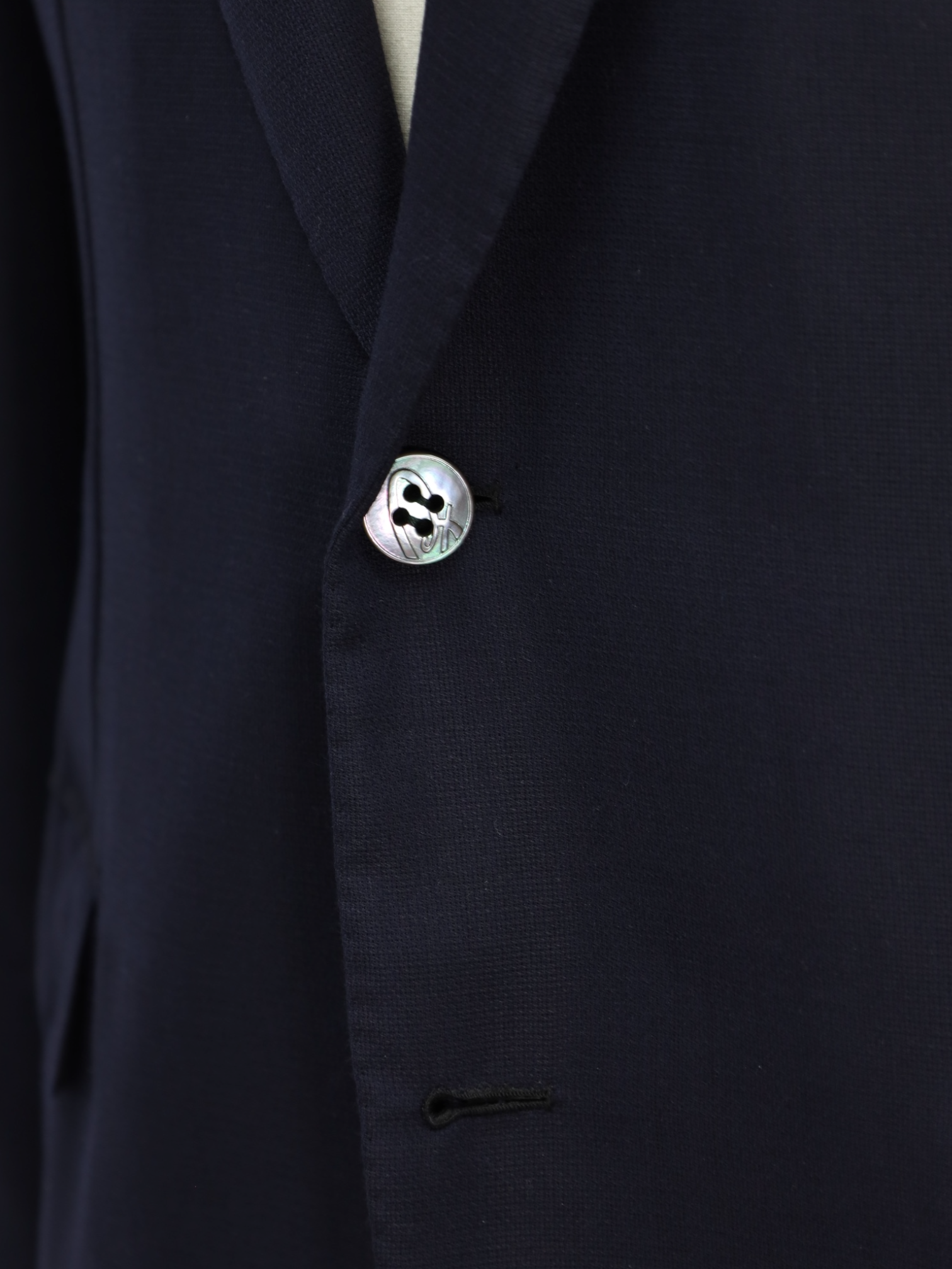 Introducing the Brioni Navy Hopsack Parigi Jacket, a masterpiece of sophisticated tailoring. Crafted from refined hopsack fabric, this jacket offers a durable yet breathable wear, ideal for any season. Its deep navy hue provides a versatile foundation for a variety of styles. Highlighting its luxurious detailing, the jacket features mother of pearl buttons, each intricately engraved with the 'B' from the Brioni logo, adding a subtle signature touch. Perfect for both formal occasions and smart-casual meetings, this jacket exemplifies Brioni's commitment to elegance and quality. Discover the elaborated sartorial details below.