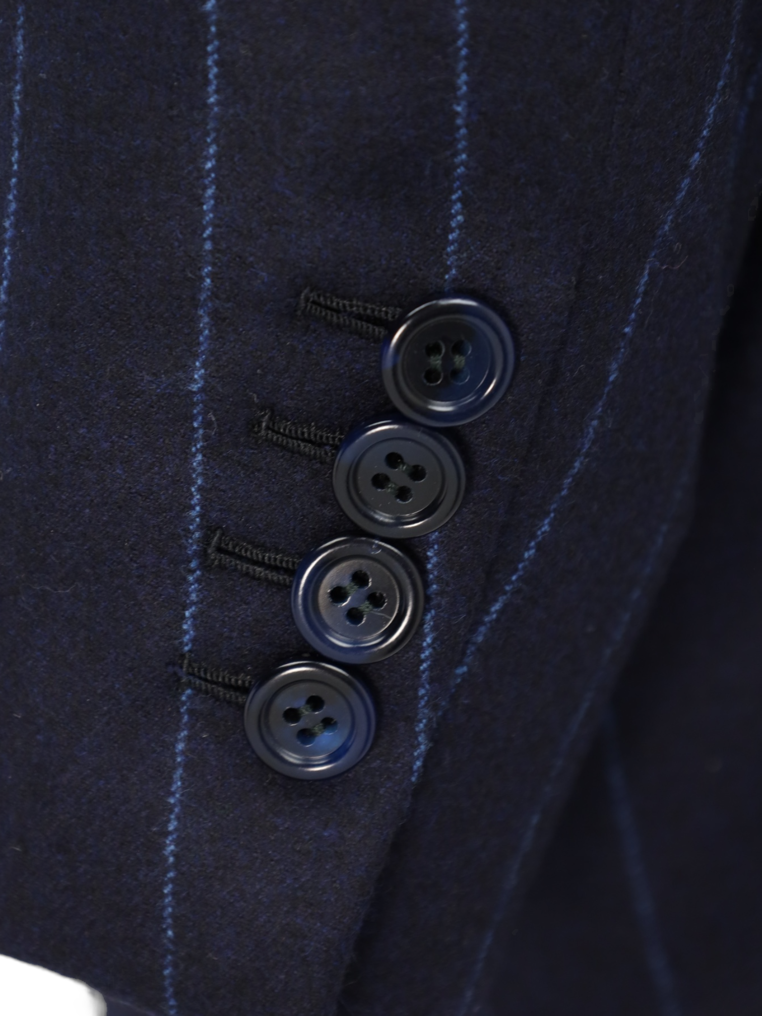 Handmade buttonholes are made using a chain of knotted loops called purl stitches that make them strong and visually distinctive. It takes about five seconds to sew a regular buttonhole with a machine – a single handmade buttonhole takes about 10 minutes to sew.