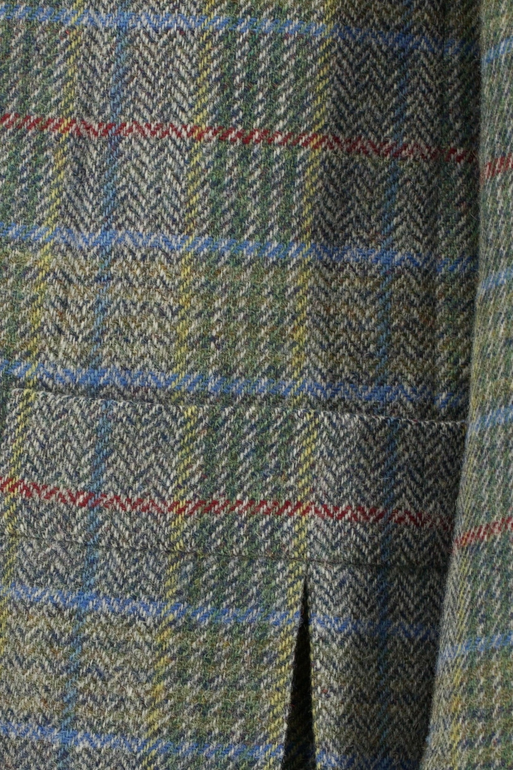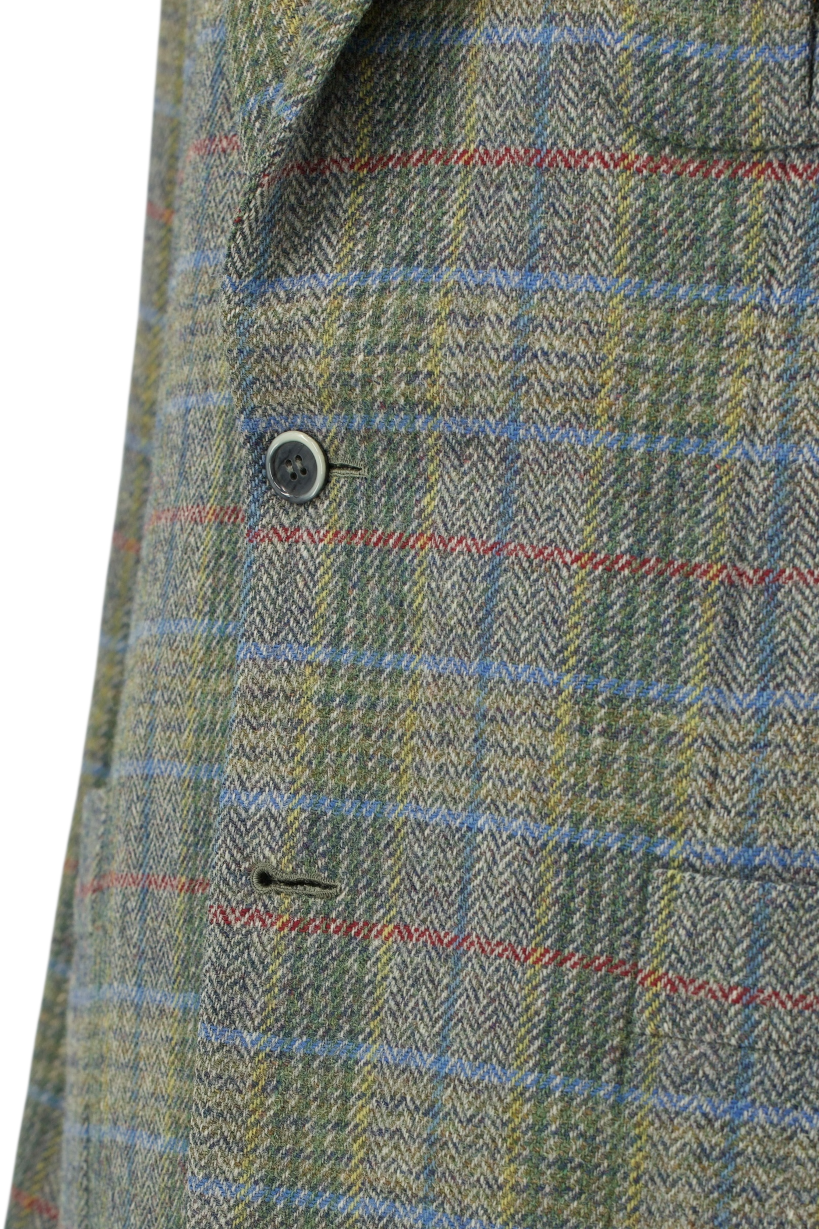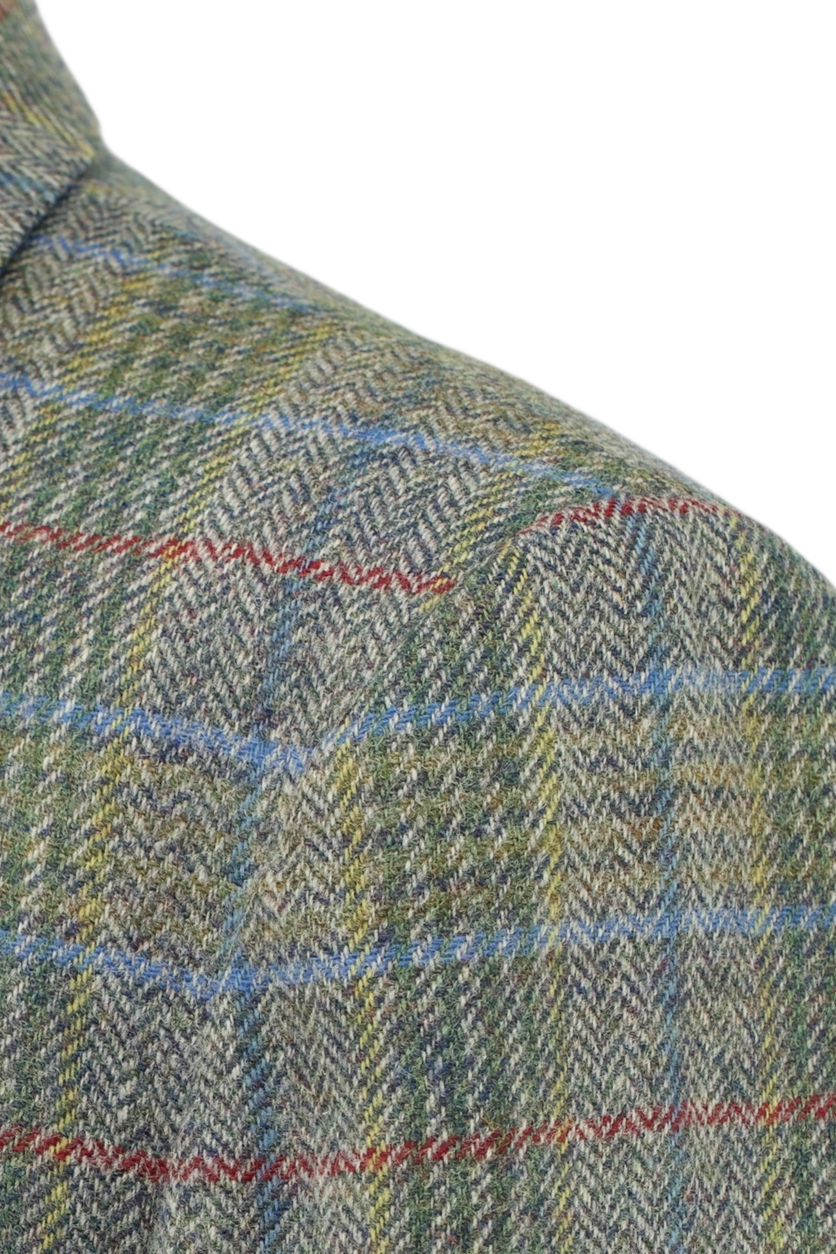 Discover the Brioni sage green and blue tweed-wool Norfolk jacket, a bold yet beautifully balanced piece that brings playful energy to traditional fieldwear. The base cloth is a classic dry tweed, woven in sage green with a deep green herringbone pattern that sets a quiet foundation. Over it runs a confident overcheck in light blue, red, and yellow. Visually busy, yes, but in a way that feels deliberate and entirely in tune. Notch lapels, a functional throat tab, and an extra buttonhole on the left lapel nod to the jacket’s sporting roots, while patch bellows pockets on the chest and hips offer both symmetry and utility. Light grey nubuck elbow patches add a tactile contrast that works just as well in the city as it does in the countryside.