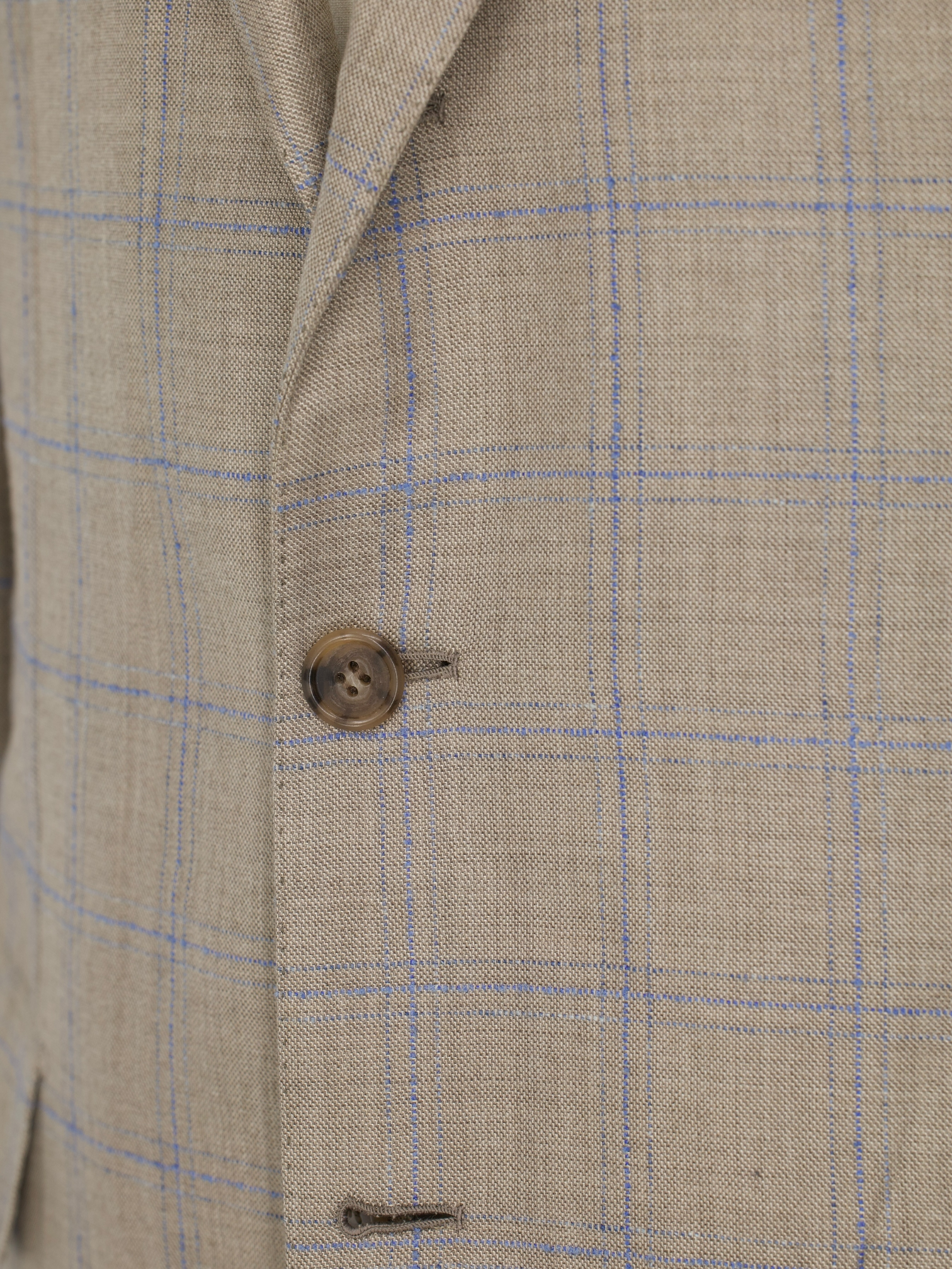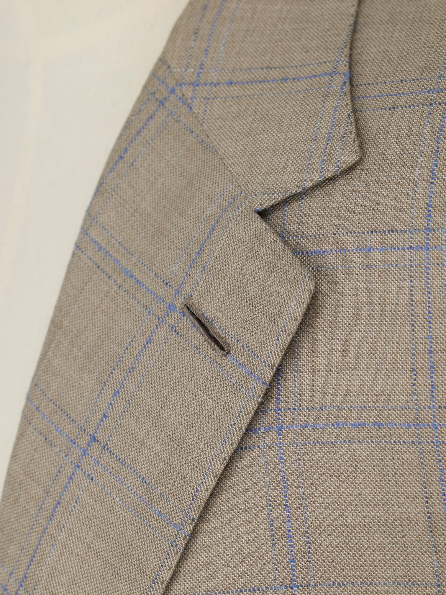 Discover the soft refinement of this Brioni Senato jacket, tailored in a distinctive taupe wool and shantung silk blend with a delicate light blue windowpane. The cloth combines the natural breathability of wool with the dry, slightly slubbed texture of shantung silk, offering visual interest and a subtle sheen without overwhelming the understated palette. Designed with notch lapels, flap pockets, horn buttons, and a fully lined interior, the jacket is shaped with Brioni’s signature Roman-style shoulders for a composed, elegant structure.