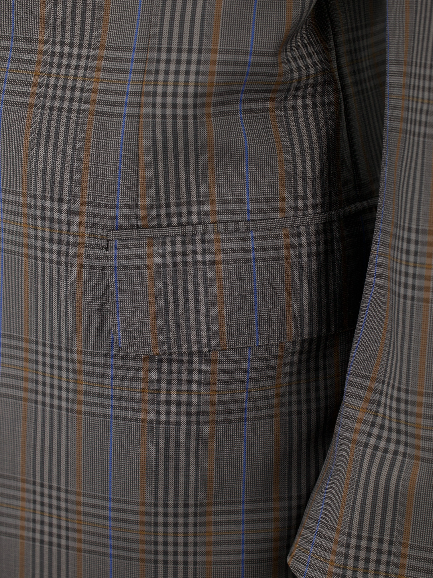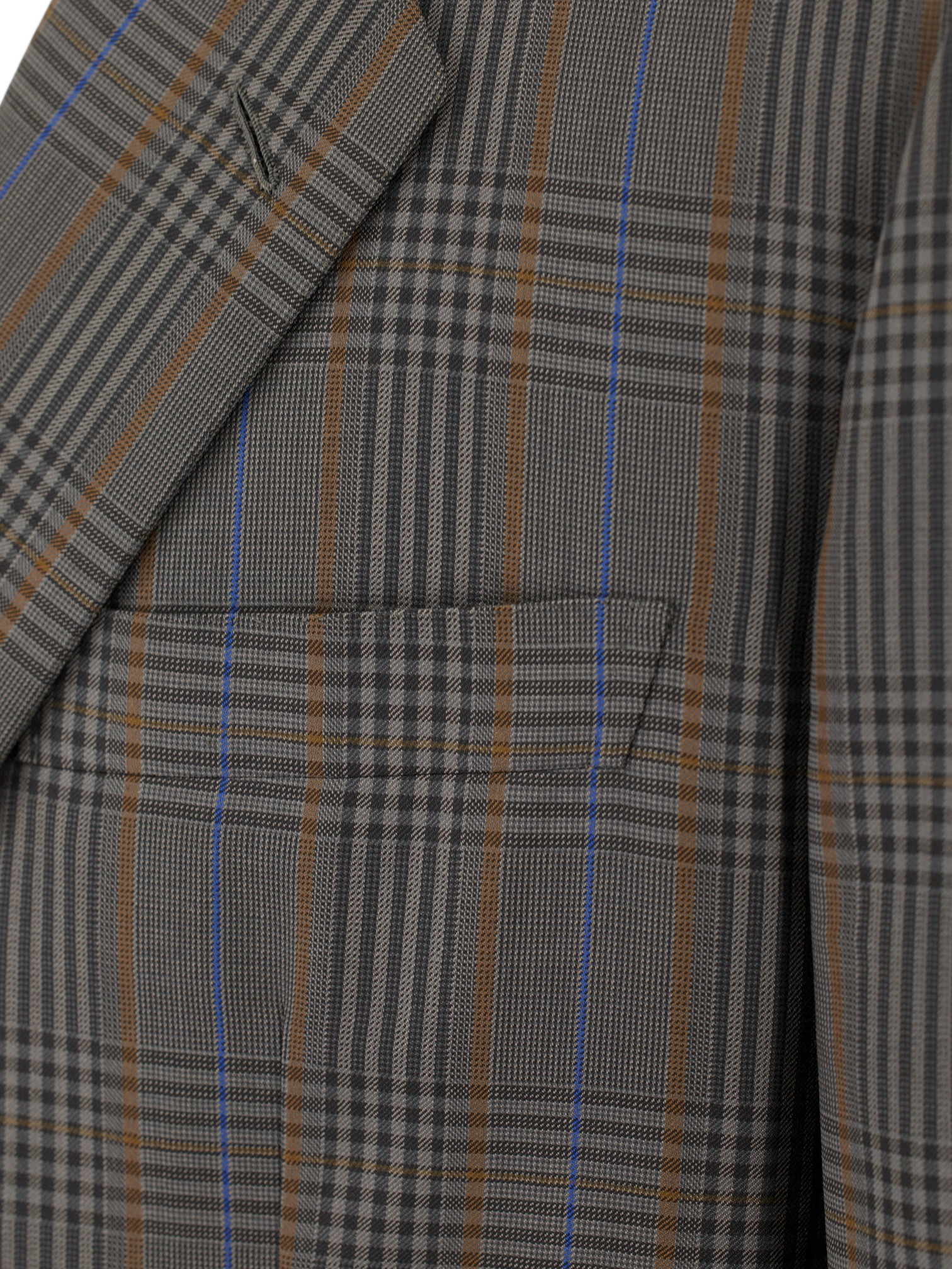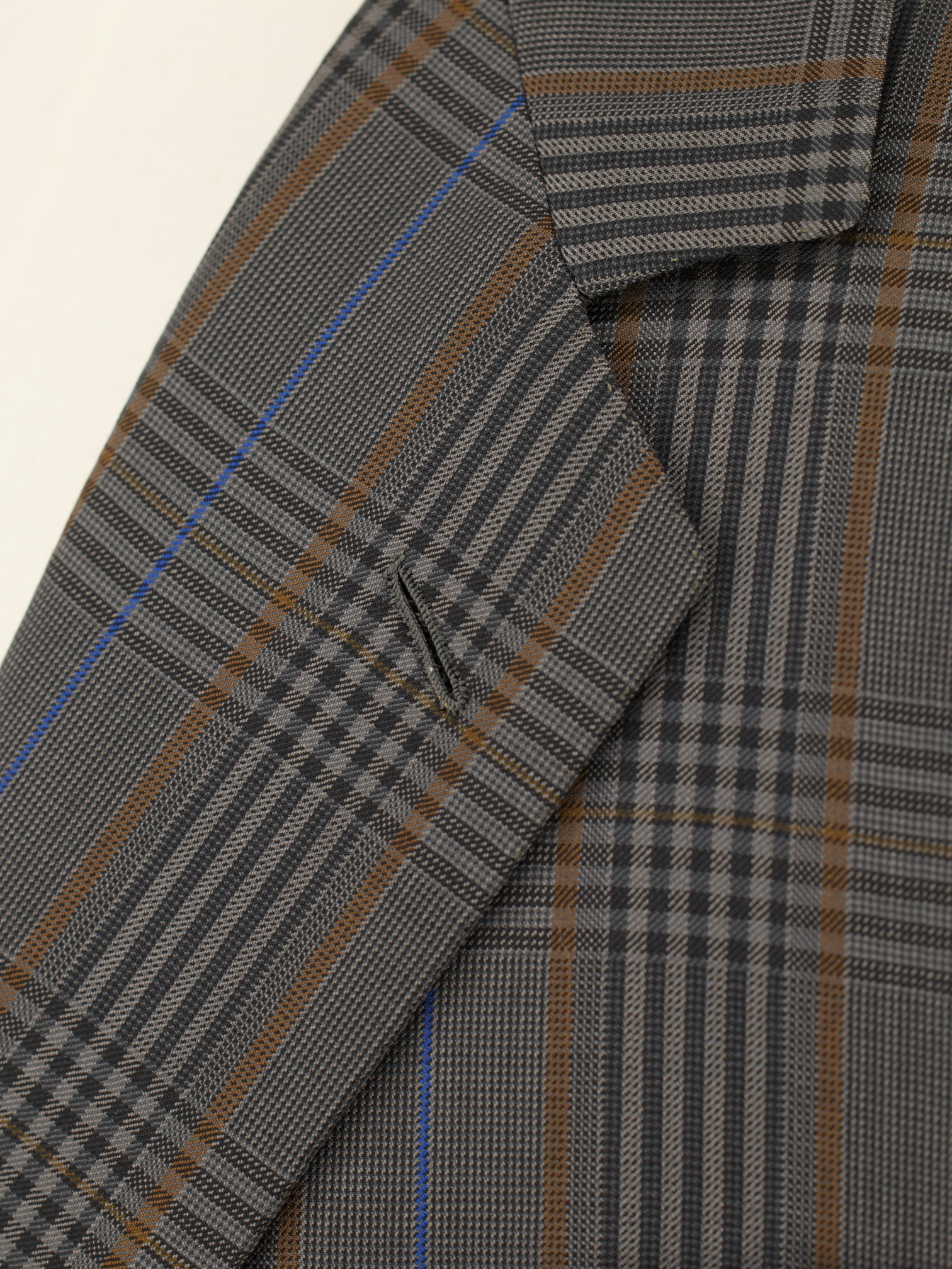 Discover the refined ease of this Brioni jacket, tailored in a warm taupe wool with a crisp, breathable handle that lends itself beautifully to transitional dressing. The surface is layered with a deep brown glenplaid, overlaid by mocca and azure blue checks that give the pattern a soft depth without overpowering the palette. It features low-gorge notch lapels and lightly padded Roman shoulders that create a clean, sculpted silhouette. Flap pockets keep the look grounded, while the half lining ensures comfort and ventilation throughout the day.