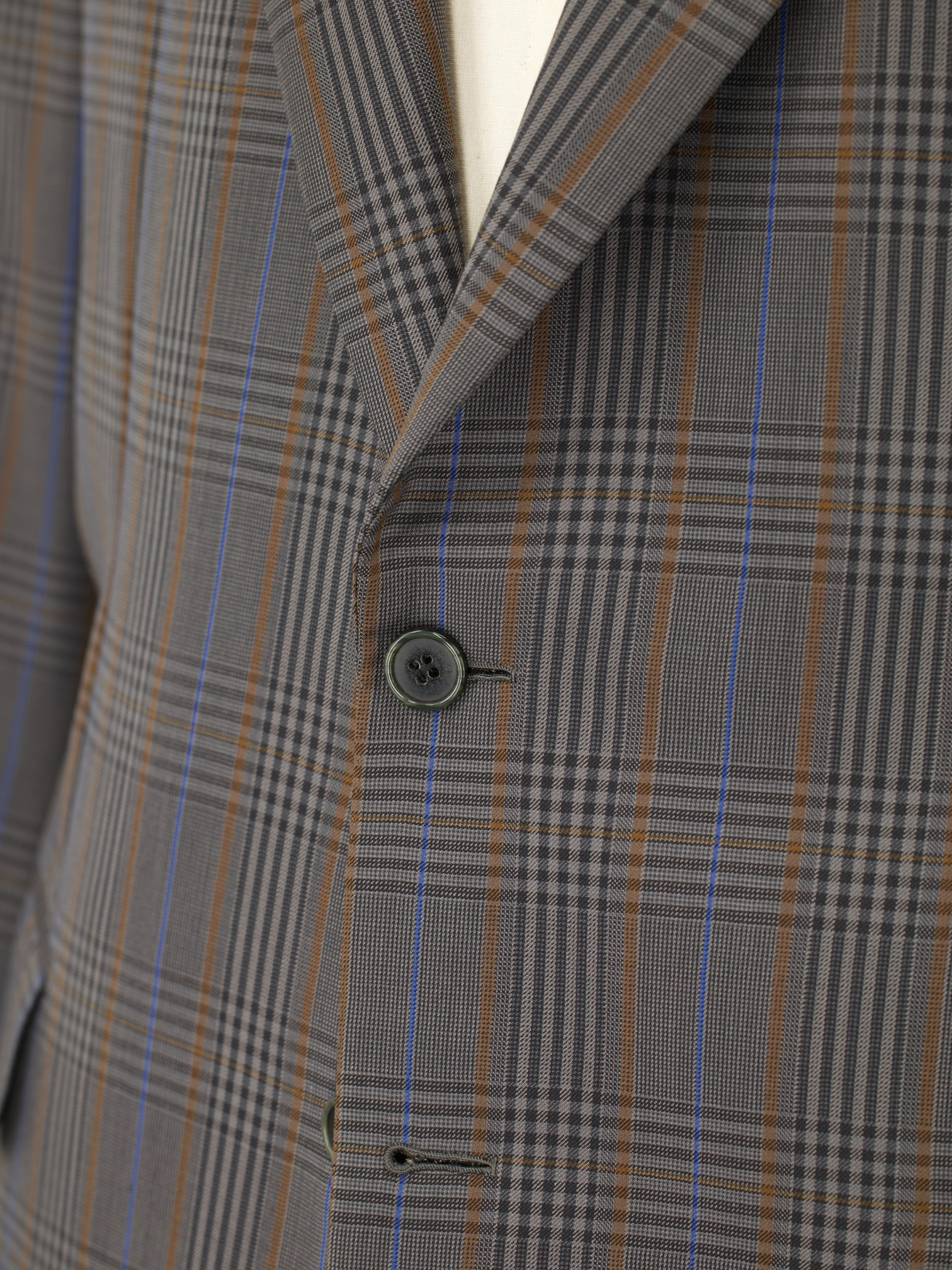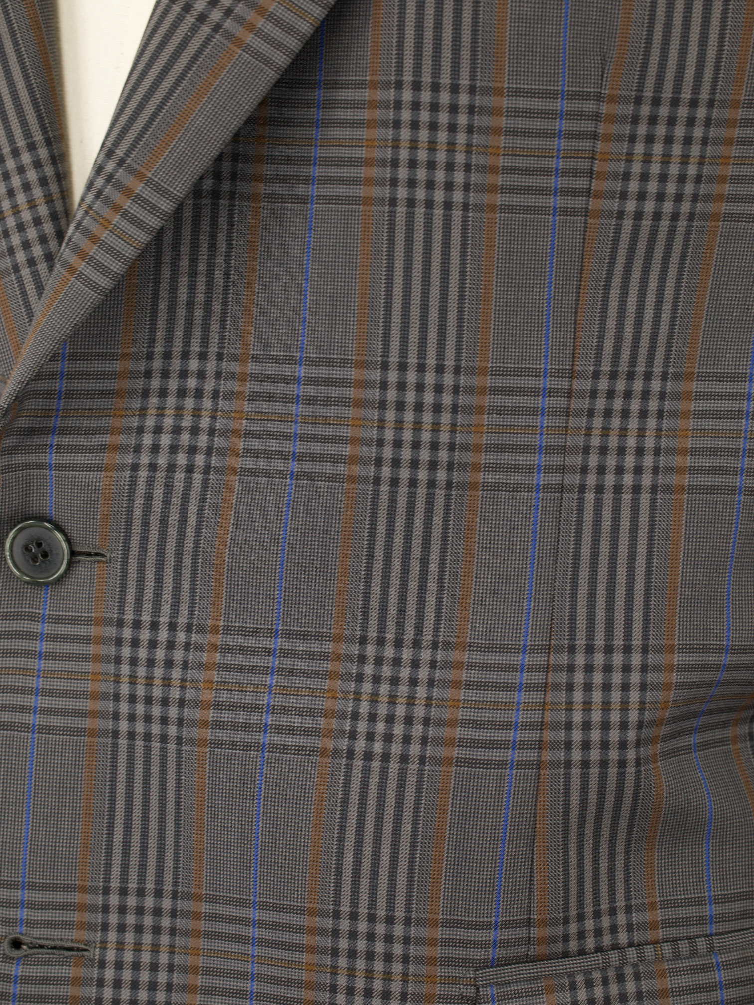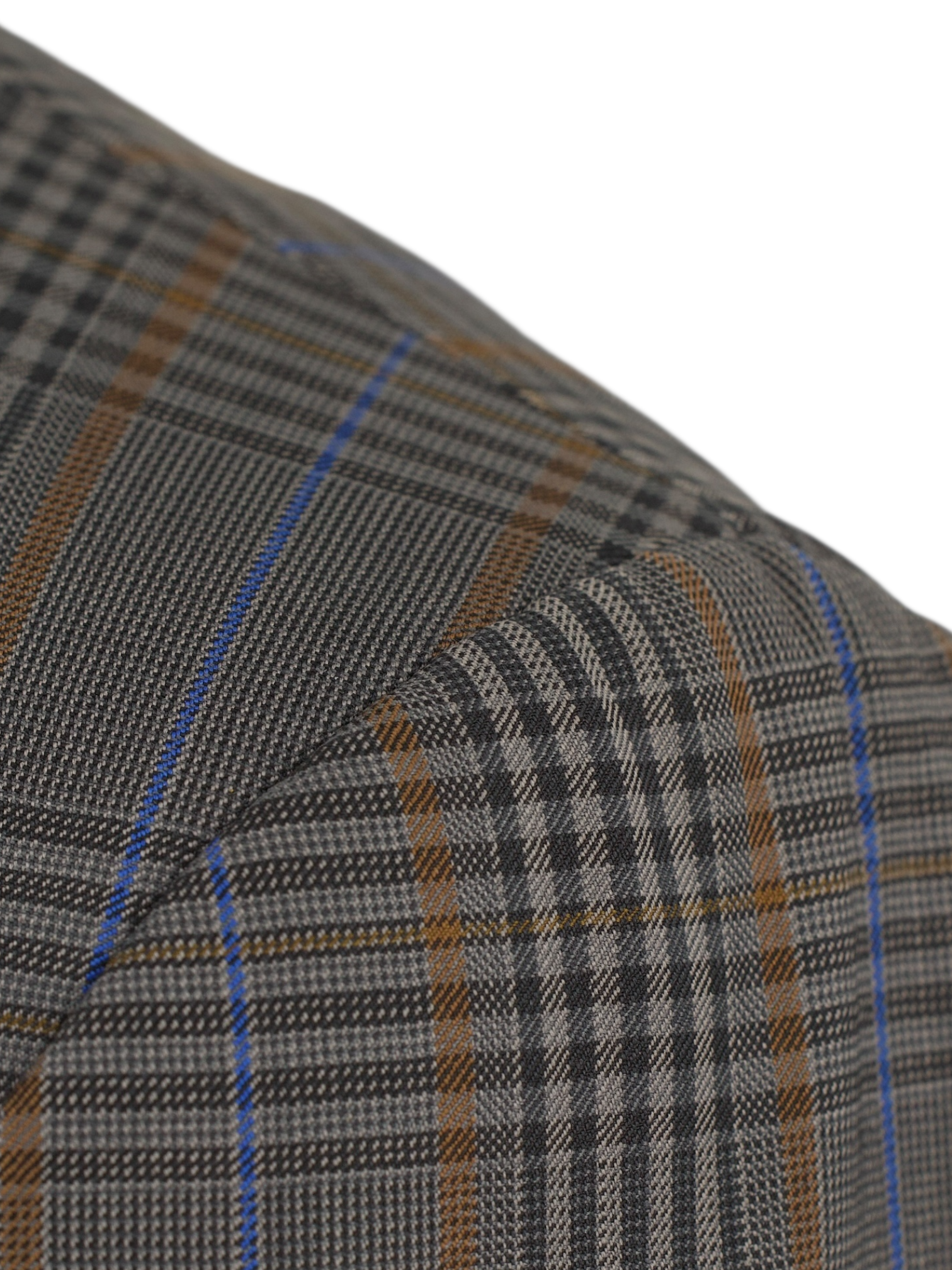 Discover the refined ease of this Brioni jacket, tailored in a warm taupe wool with a crisp, breathable handle that lends itself beautifully to transitional dressing. The surface is layered with a deep brown glenplaid, overlaid by mocca and azure blue checks that give the pattern a soft depth without overpowering the palette. It features low-gorge notch lapels and lightly padded Roman shoulders that create a clean, sculpted silhouette. Flap pockets keep the look grounded, while the half lining ensures comfort and ventilation throughout the day.