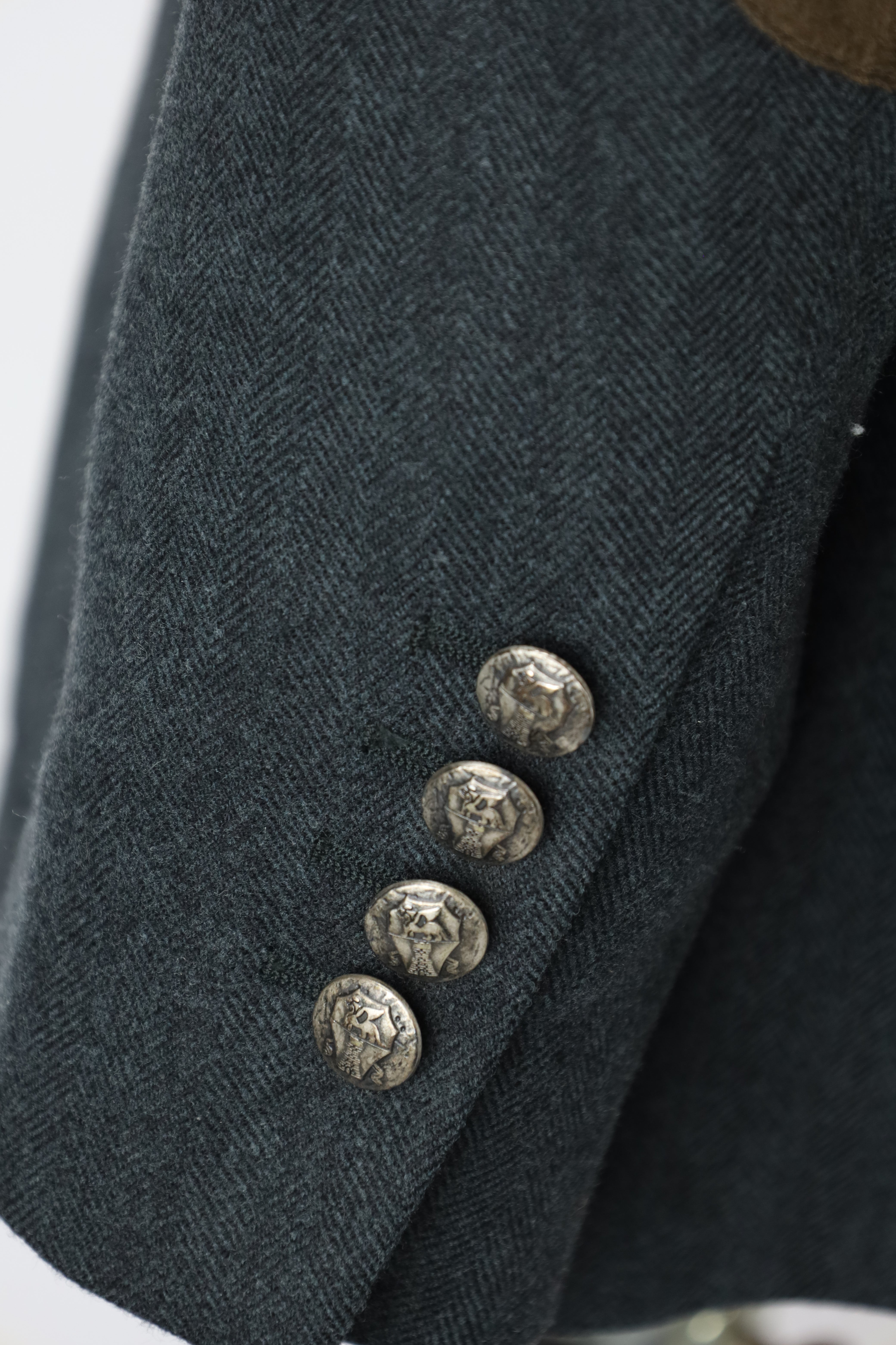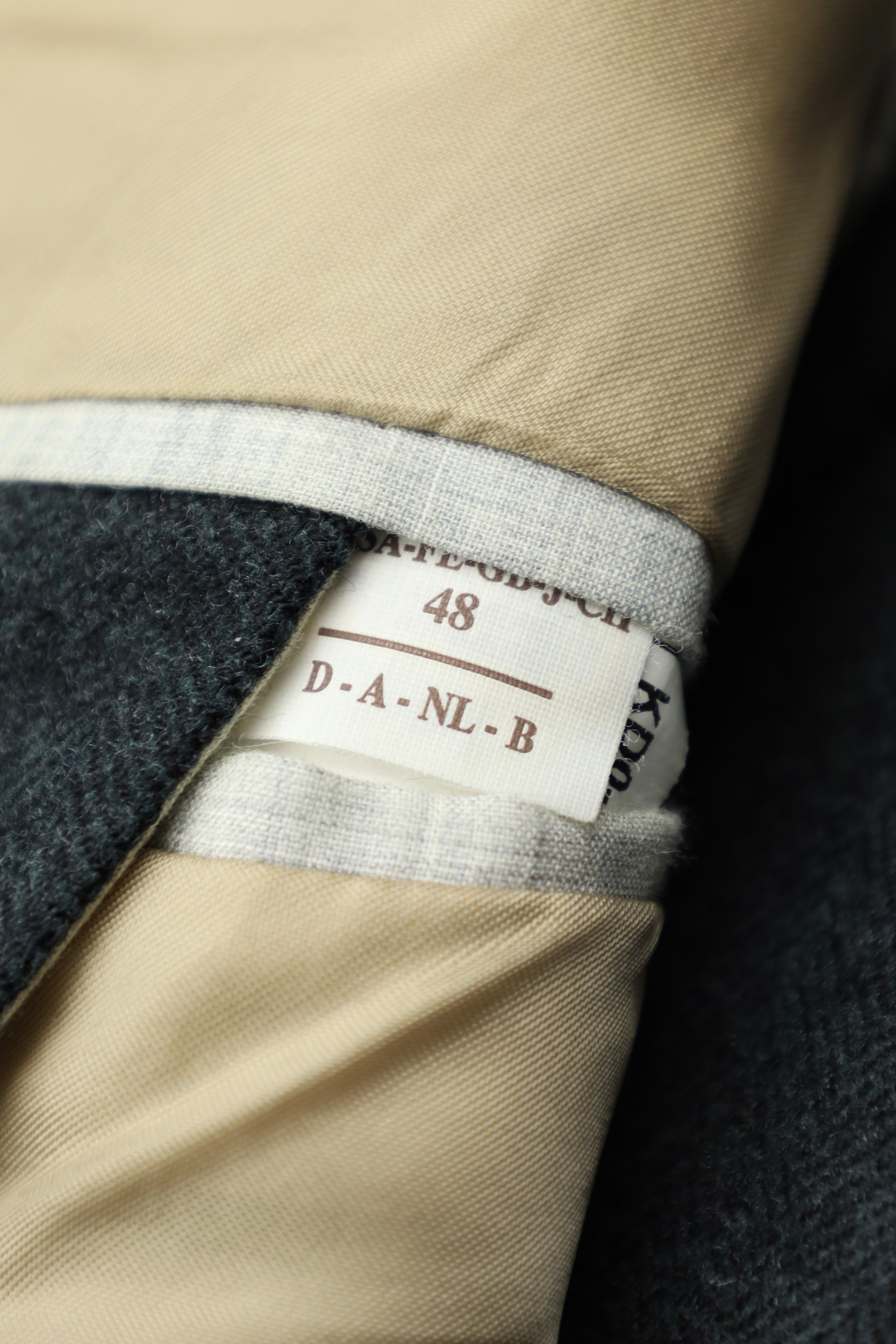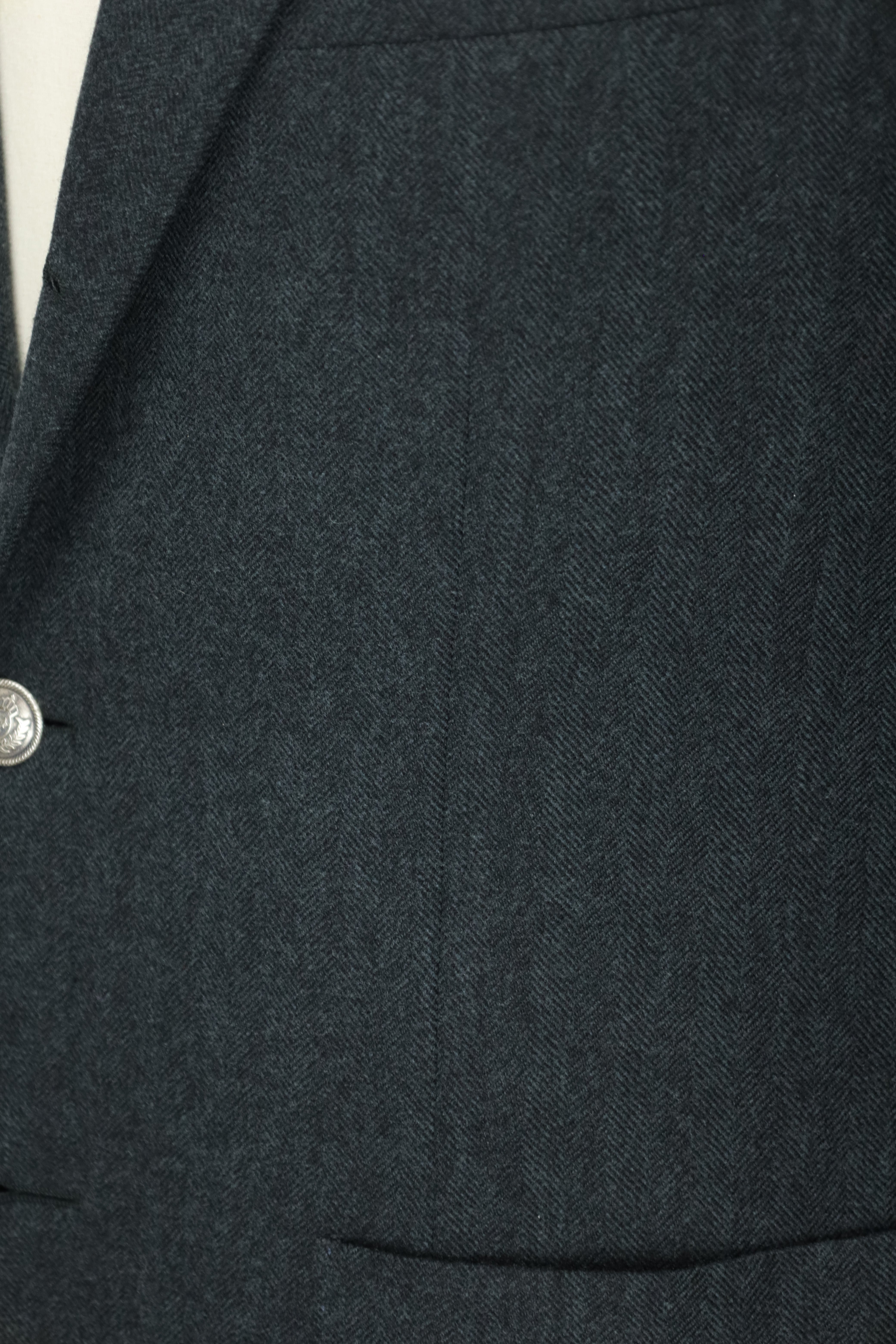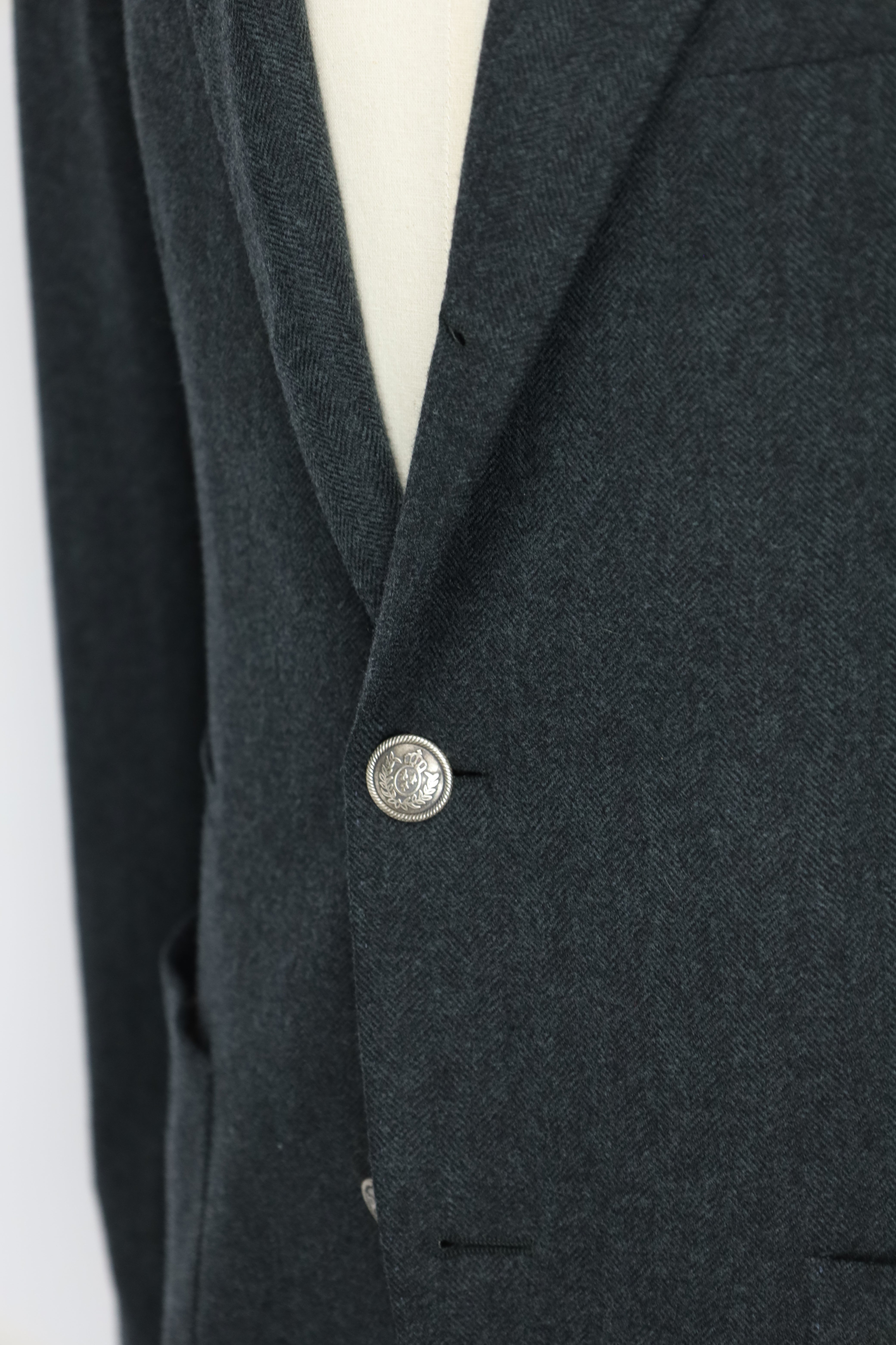 The Brunello Cucinelli Dusk Green Wool & Cashmere Herringbone Jacket is tailored with peak lapels and adorned with brown suede elbow patches, adding a touch of elegance and distinction. It features metal logo-engraved buttons and a personal name tag inside, offering a unique personal touch. The jacket is half-lined, ensuring comfort and ease of movement, making it a perfect blend of luxury and practicality for sophisticated wardrobes. Discover the elaborated sartorial details below.