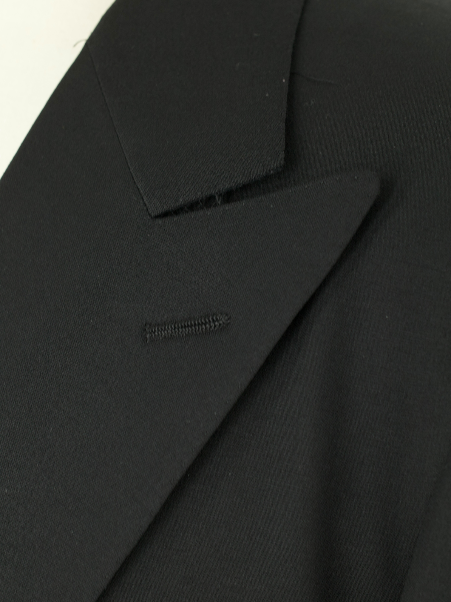 The ceremonial lounge jacket represents a contemporary alternative to the classic jacquet, retaining its sense of gravitas but with a simplified, less elongated cut. The peak lapels emphasize formality, while the canvassed structure ensures sharp lines and a clean silhouette throughout the day. Canali’s tailoring is evident in every detail, from the precise shoulder construction to the crisp finishing of the pockets and buttonholes. The fine wool fabric was chosen for its ability to balance comfort with formality, making the jacket appropriate for extended wear at weddings or formal receptions.