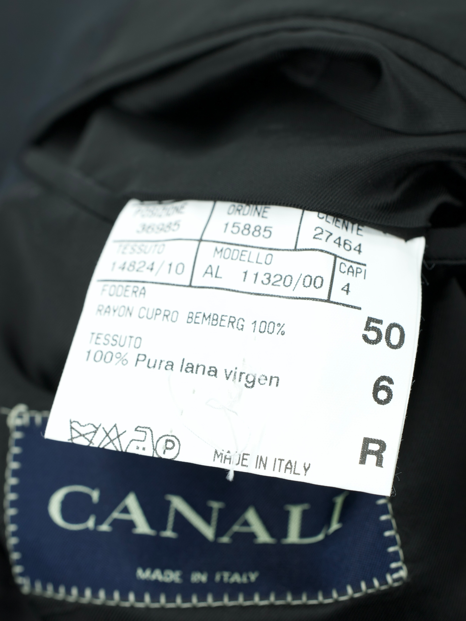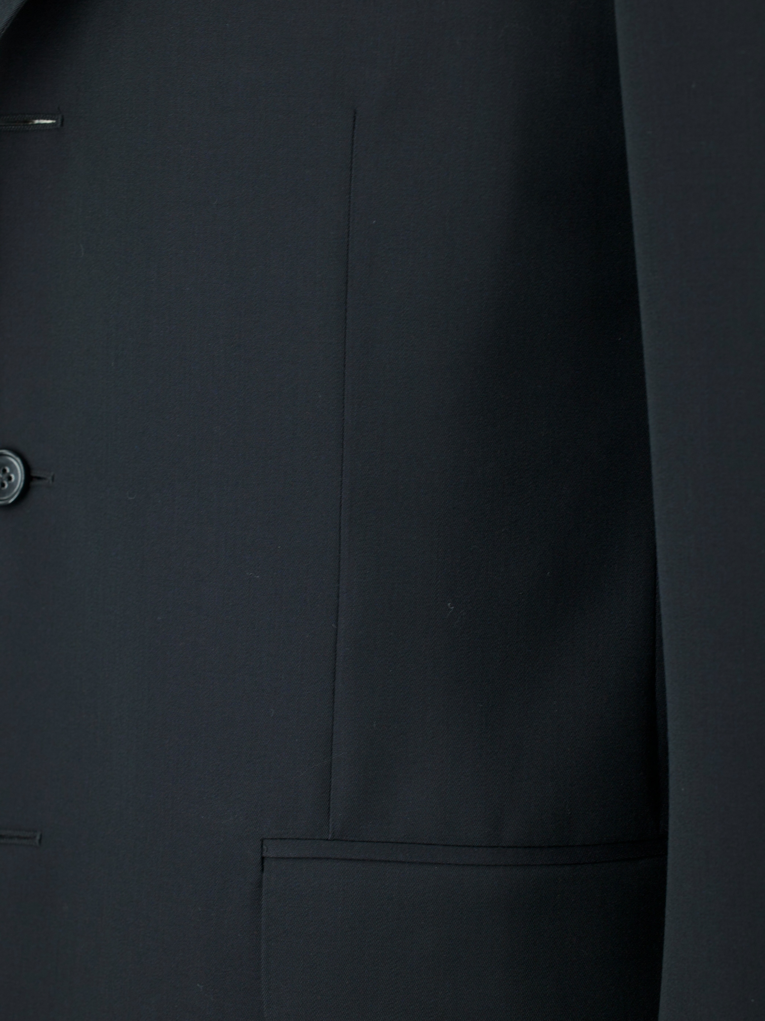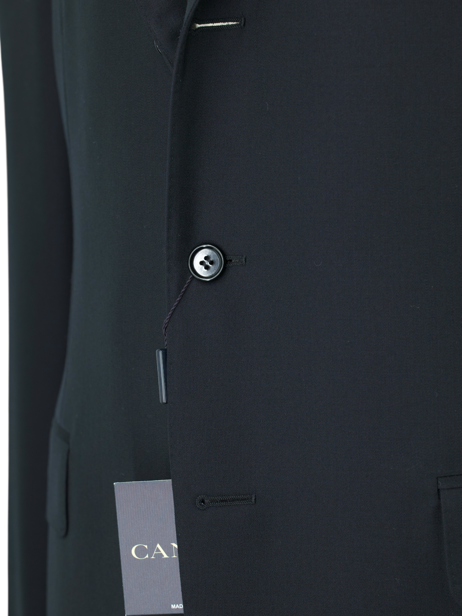 Discover the timeless versatility of this Canali jacket, tailored from Super 120’s wool in a plain black weave that feels refined yet understated. The cloth has a smooth finish with just the right amount of structure, making it suitable for both formal and business settings. Designed with notch lapels, flap pockets, and a fully lined interior, it features Canali’s signature 2.5 button closure, where the lapel rolls gently over the top button to create a softer line across the chest.