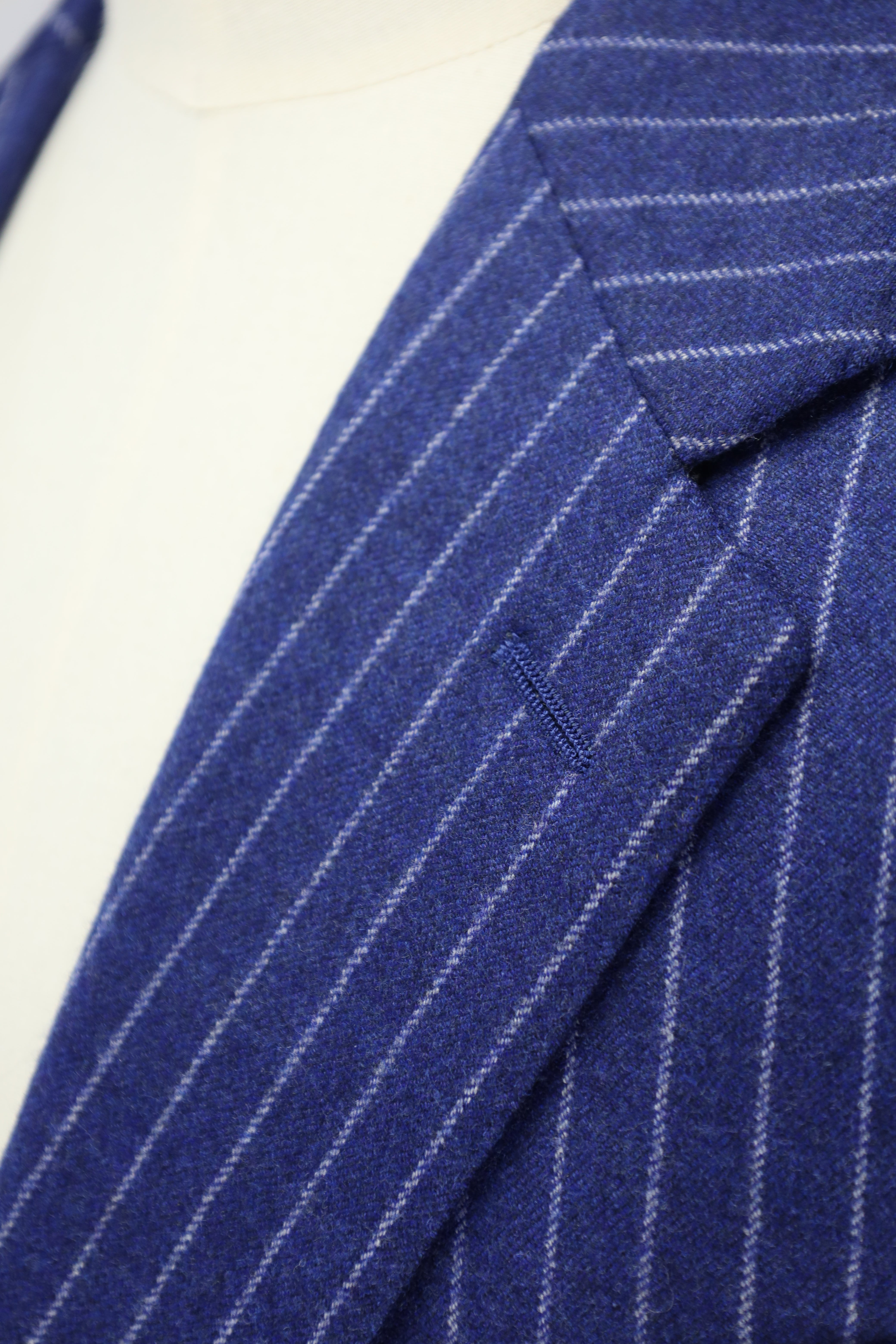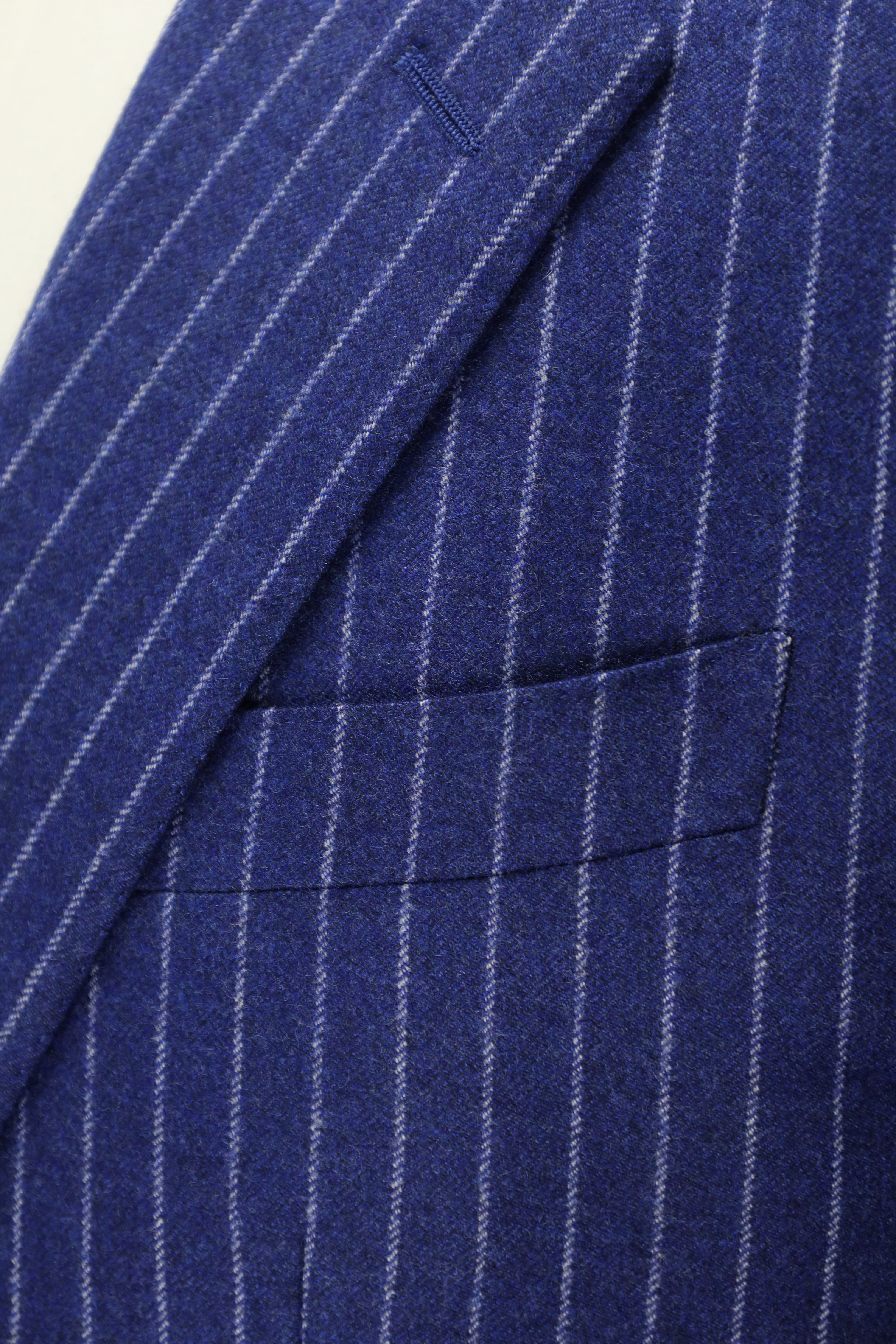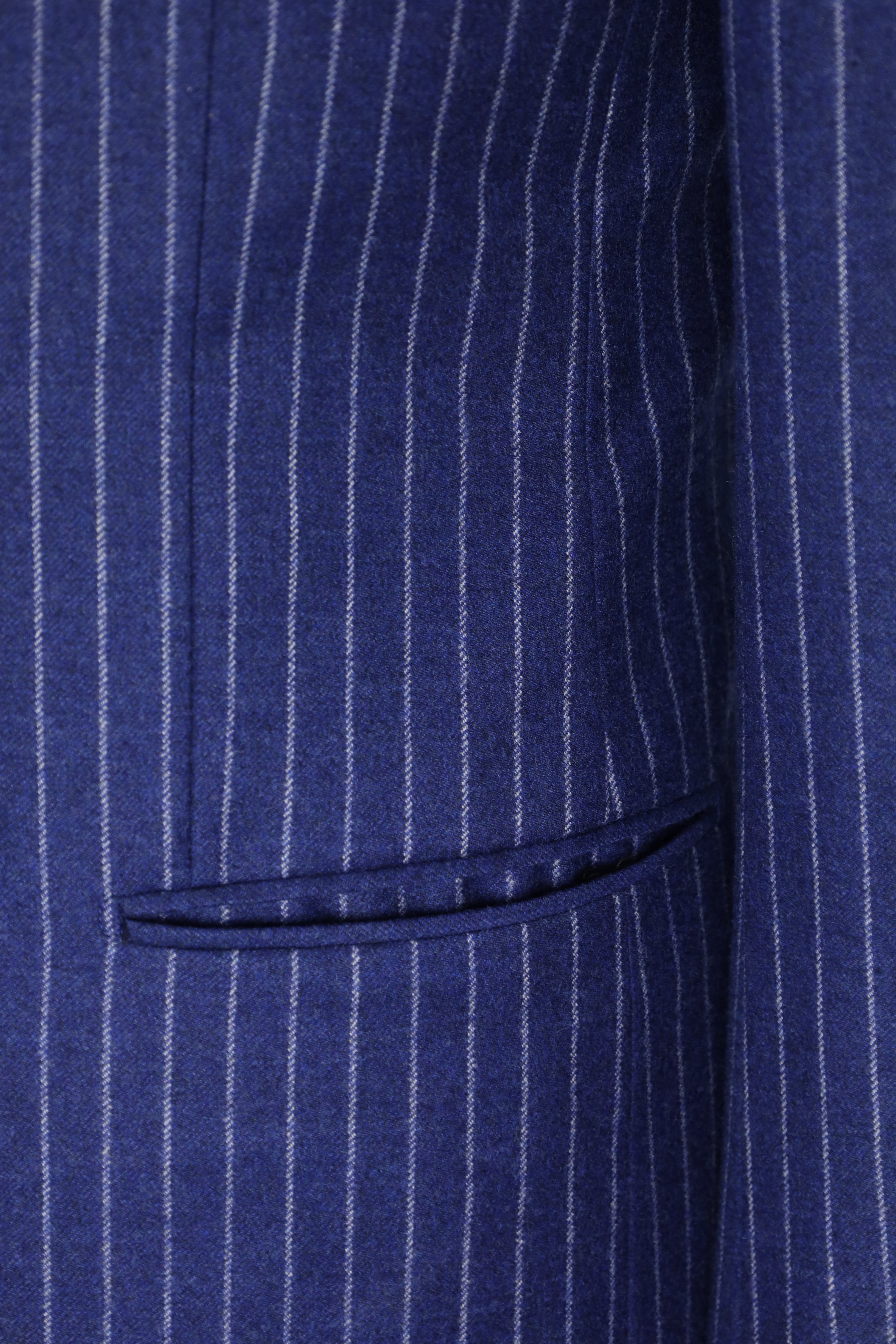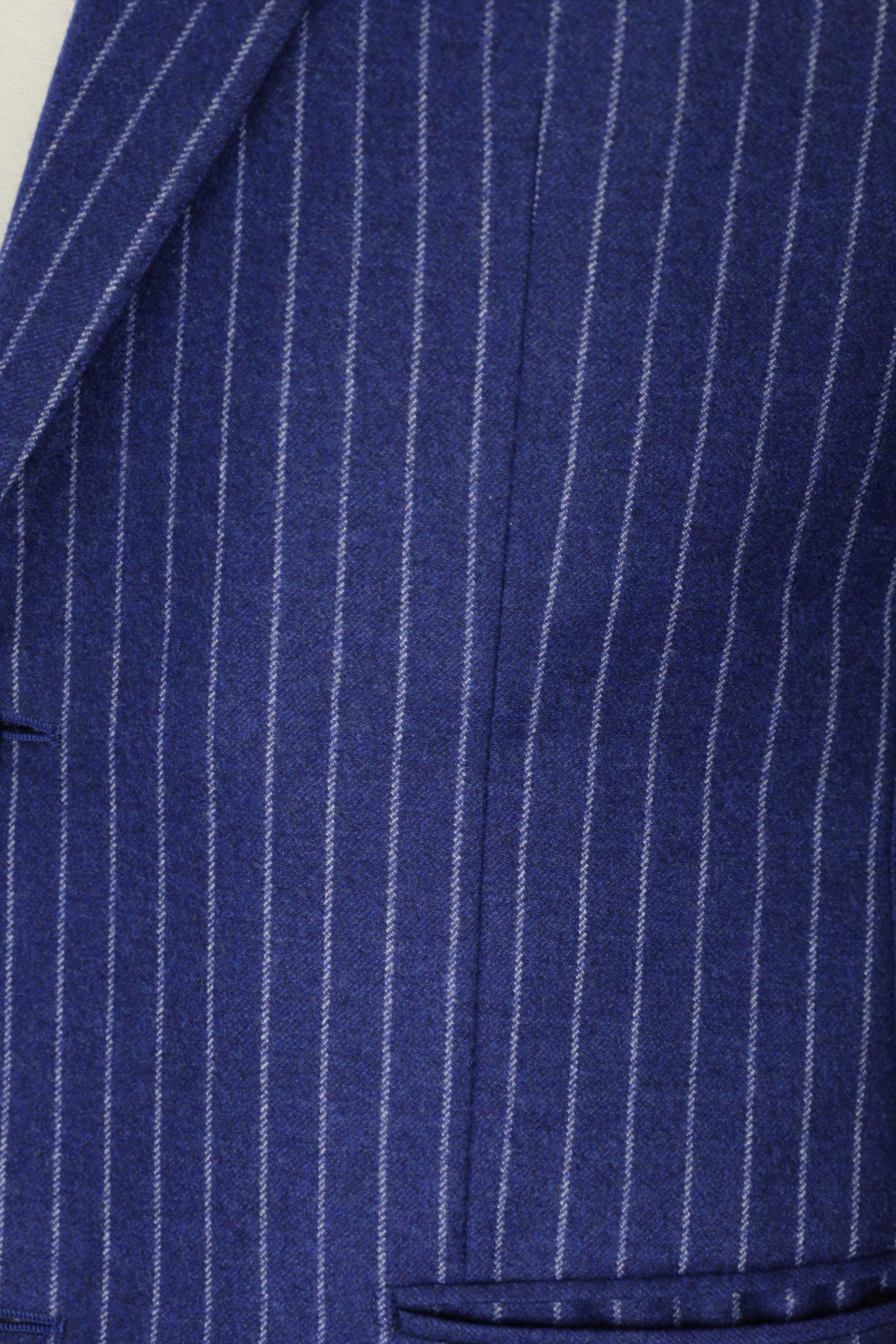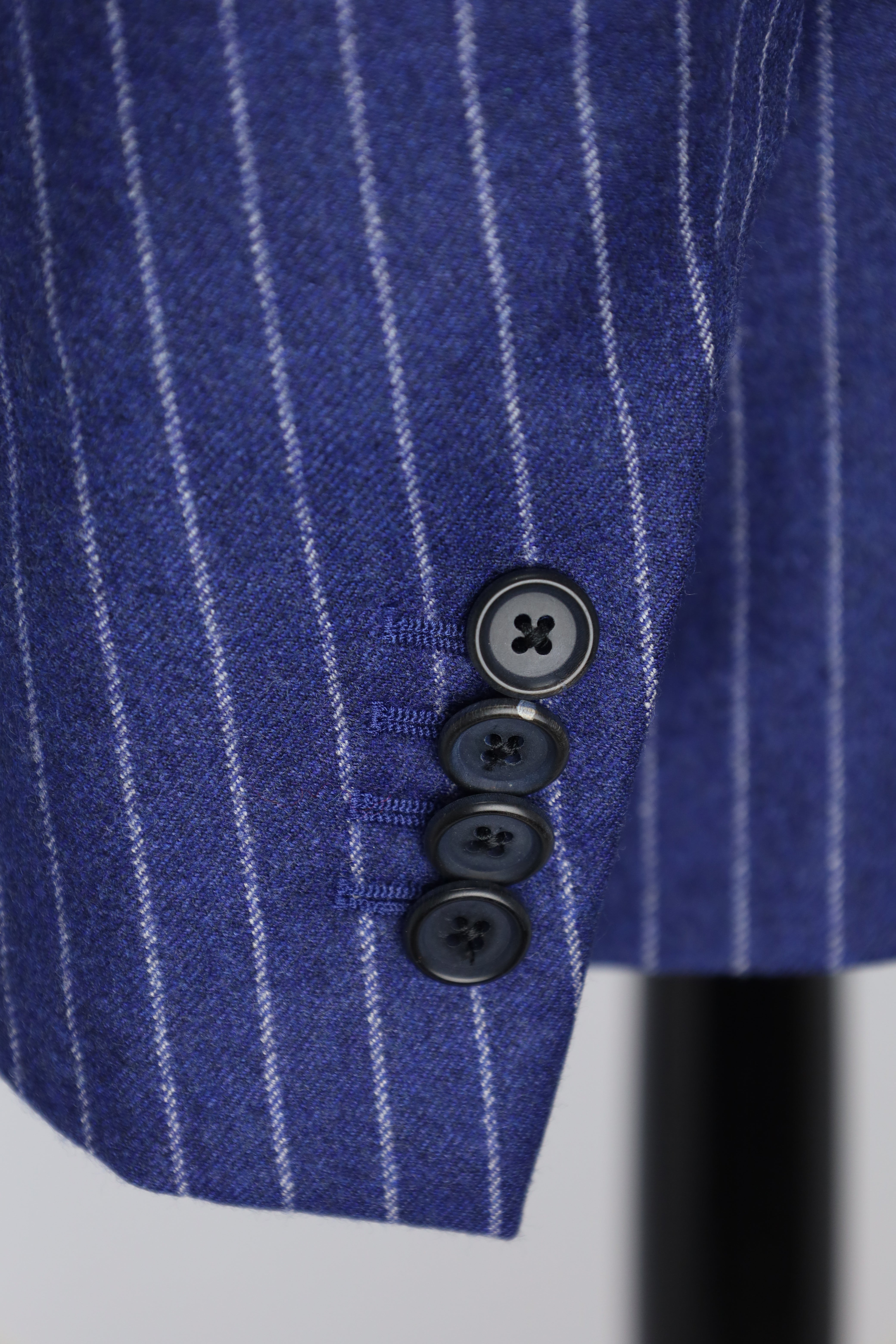The Caruso Blue Loro Piana Wool & Cashmere Flannel Pinstripe Suit exudes sophistication and refinement. Crafted from luxurious materials, it epitomizes Italian elegance and craftsmanship. The classic pinstripe pattern adds a touch of sartorial flair, while the blend of wool and cashmere ensures both comfort and durability. This suit is a timeless addition to any gentleman's wardrobe, perfect for formal occasions or professional settings. Discover the elaborated sartorial details below.