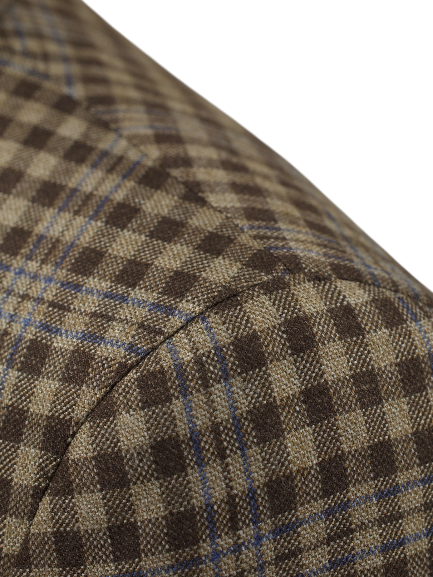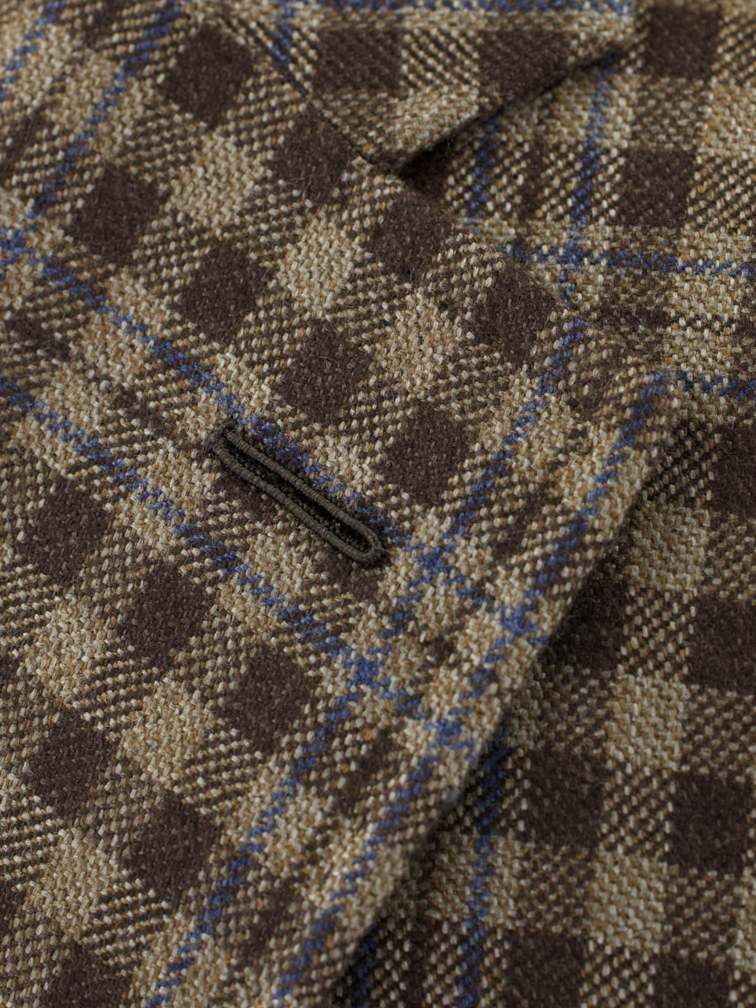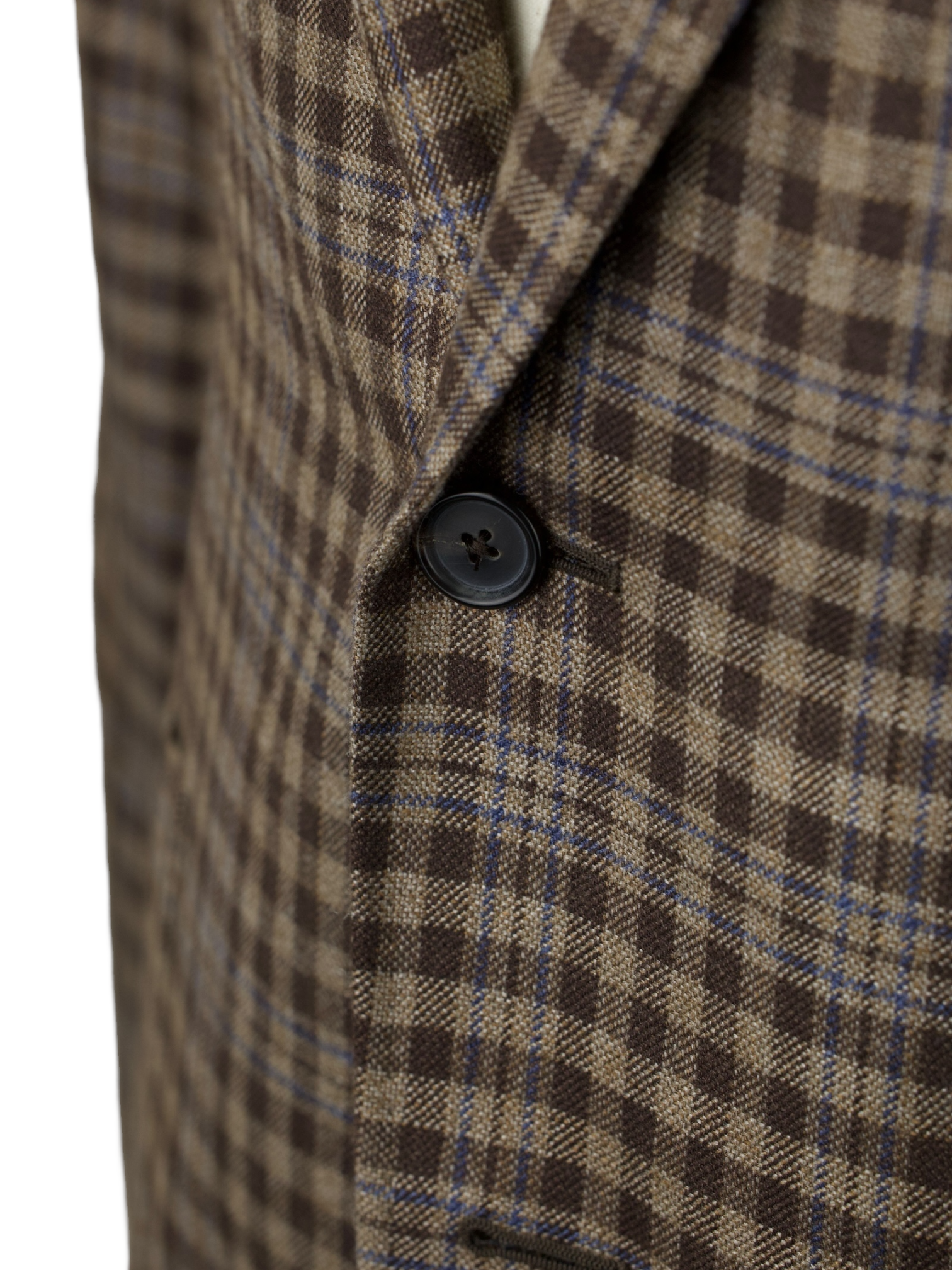 Discover the Caruso Boheme jacket in an exquisite brown and blue palette, woven from Loro Piana's luxurious "Sunset" cloth—a refined blend of silk and cashmere that offers exceptional softness with a subtle sheen. The rich brown base is gently interlaced with muted blue threads, creating a quietly striking visual texture. Cut in Caruso’s relaxed Boheme fit, this piece features notch lapels, practical patch pockets, and a half-lined interior that keeps it comfortably lightweight. The lapel is distinguished by a milanese handmade buttonhole, underscoring the jacket’s artisanal sensibility and refined detailing.