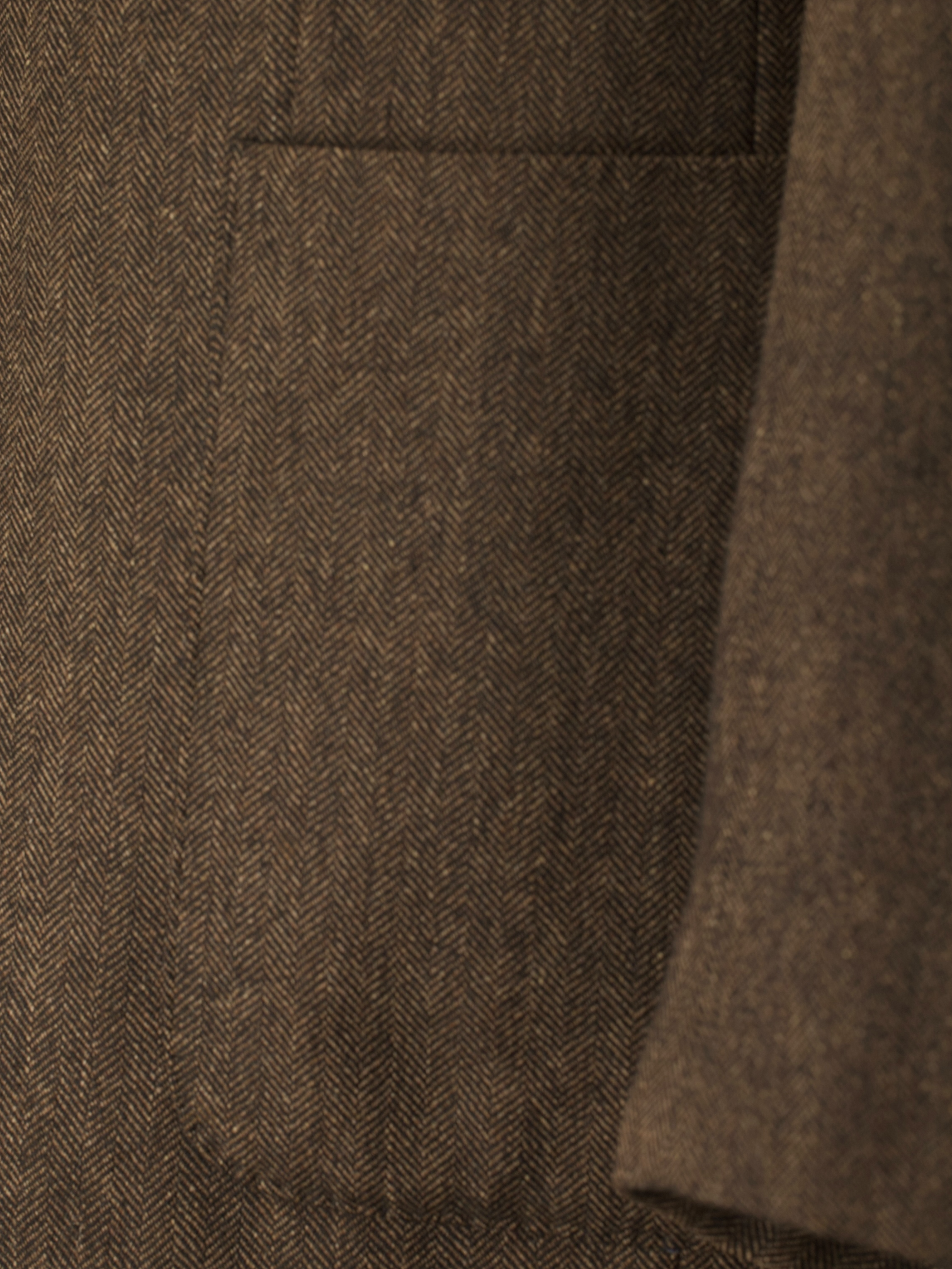 Discover the understated richness of this Caruso jacket, tailored in a deep chocolate brown pure cashmere with a subtle herringbone weave that adds dimension without distraction. Designed with notch lapels, patch pockets, and a fully lined interior, it strikes a refined balance between classic structure and modern ease. The fabric has an exceptionally soft touch, offering warmth and elegance in equal measure, ideal for cooler months or layered city dressing with quiet distinction.