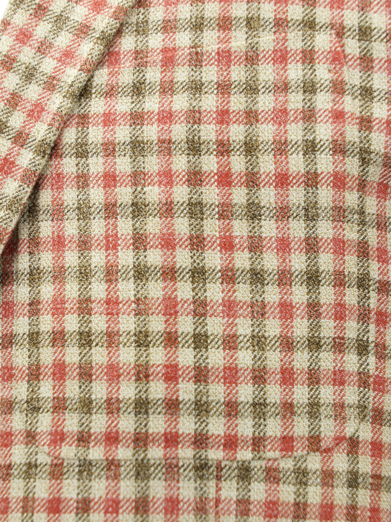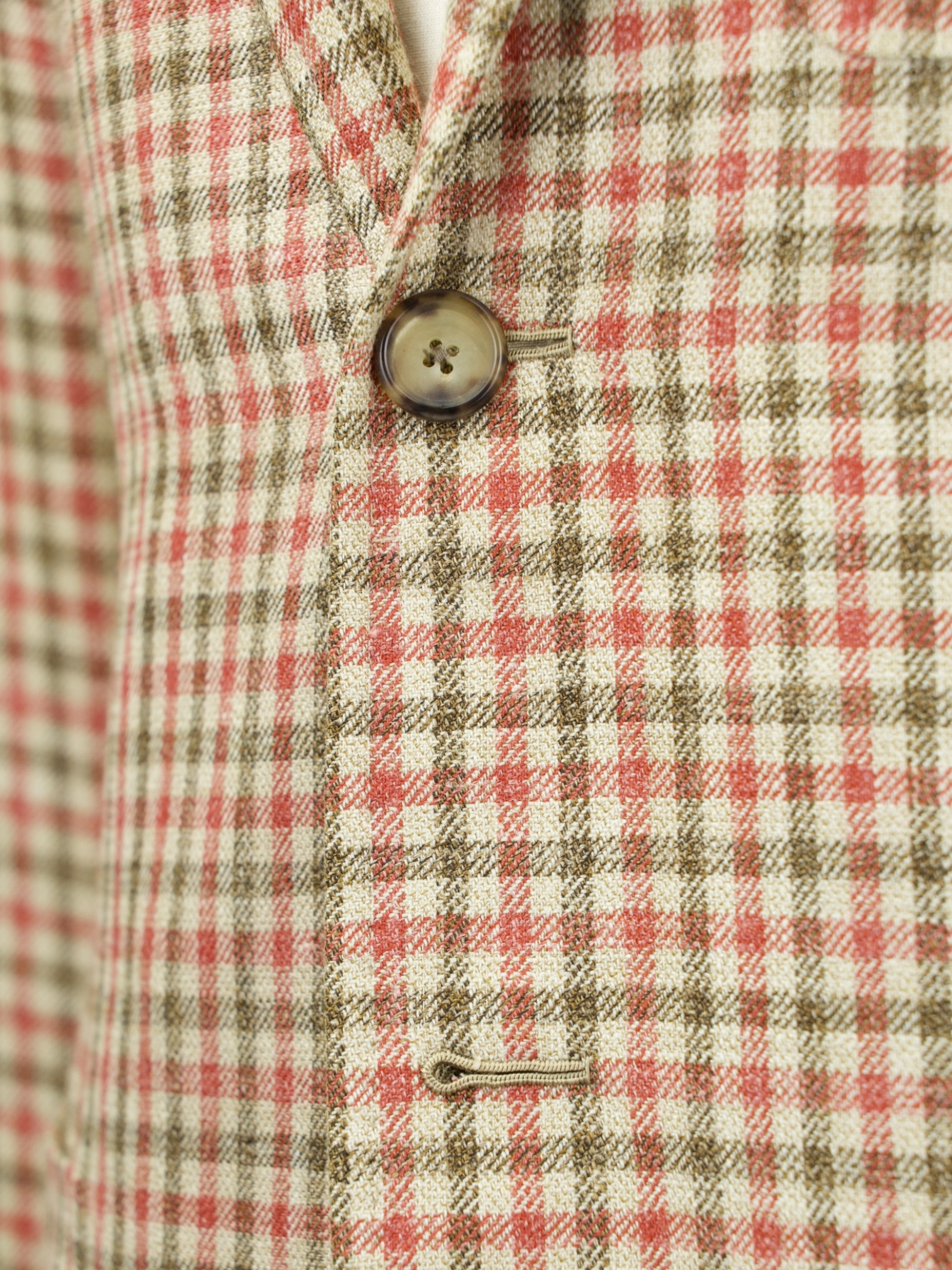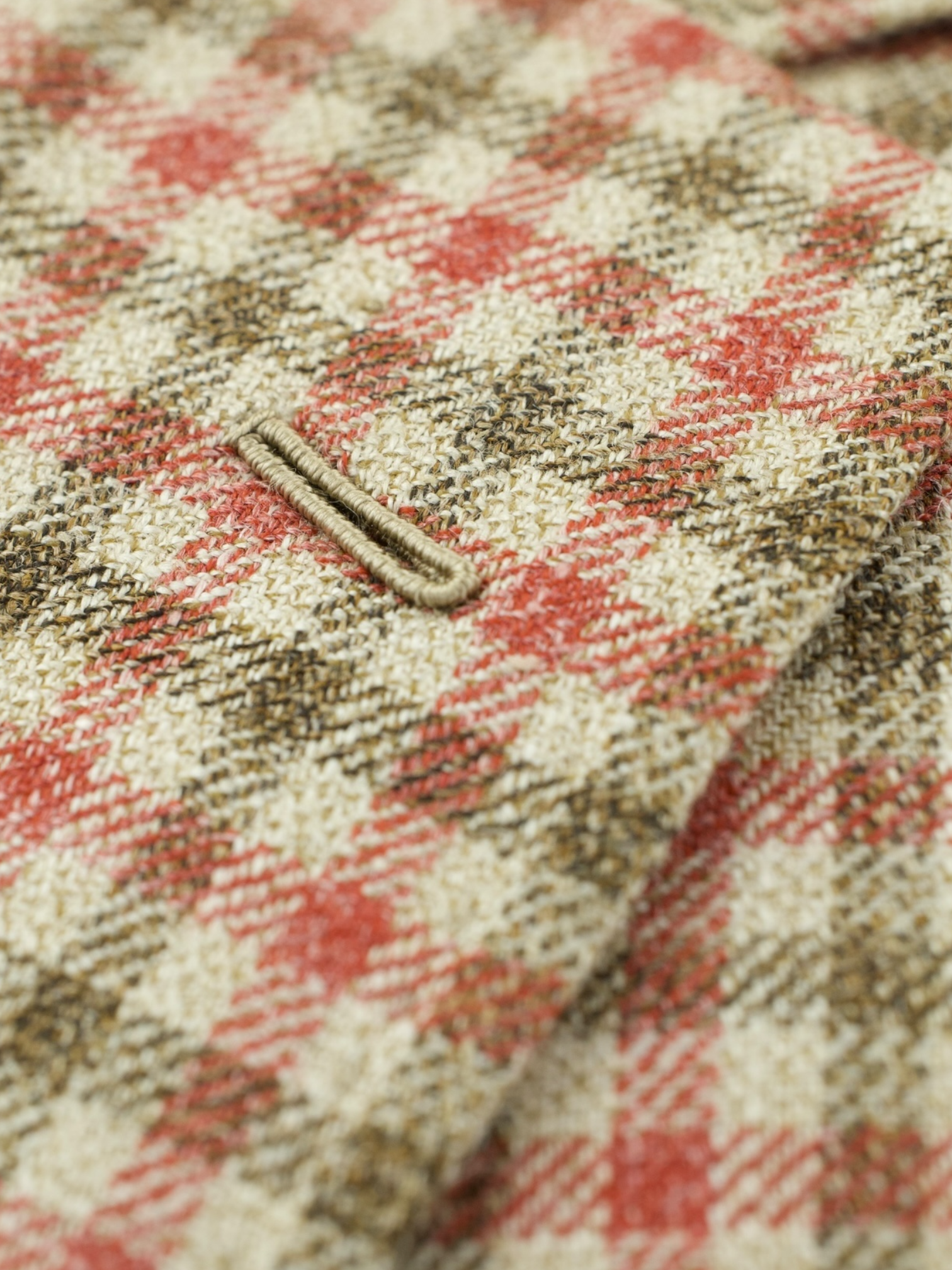 Discover the Caruso coral red gingham check jacket, a charismatic yet refined piece that brings playful color into a sophisticated silhouette. Woven from a lightweight blend of wool, silk, and linen, the fabric has a dry, airy hand with just enough texture to hold its shape. The gingham check is rendered in a soft olive green and a dominant coral red, laid over a warm beige ground that mellows the vibrancy into something surprisingly wearable. Designed with notch lapels, a Milanese buttonhole, and distinctive patch pockets at the chest and waist, this half-lined jacket exudes a relaxed elegance.