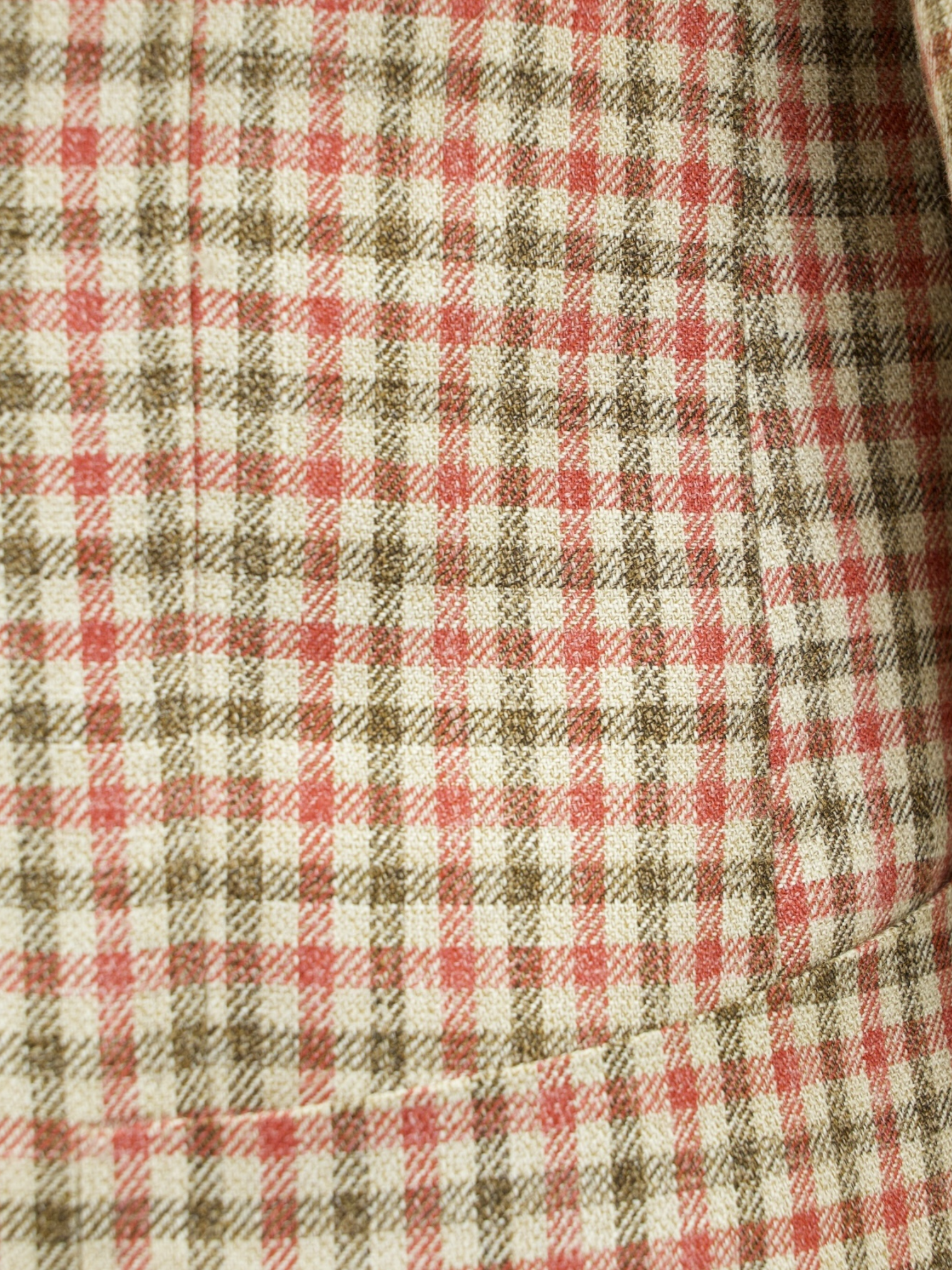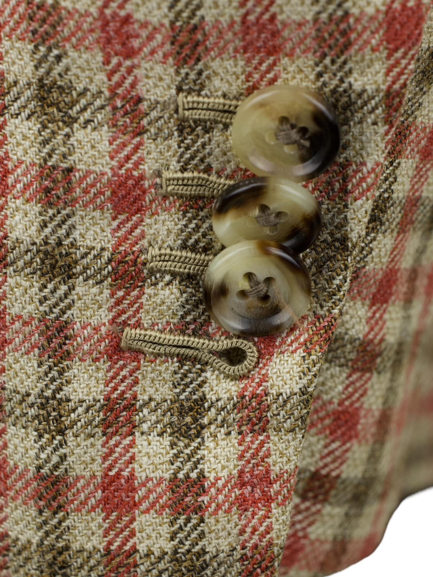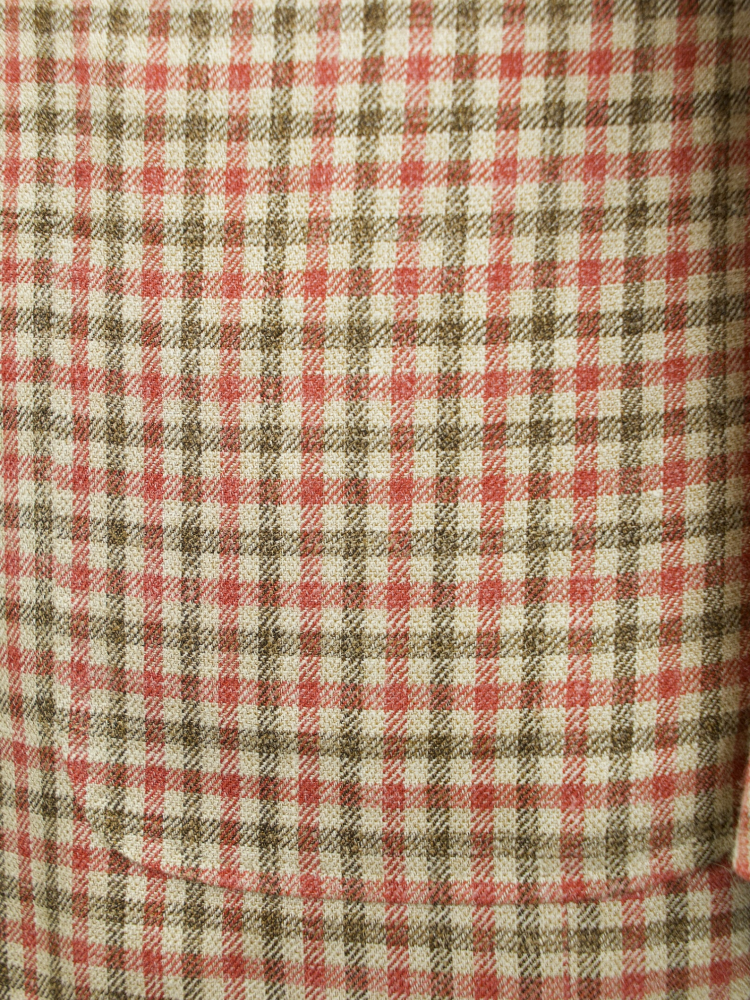 Discover the Caruso coral red gingham check jacket, a charismatic yet refined piece that brings playful color into a sophisticated silhouette. Woven from a lightweight blend of wool, silk, and linen, the fabric has a dry, airy hand with just enough texture to hold its shape. The gingham check is rendered in a soft olive green and a dominant coral red, laid over a warm beige ground that mellows the vibrancy into something surprisingly wearable. Designed with notch lapels, a Milanese buttonhole, and distinctive patch pockets at the chest and waist, this half-lined jacket exudes a relaxed elegance.