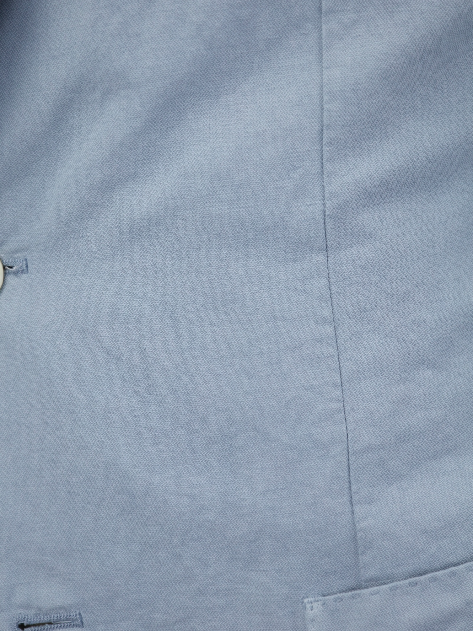 Crafted from a premium linen and cotton blend, this jacket is designed with comfort and versatility in mind. The fabric ensures breathability and a soft touch, making it perfect for various seasons and occasions. The soft blue hue of the jacket adds a refreshing element to any ensemble, standing out with its lively and inviting color.