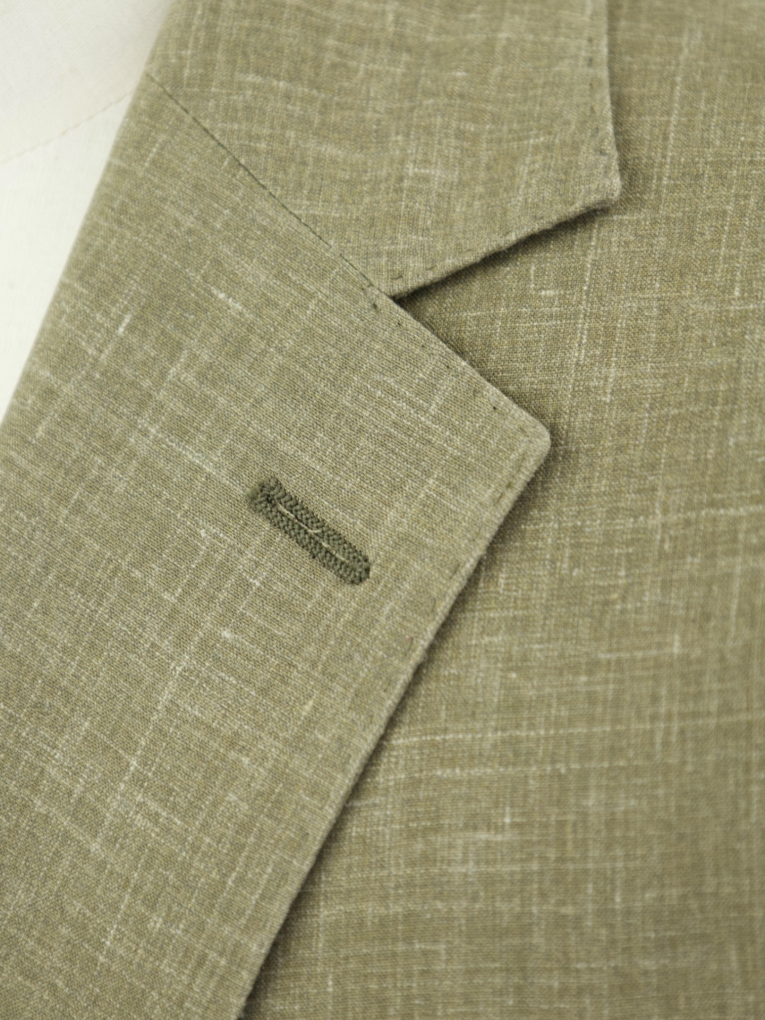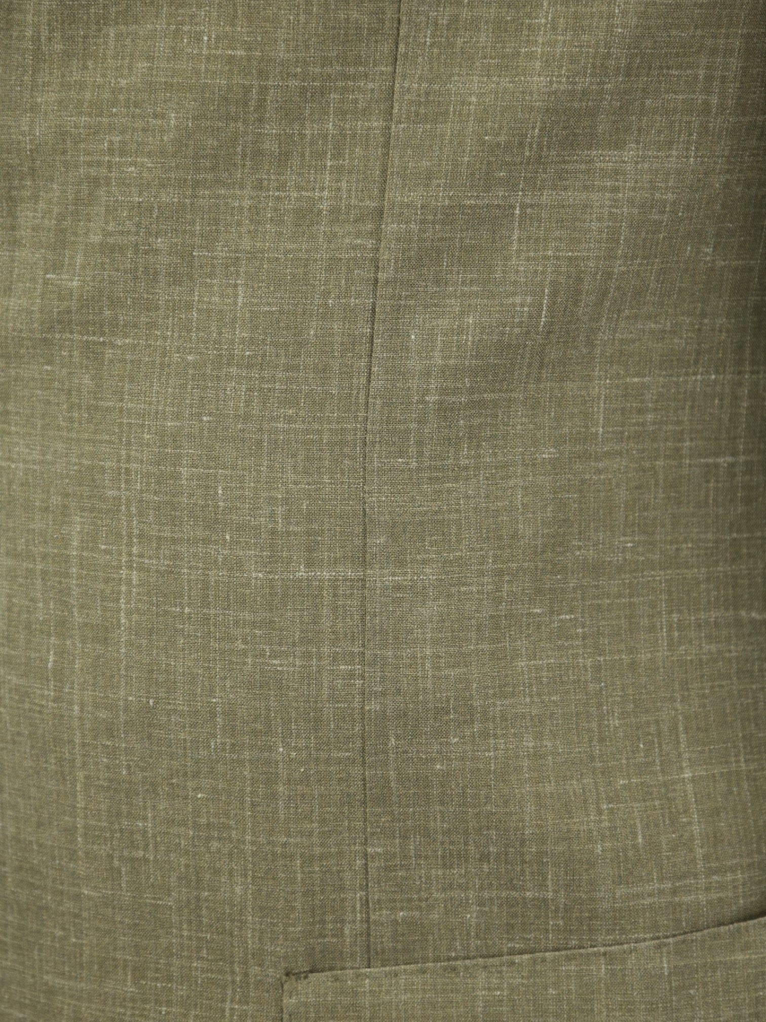 Crafted from an exquisite blend of wool, silk, and linen, this jacket offers a unique melange look that exudes sophistication. The combination of these high-quality materials results in a fabric that is not only visually appealing with its textured appearance but also exceptionally comfortable to wear. The light green hue adds a refreshing and contemporary touch to the jacket, making it versatile enough for various occasions and seasons.