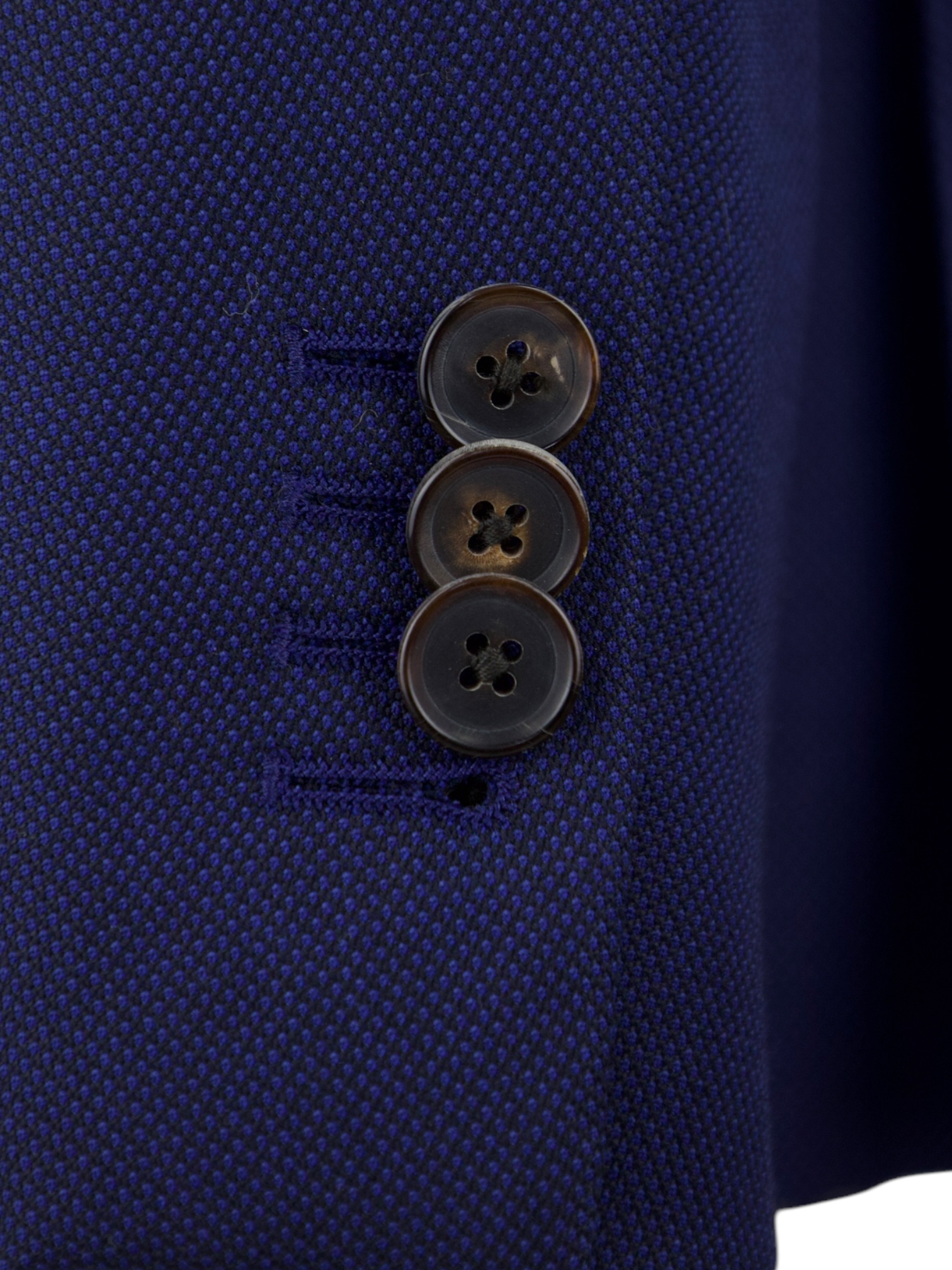 Also known as stacked buttons or waterfall buttons, kissing buttons are associated with Italian tailoring as Italian tailors make their jacket sleeve buttons in the kissing style. In this style, buttons touch each other and overlap one another. Handmade buttonholes; Even this step, apparently the simplest, is treated with an abundance of detail. Attaching the buttons is a job that requires patience and must be completed to perfection.