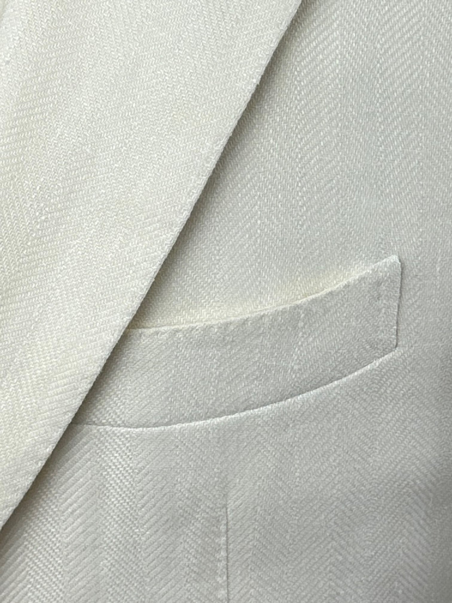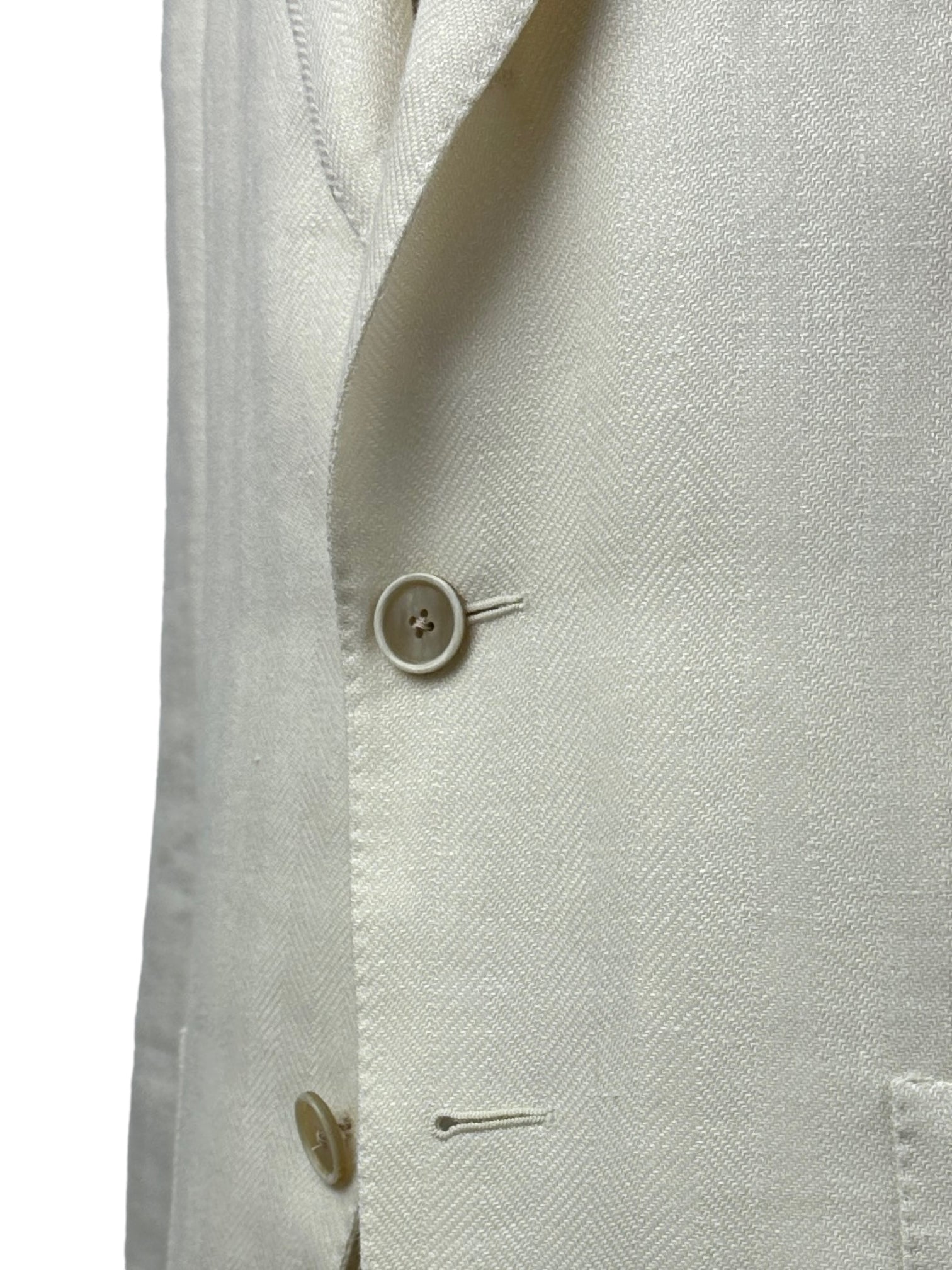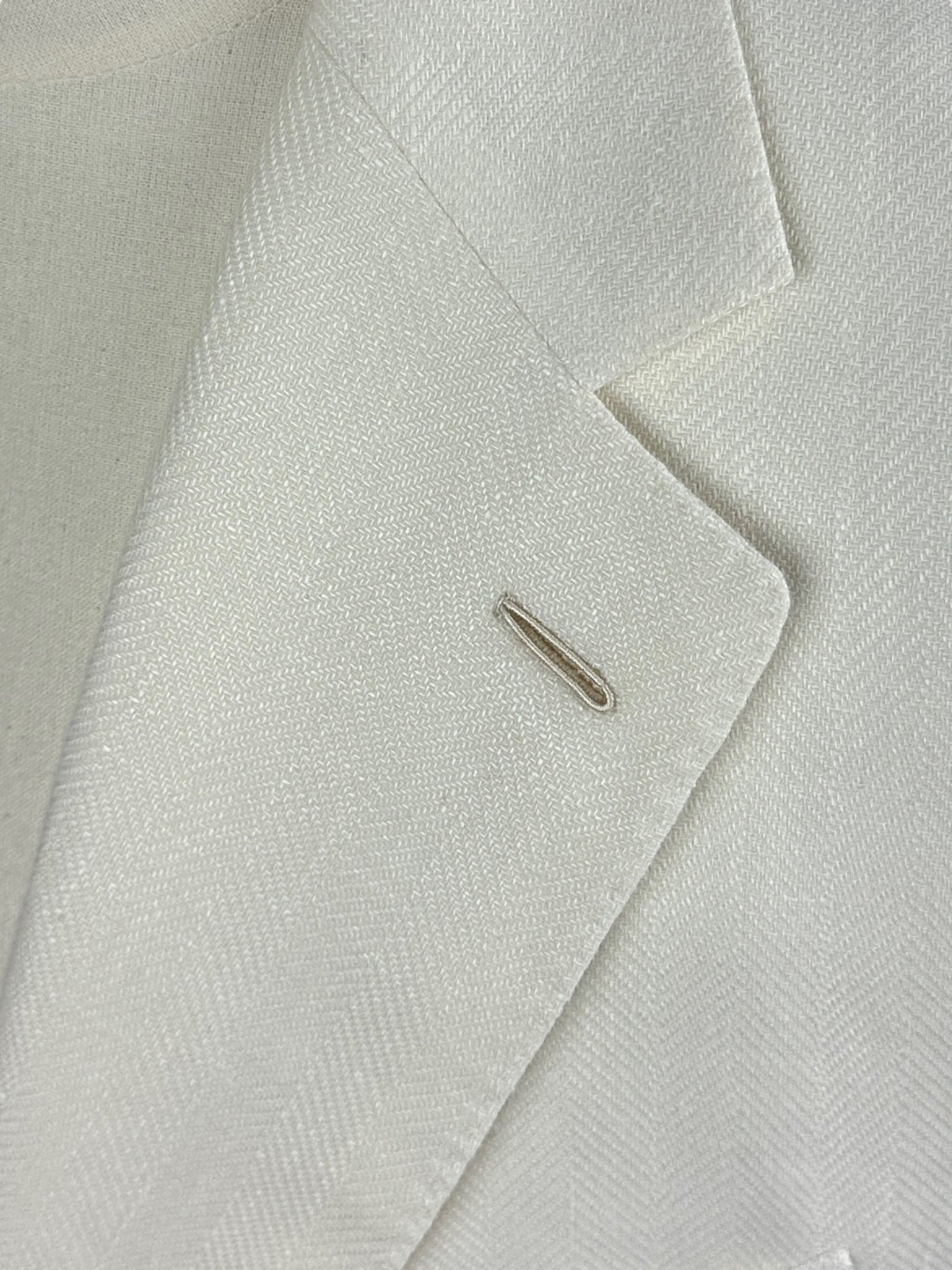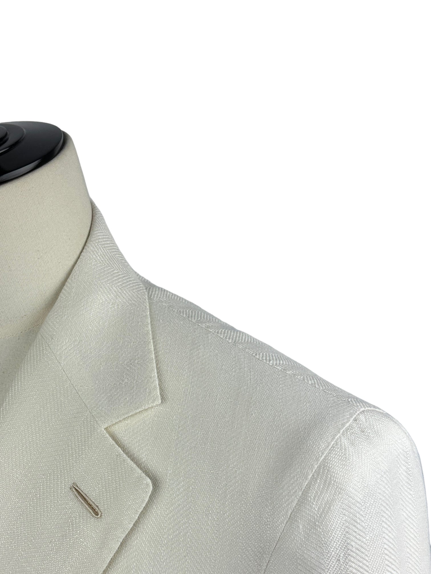 Crafted from a luxurious blend of linen and wool, this jacket offers the perfect combination of breathability and warmth, making it suitable for a variety of seasons and occasions. The off-white color exudes a refined sophistication, while the subtle herringbone pattern adds depth and texture to the overall design, creating a garment that is both visually striking and timeless.