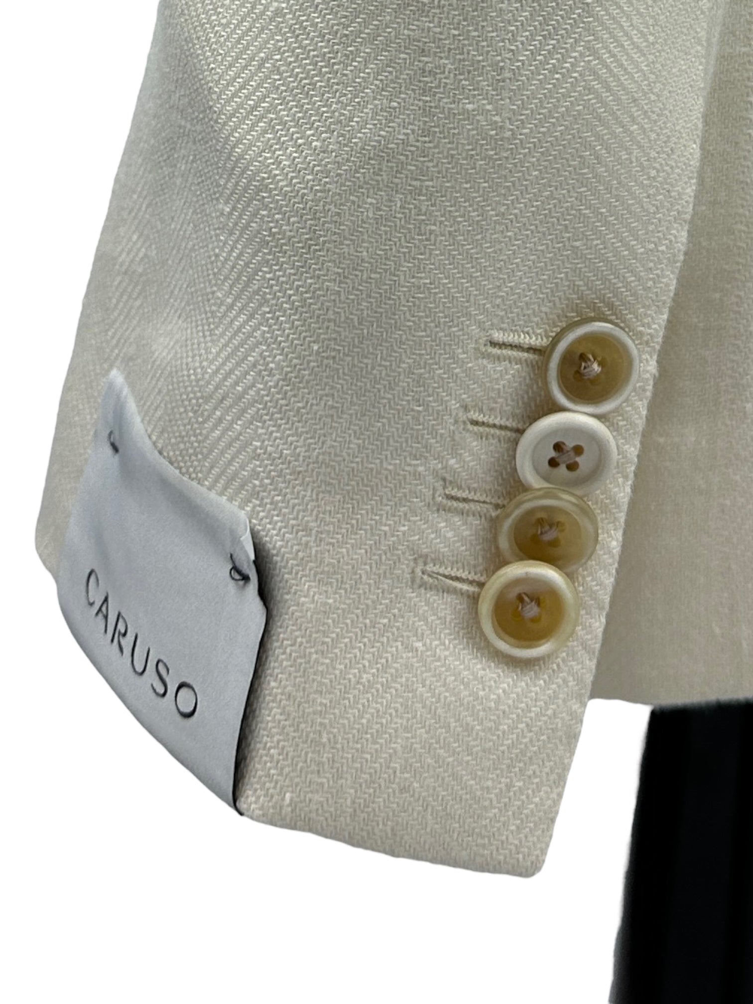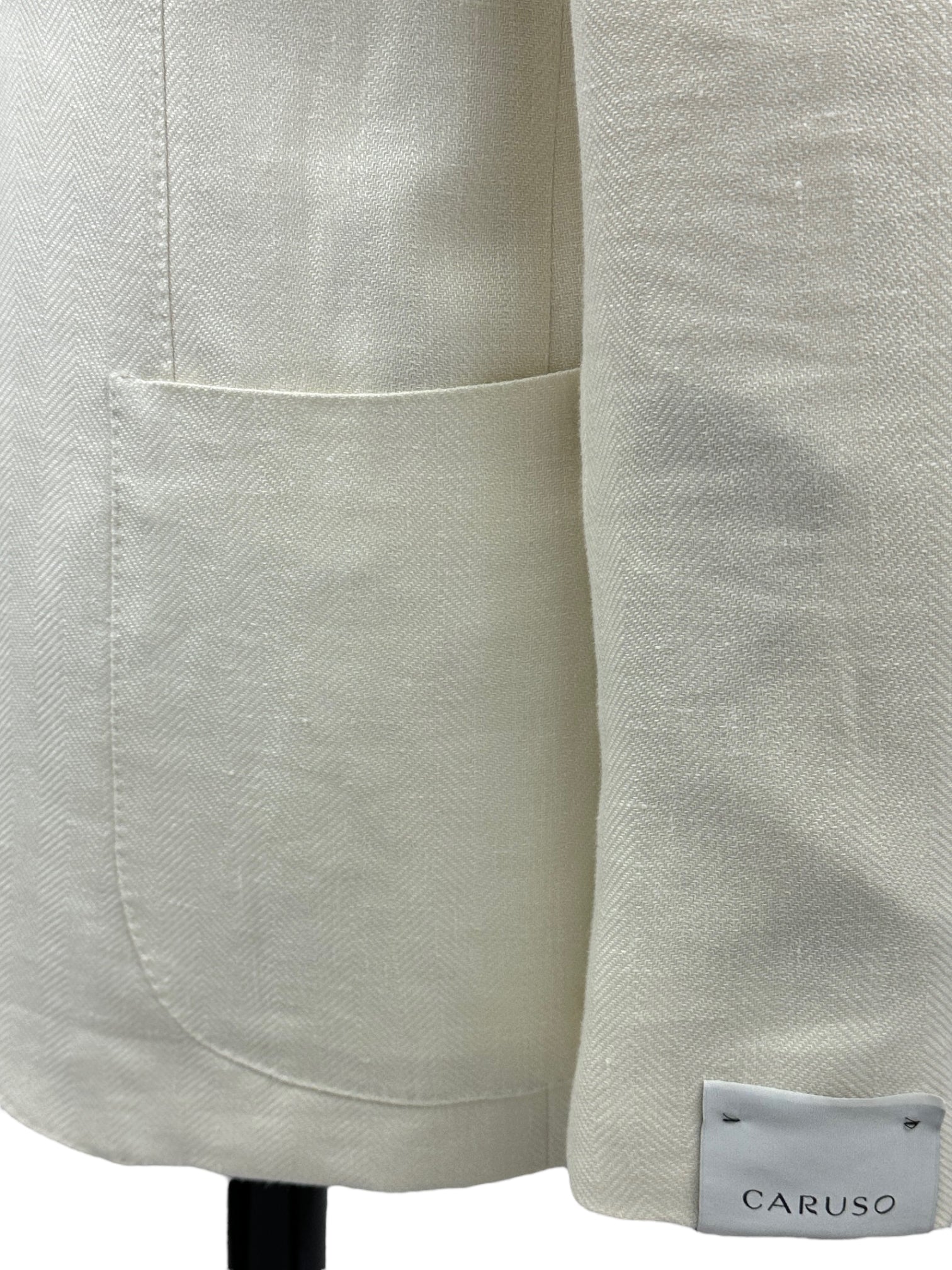 Ideal for both formal and casual settings, the Caruso Off-White Aida Herringbone Jacket can be paired with dress trousers for an elegant, business-ready ensemble or with jeans for a more relaxed yet sophisticated look. Its unique blend of materials, along with the impeccable Italian craftsmanship, makes this jacket a luxurious and versatile choice for any occasion.