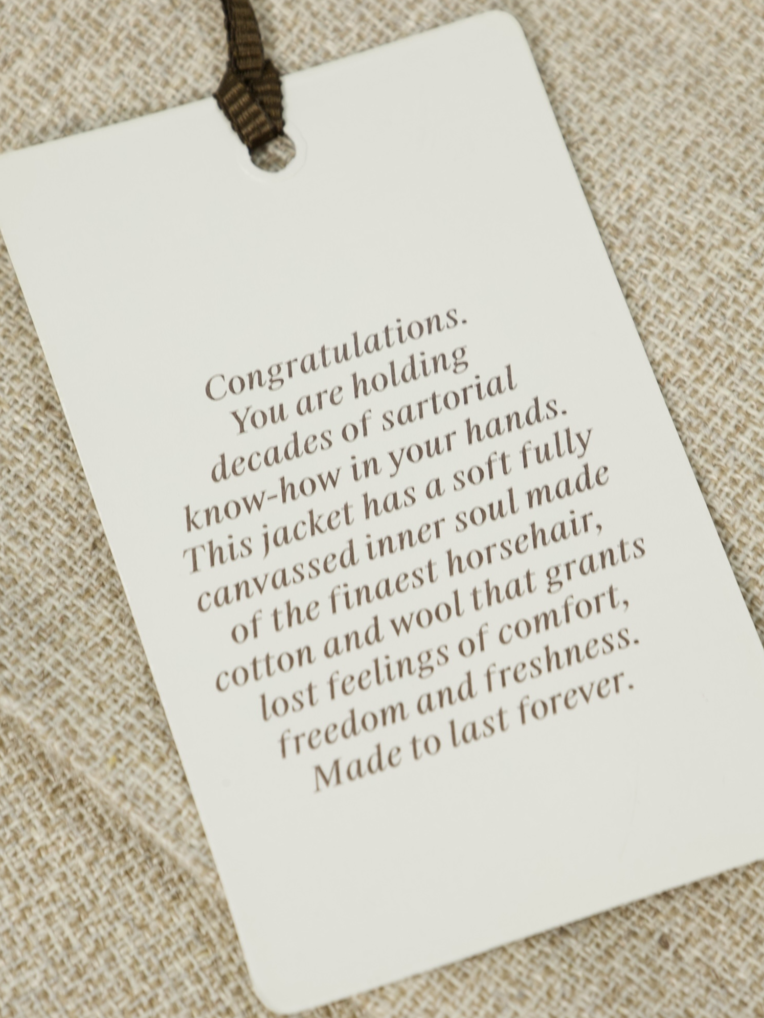 A sartorial jacket - or coat - needs an interlining that will help give it shape and mold it. Canvas gives the item a tailored and crafted look. In short, it breathes life into it. Purely technical, canvas is made from either horsehair, wool, mohair or camel hair. It could also be a mix of them all, with varying thickness and weight. The canvas is stitched to the jacket, often by hand, thus making the canvas pieces 'floating' in the middle of the inner and outer cloth. This gives the jacket added flexibility. The canvas runs from the upper parts, all the way down to the end of the jacket. After you wear your canvassed suit for a while, it will begin to take your shape and look incredibly natural.