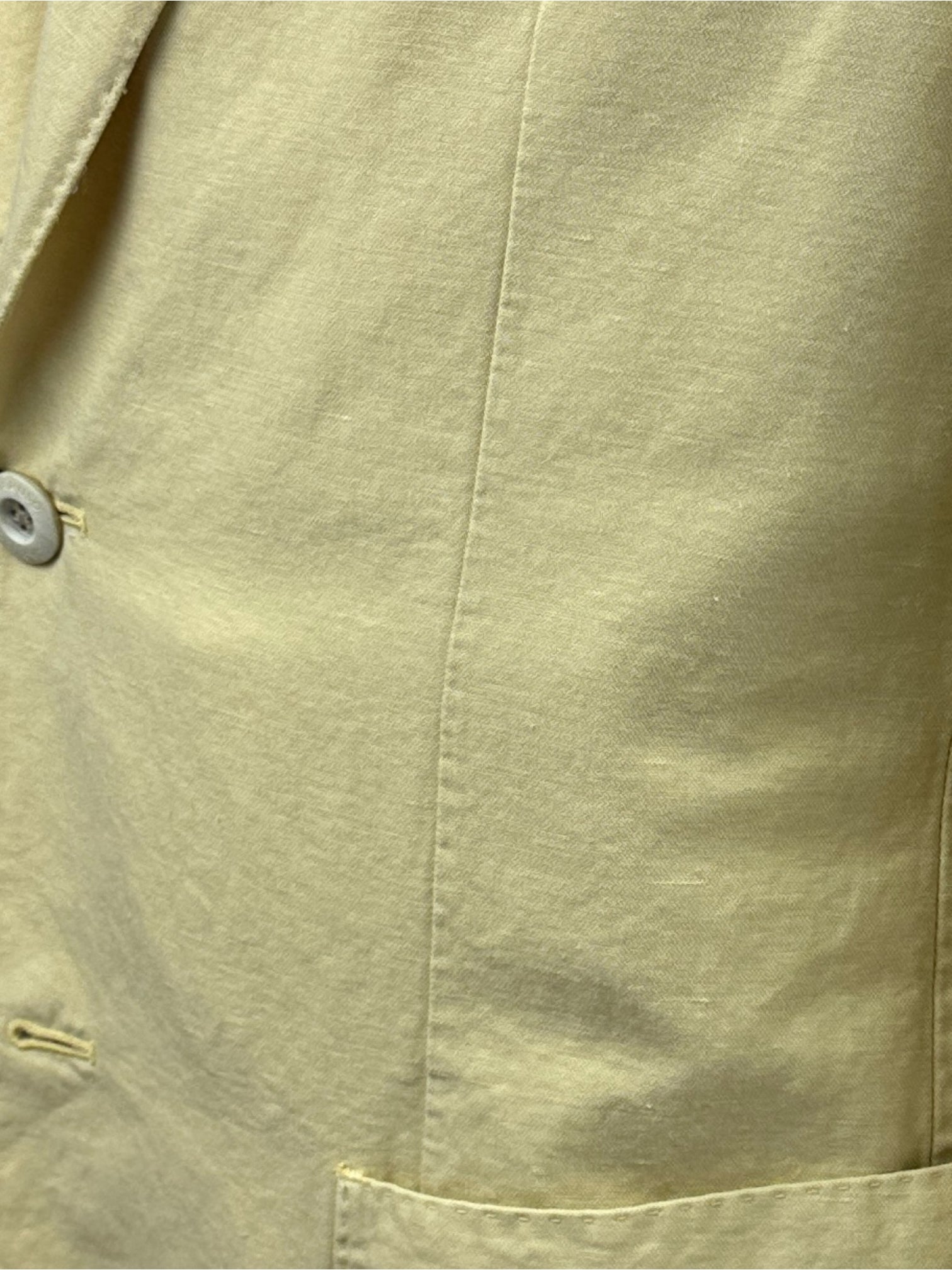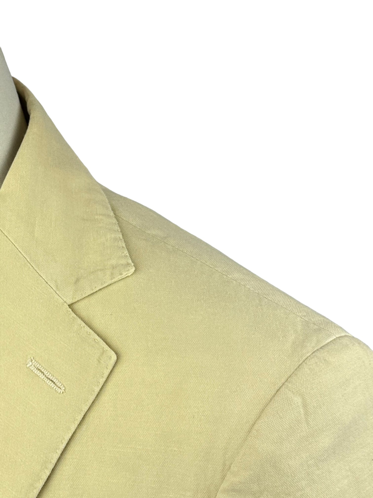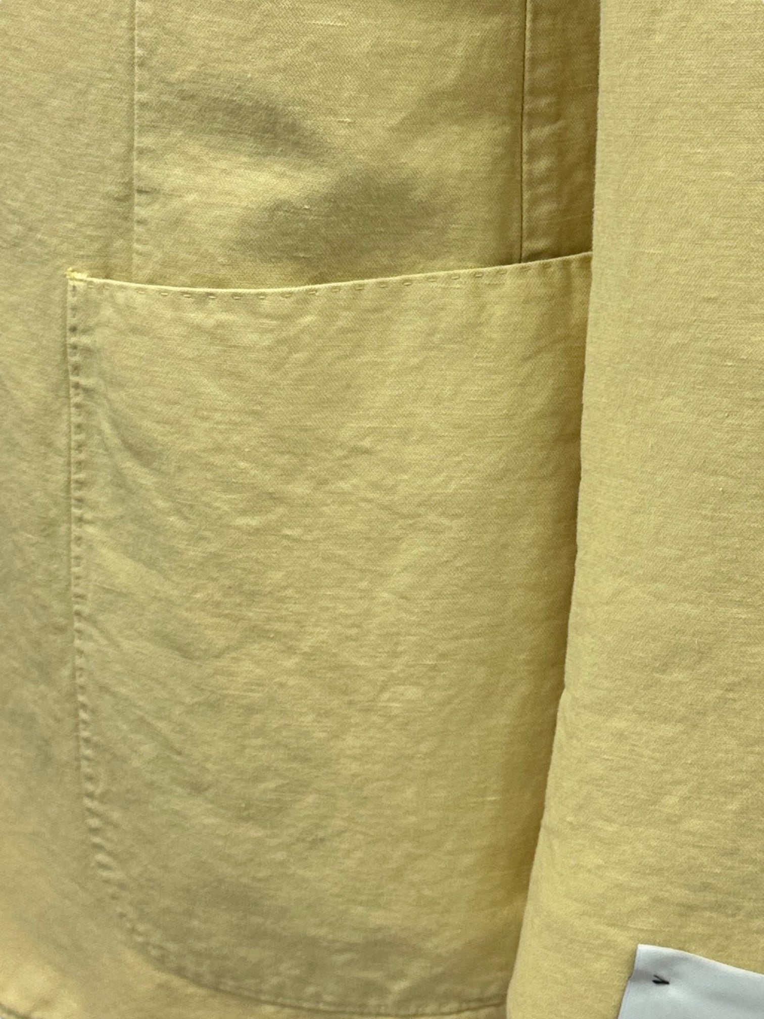 Crafted from a premium linen and cotton blend, this jacket is designed with comfort and versatility in mind. The fabric ensures breathability and a soft touch, making it perfect for various seasons and occasions. The soft yellow hue of the jacket adds a refreshing element to any ensemble, standing out with its lively and inviting color.