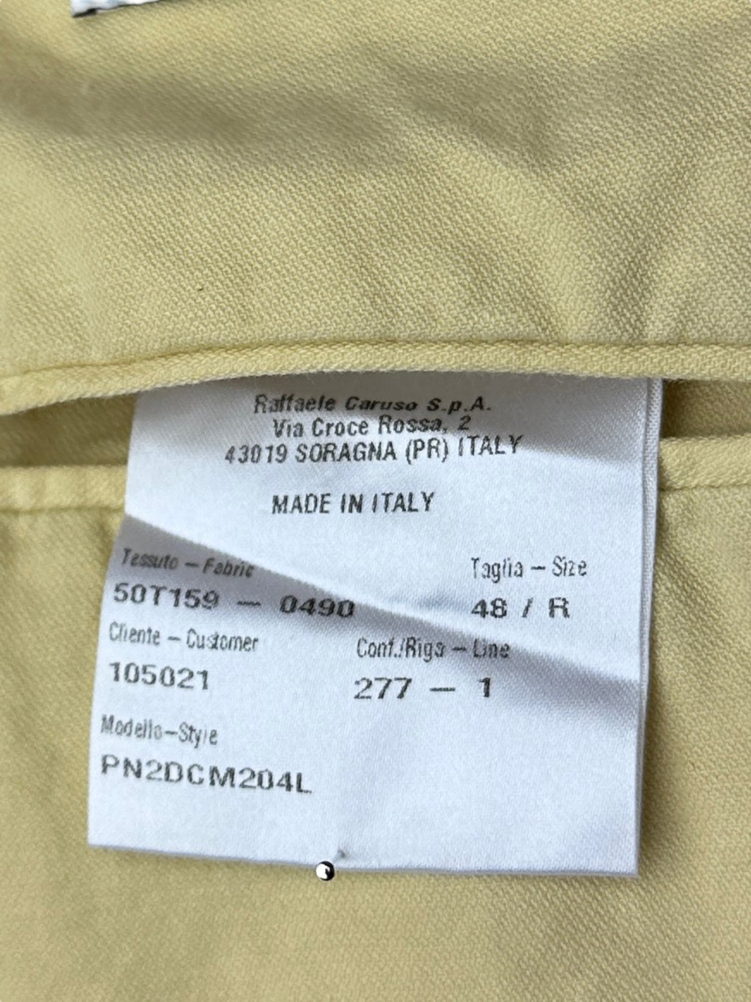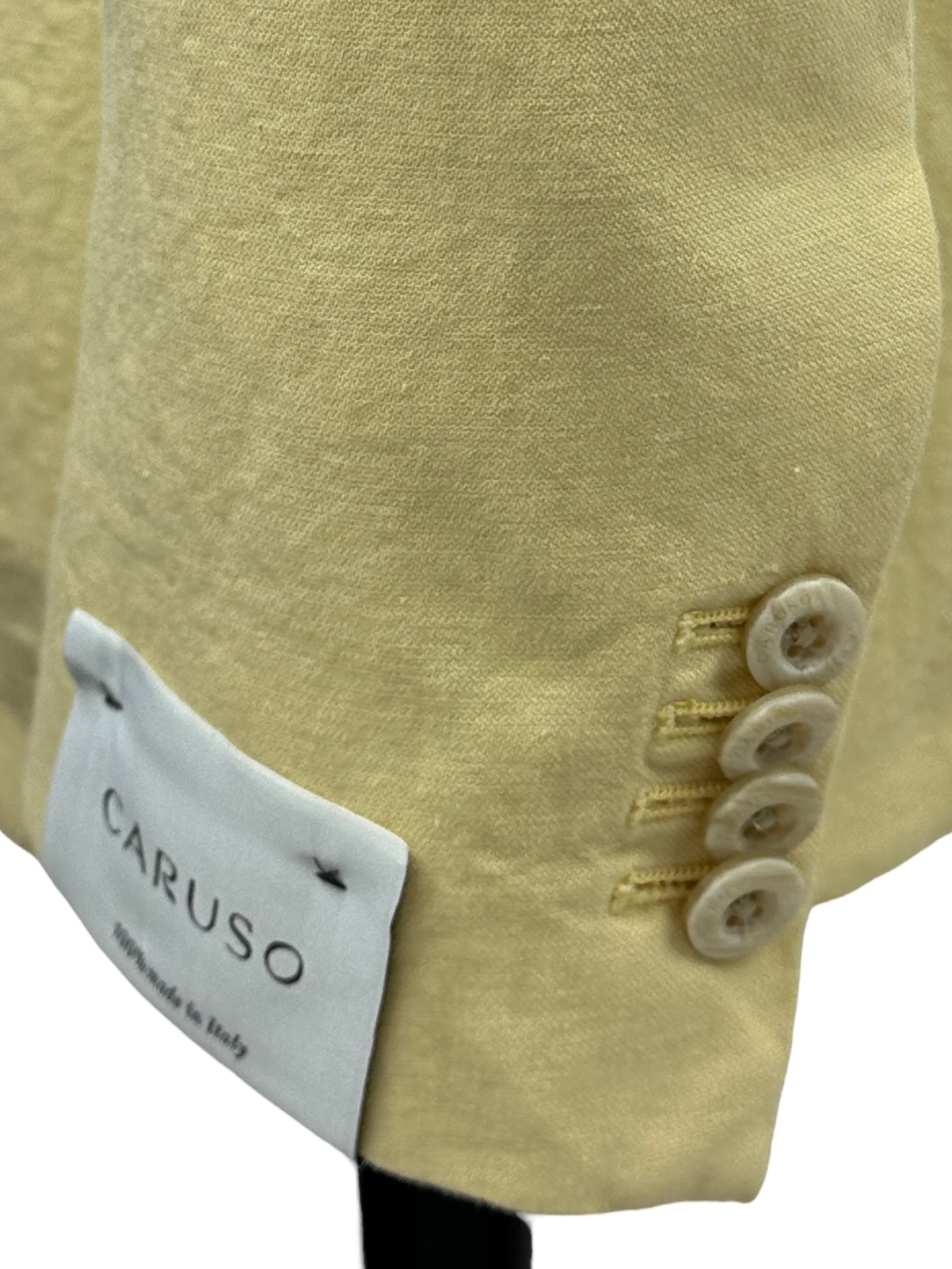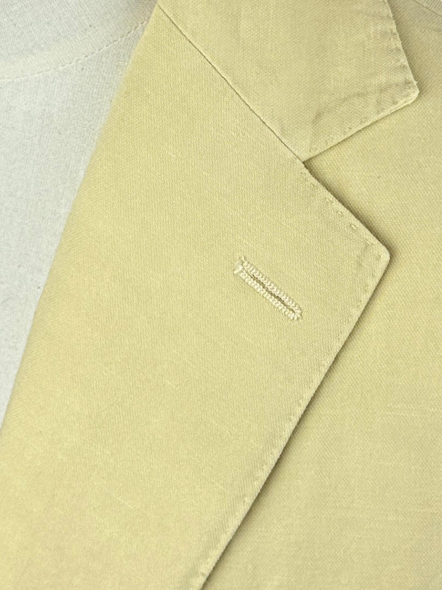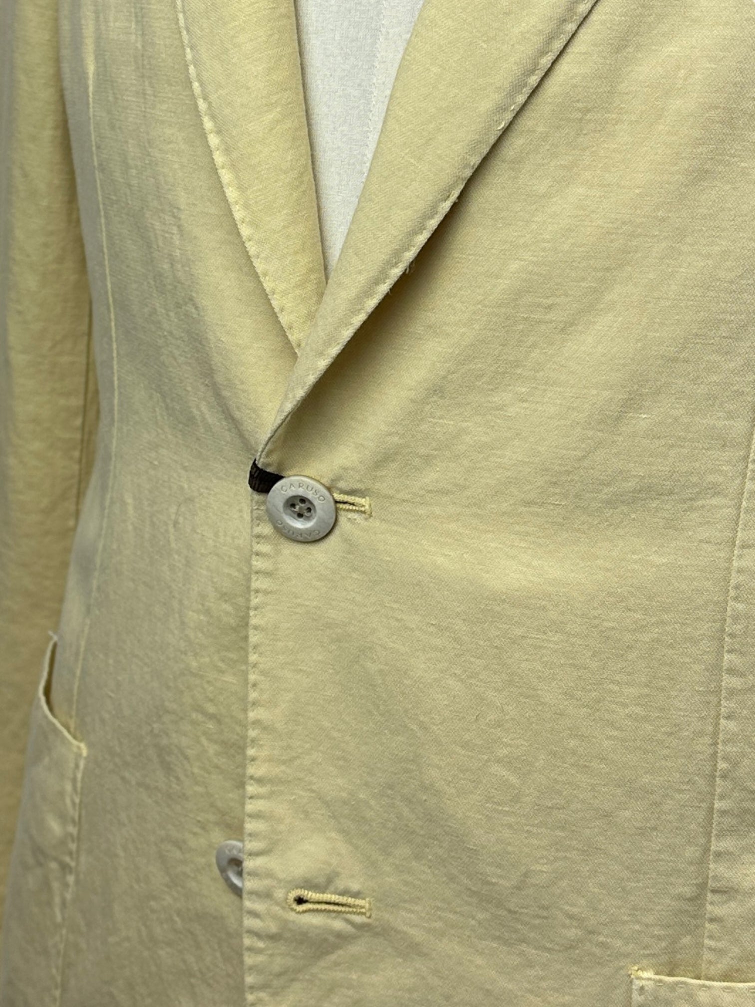 Crafted from a premium linen and cotton blend, this jacket is designed with comfort and versatility in mind. The fabric ensures breathability and a soft touch, making it perfect for various seasons and occasions. The soft yellow hue of the jacket adds a refreshing element to any ensemble, standing out with its lively and inviting color.