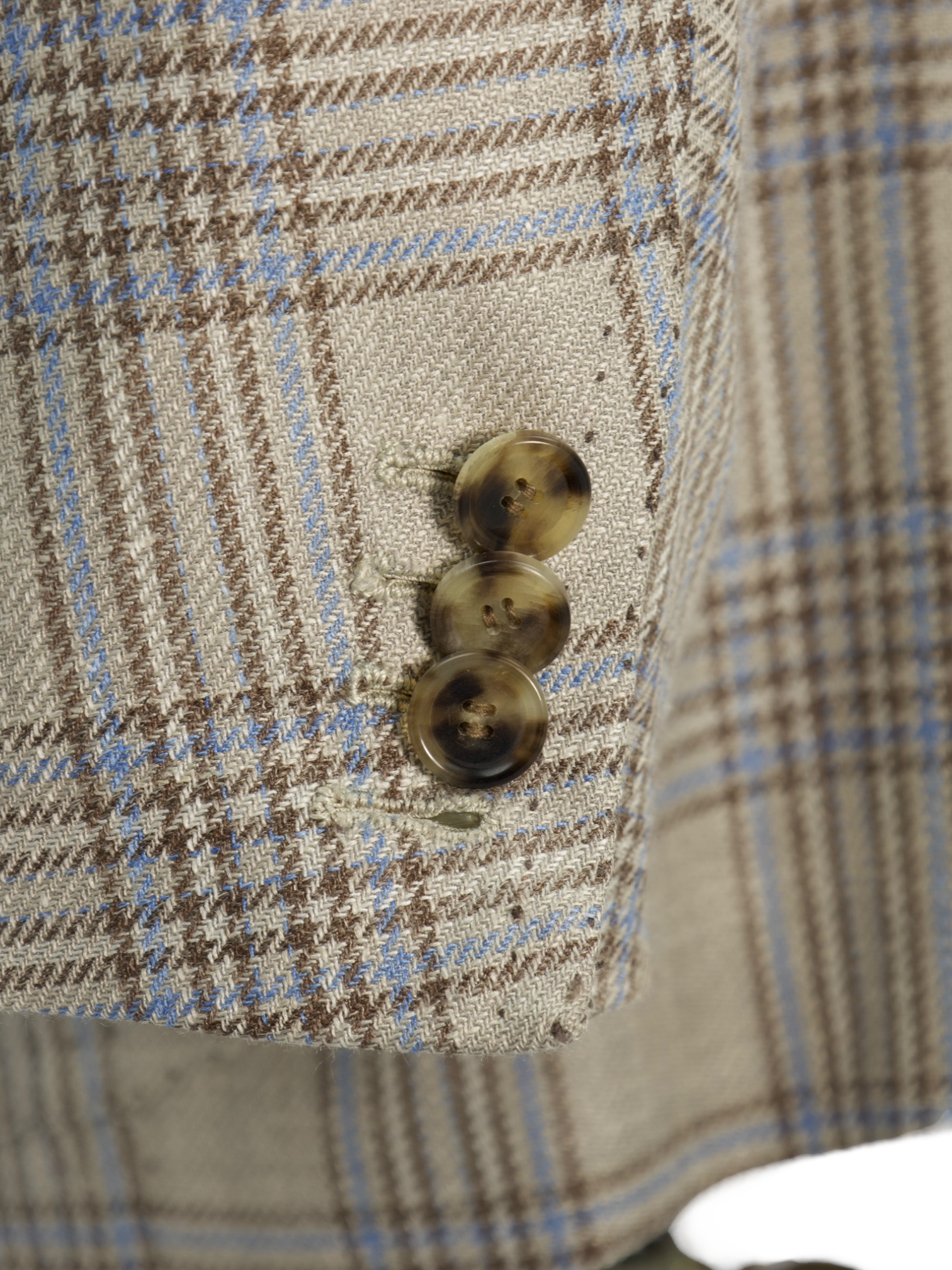 Also known as stacked buttons or waterfall buttons, kissing buttons are associated with Italian tailoring as Italian tailors make their jacket sleeve buttons in the kissing style. In this style, buttons touch each other and overlap one another. Handmade buttonholes; Even this step, apparently the simplest, is treated with an abundance of detail. Attaching the buttons is a job that requires patience and must be completed to perfection.