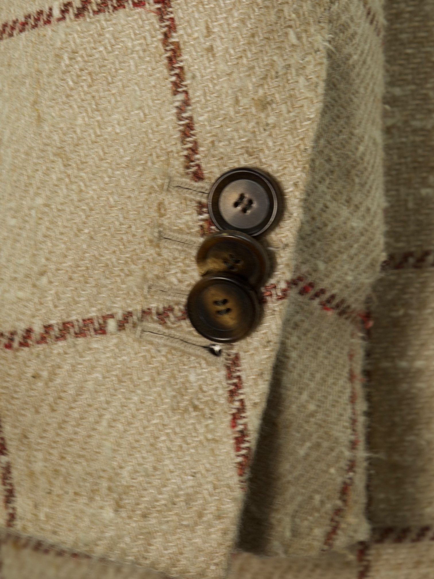 Also known as stacked buttons or waterfall buttons, kissing buttons are associated with Italian tailoring as Italian tailors make their jacket sleeve buttons in the kissing style. In this style, buttons touch each other and overlap one another. Handmade buttonholes; Even this step, apparently the simplest, is treated with an abundance of detail. Attaching the buttons is a job that requires patience and must be completed to perfection.