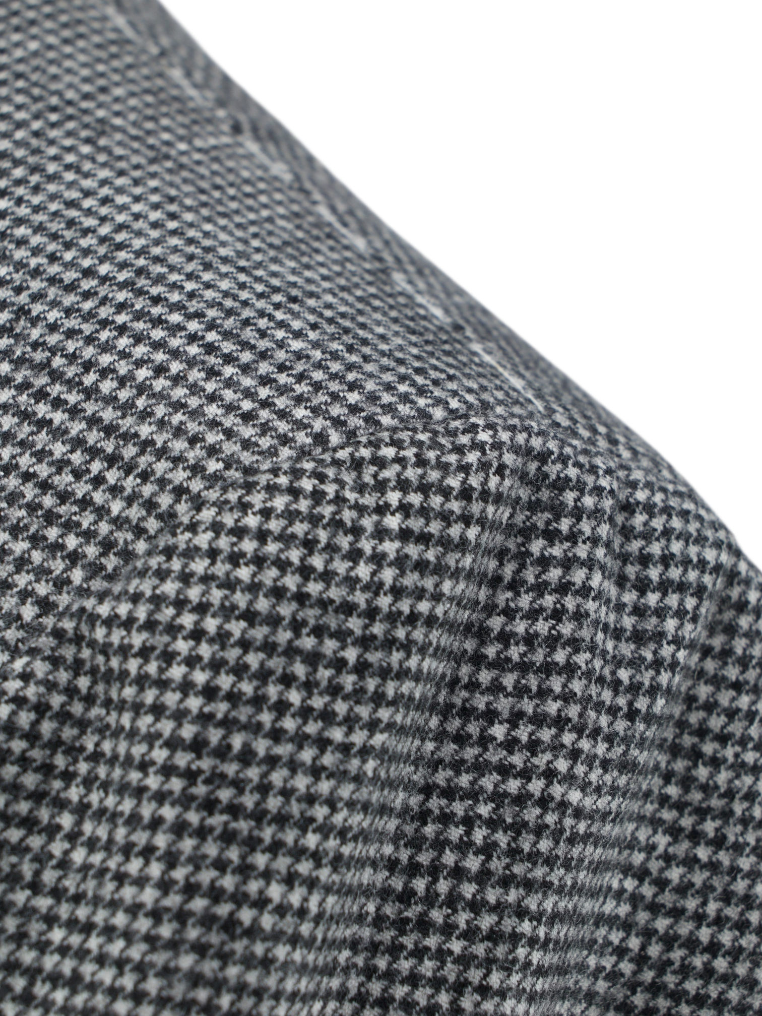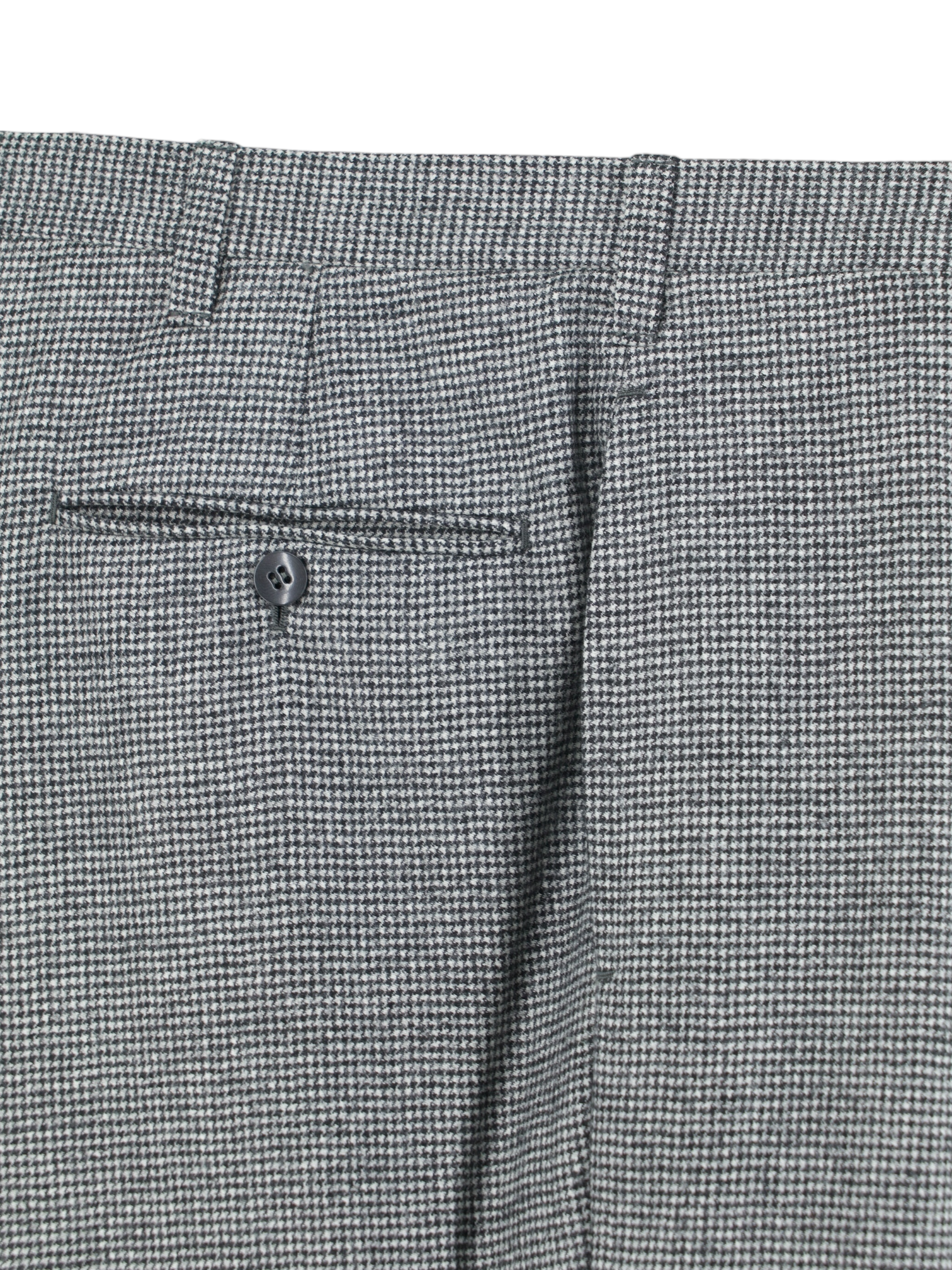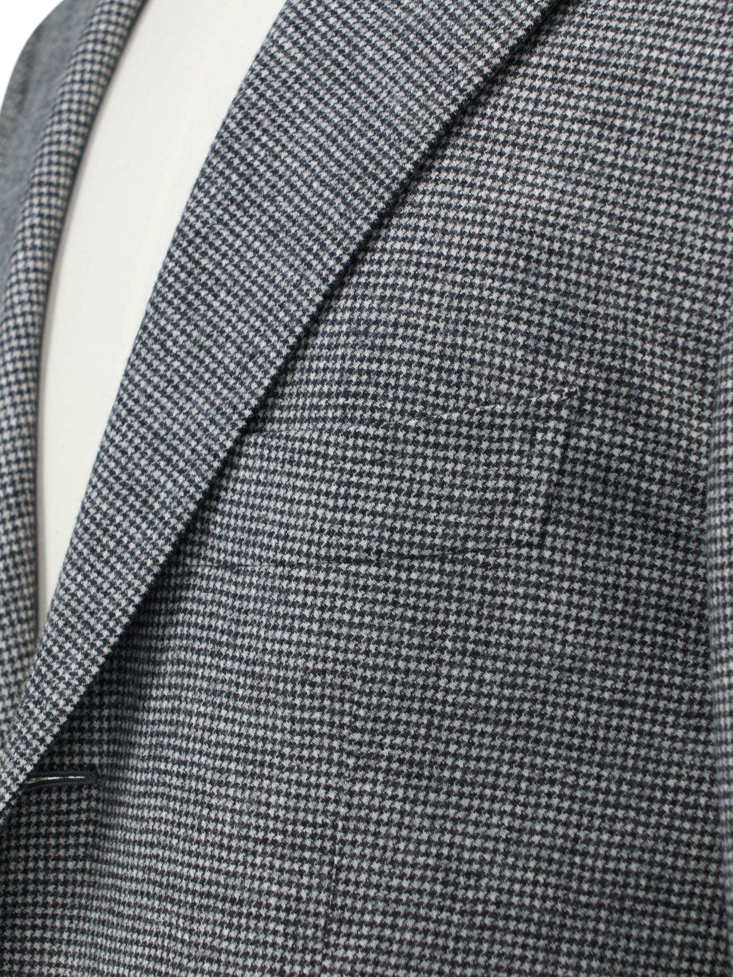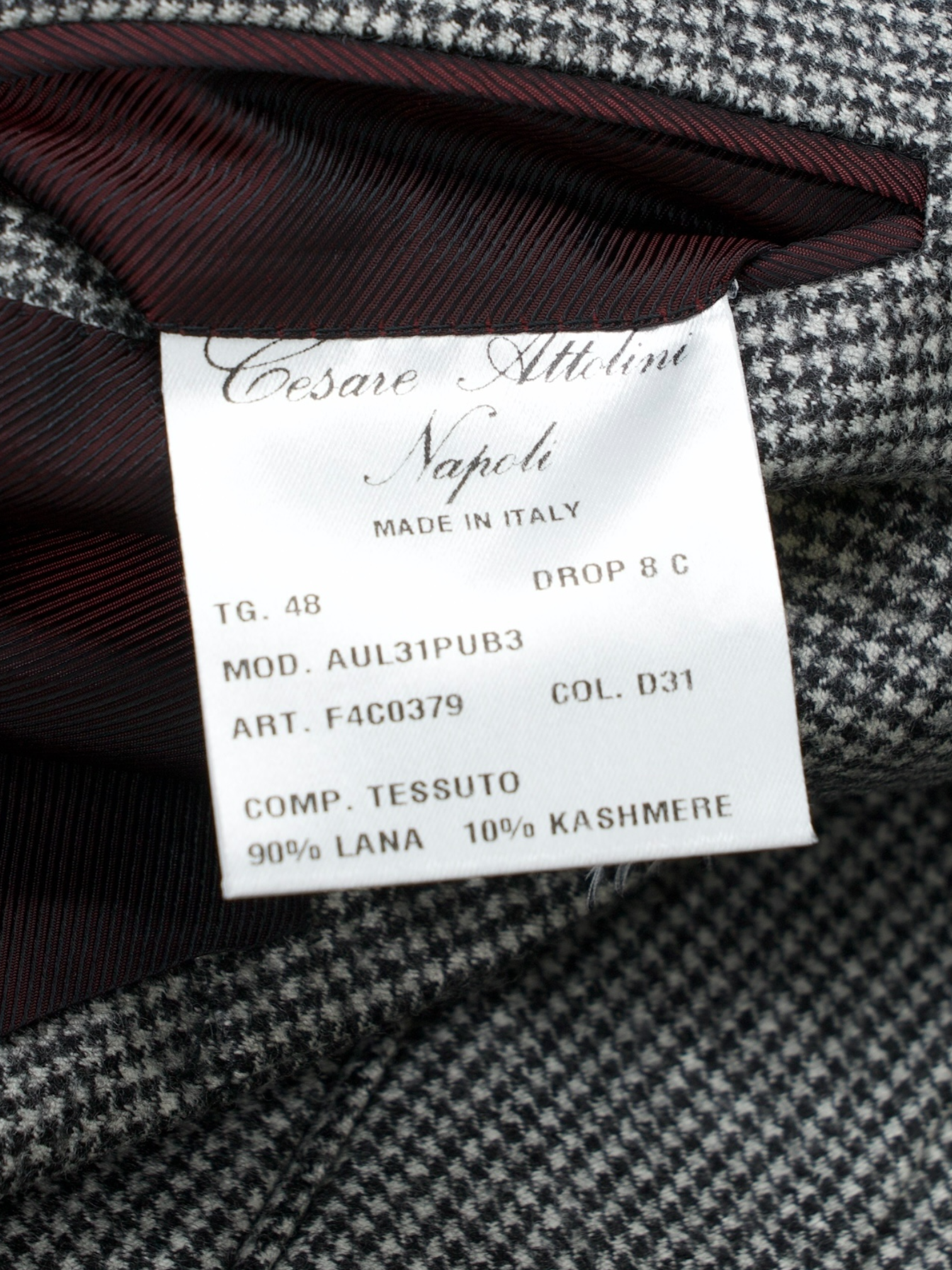 A sartorial treasure: Presenting the Cesare Attolini Black and White Wool & Cashmere Puppytooth Suit: a fusion of luxury and masterful tailoring. Crafted from a premium wool and cashmere blend, this suit showcases a timeless puppytooth pattern. With Cesare Attolini's hallmark La Spalla Camicia shoulders and meticulous doppio impuntura pick stitching, it epitomizes Italian elegance. The single vent maintains a sleek silhouette, while the unfinished cuff allows for personalized adjustments. Ideal for the discerning gentleman seeking refined style, this suit is a statement of sophistication.e. Discover the elaborated sartorial details below.